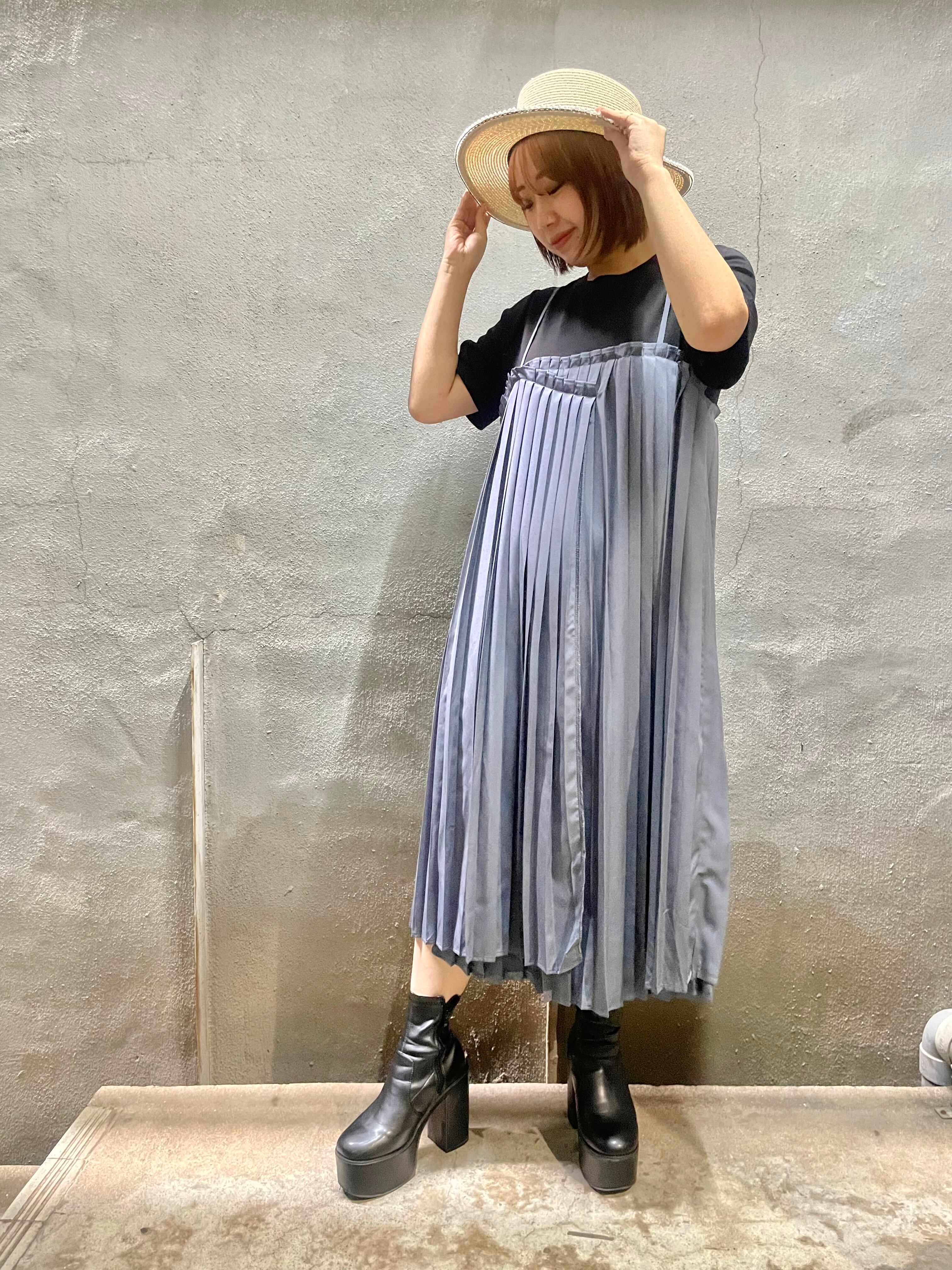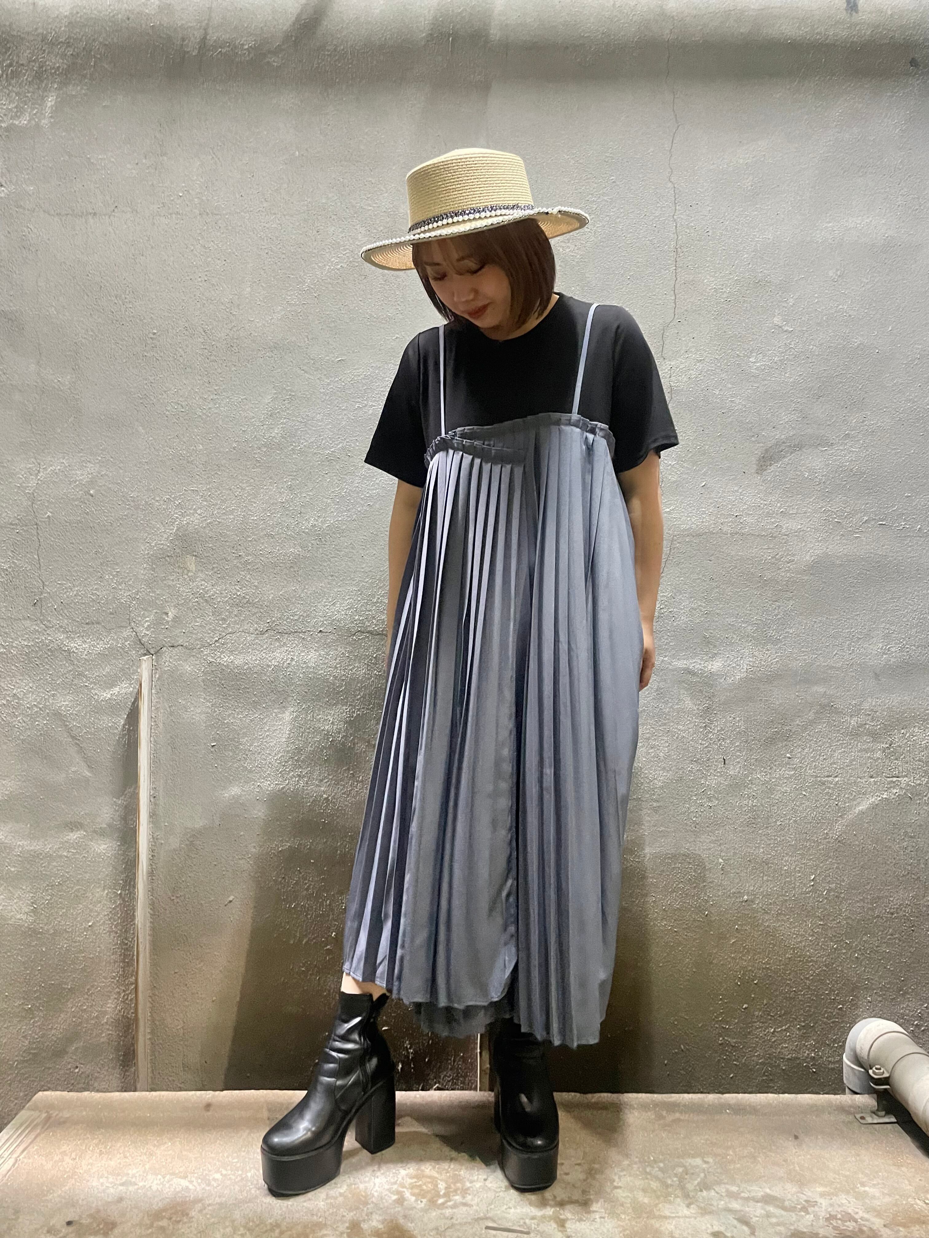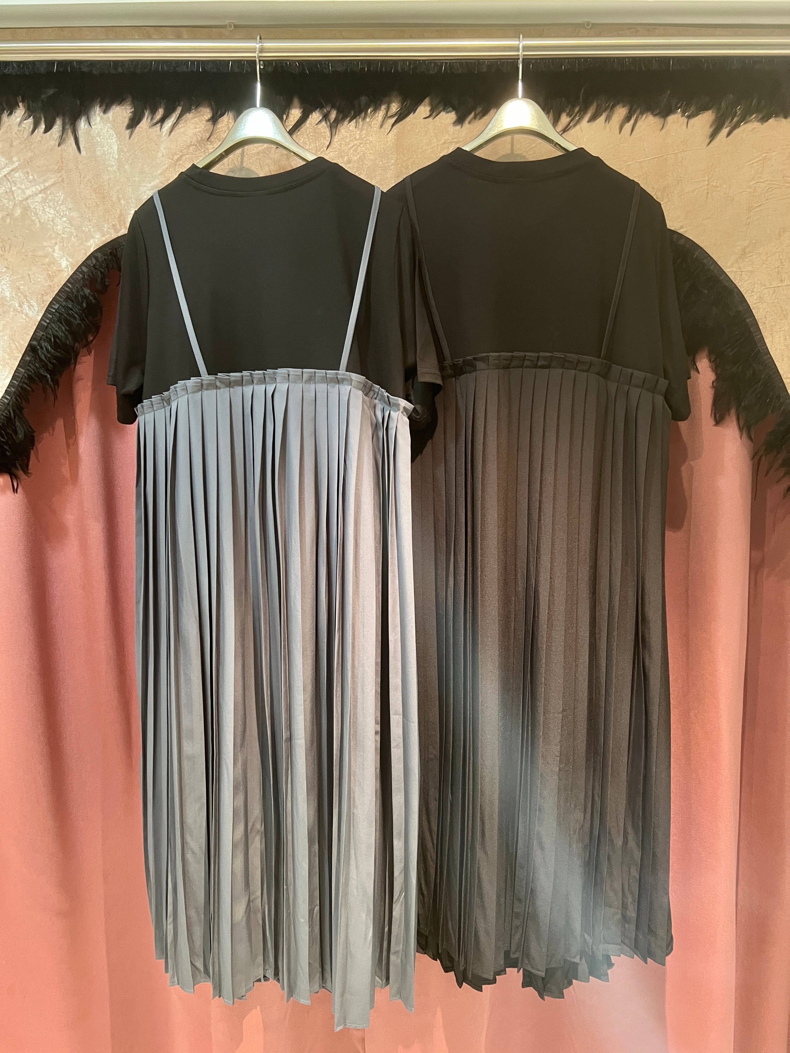 BLACKカラーのTシャツに、プリーツのキャミワンピースが