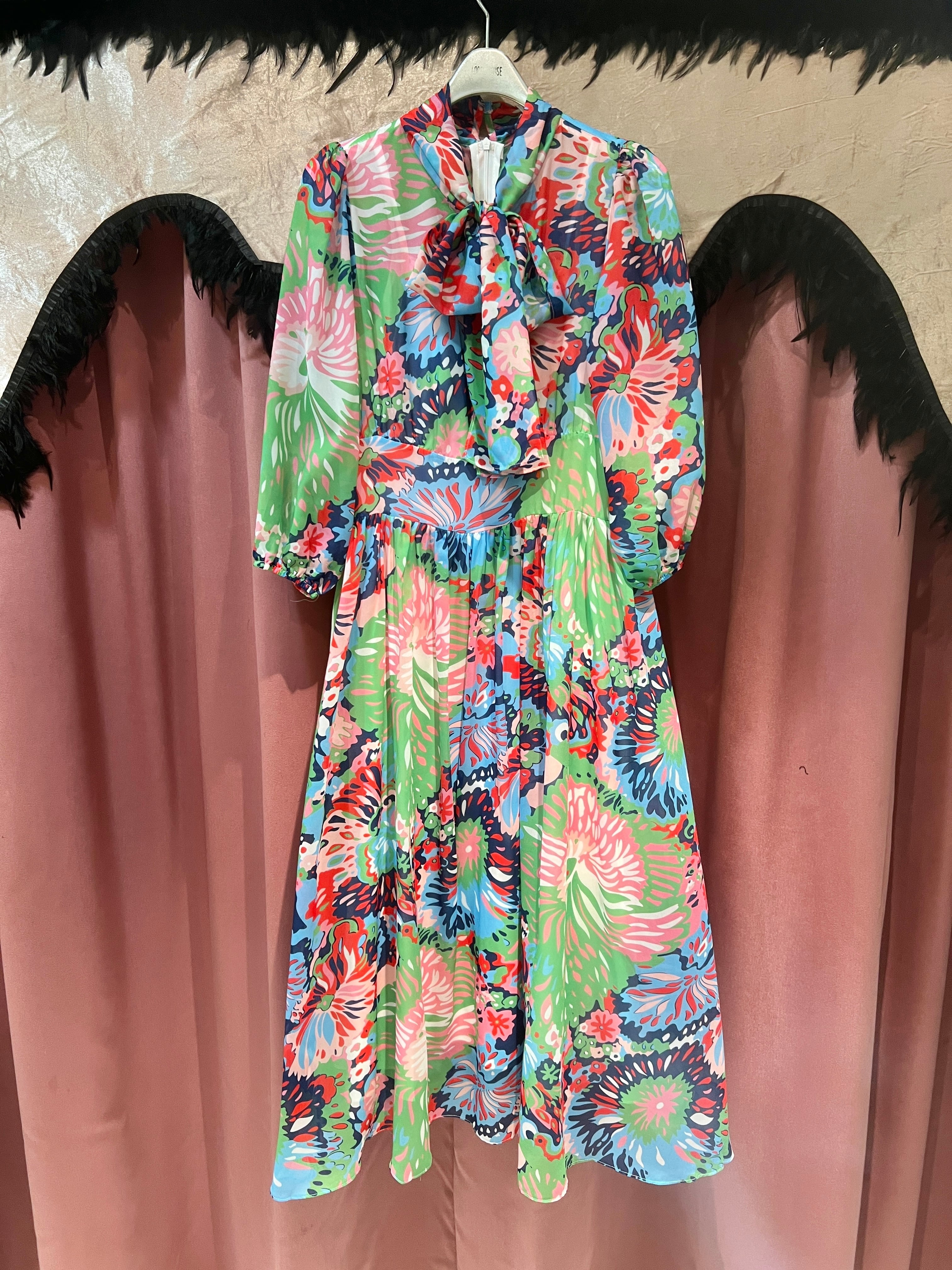 colorful chiffon bow-tie ribbon design one-piece ワンピース ワンピ カラフル プリント 柄ワンピ ボウタイ リボン