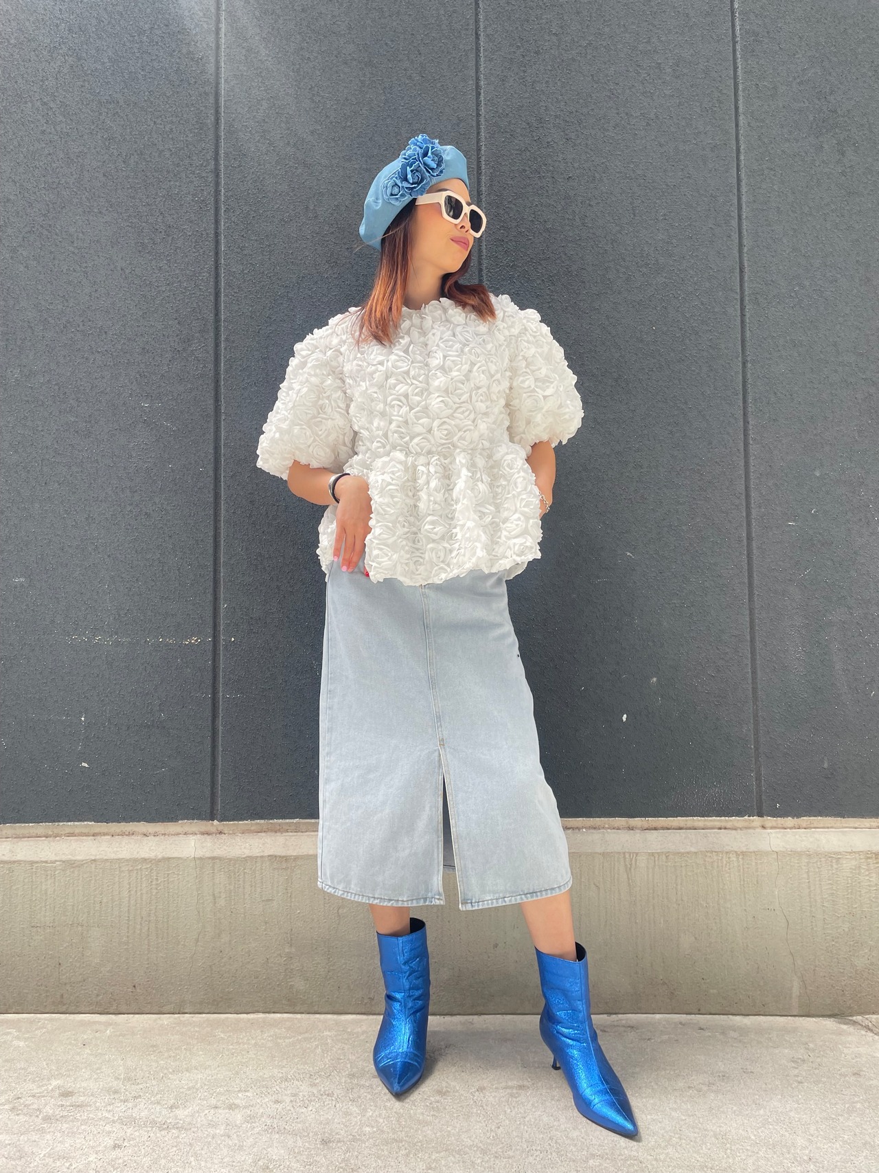 立体的な花のデザインとギャザー入りのバルーンスリーブが特徴のデザイントップス♡