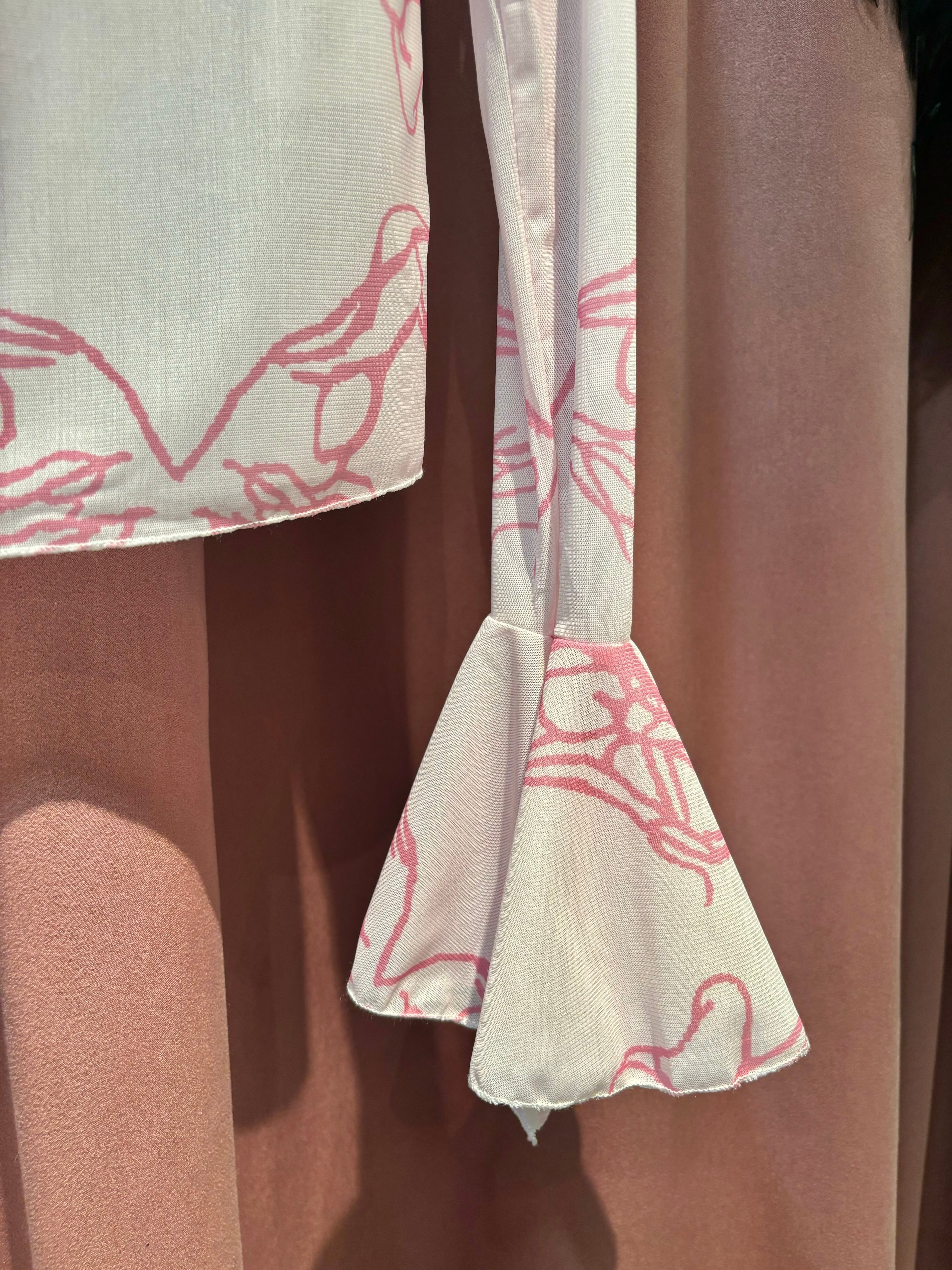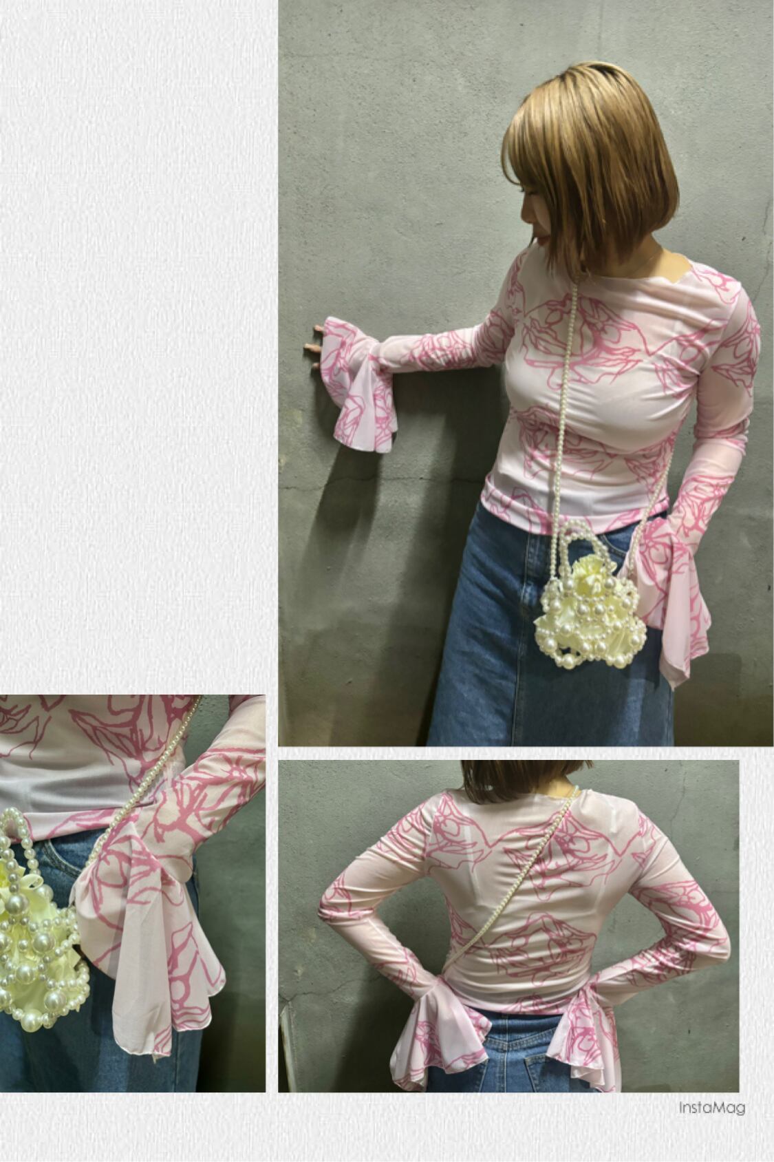 stretcmesh print flare sleeve design tops トップス メッシュ ストレッチ フレア ピンク プリント 重ね着