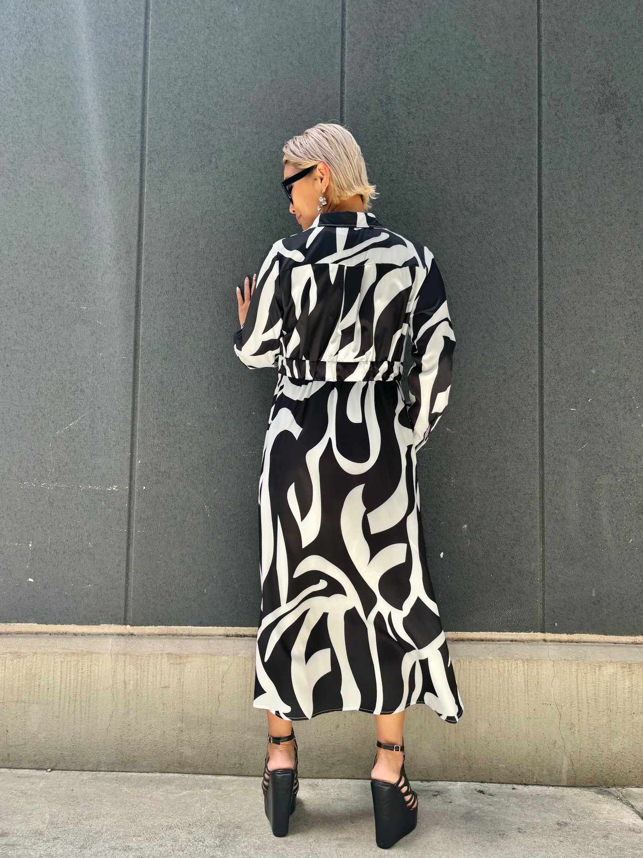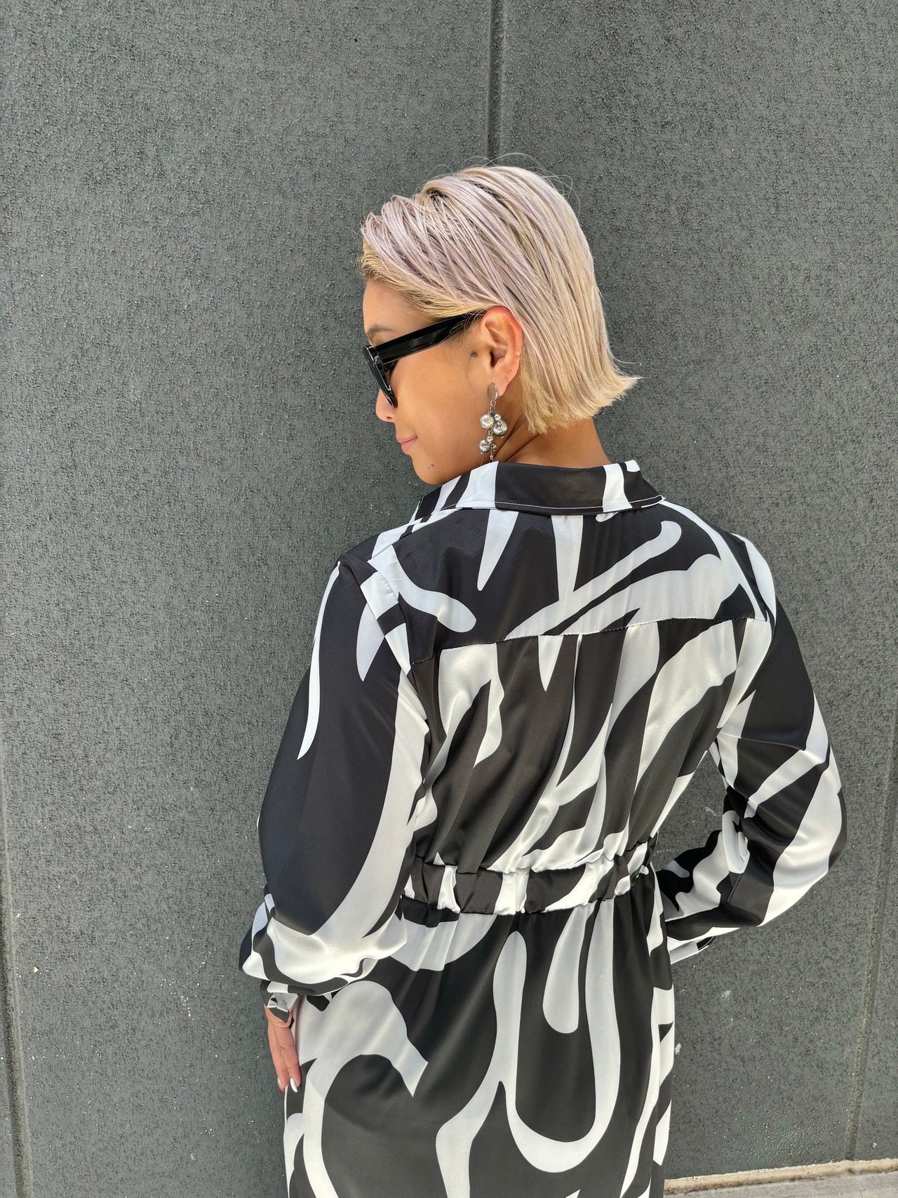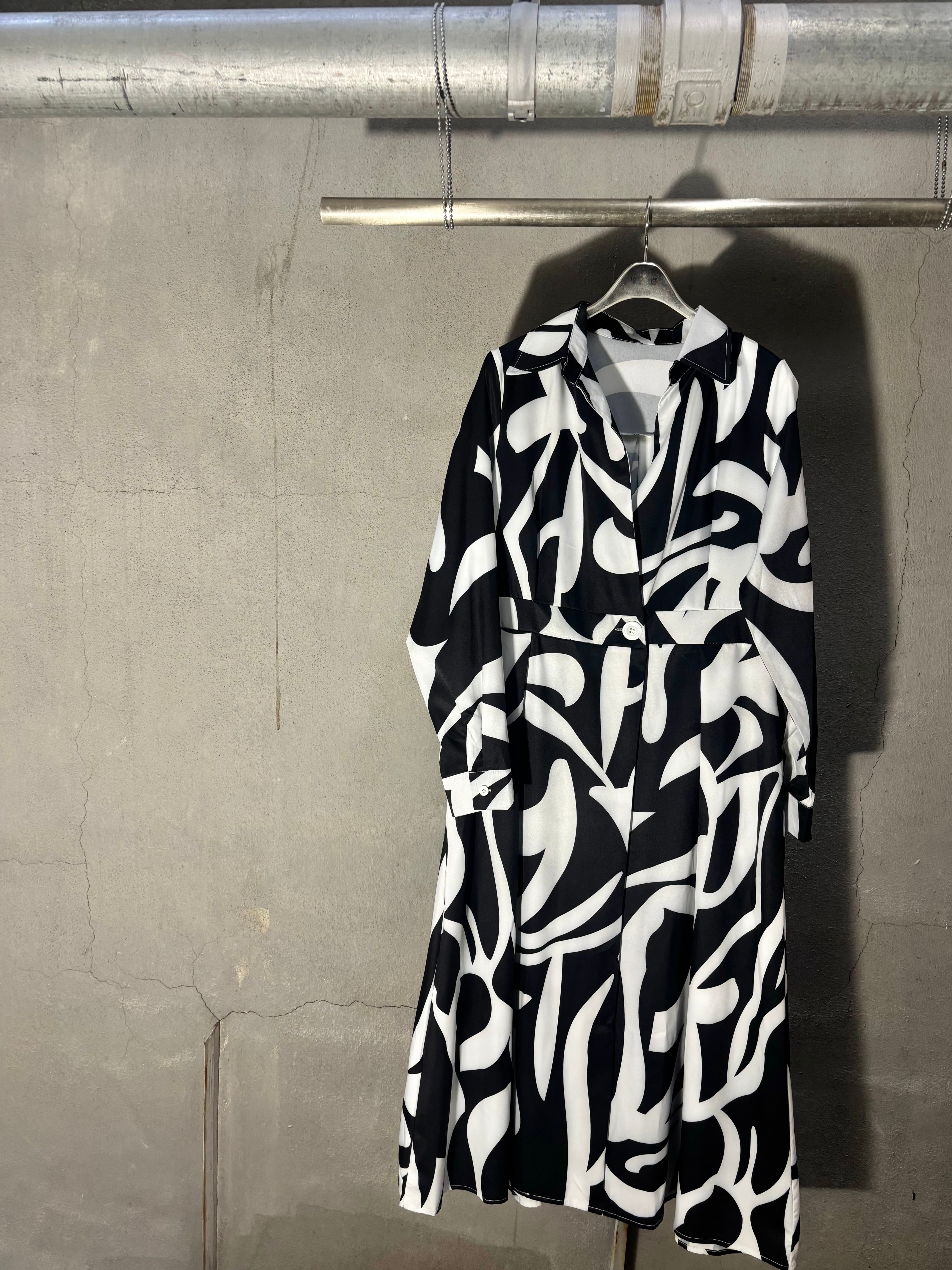 bi-color print 1button V-neck one-piece ワンピース カシュクール風 襟付き バイカラー 白黒 きれいめ