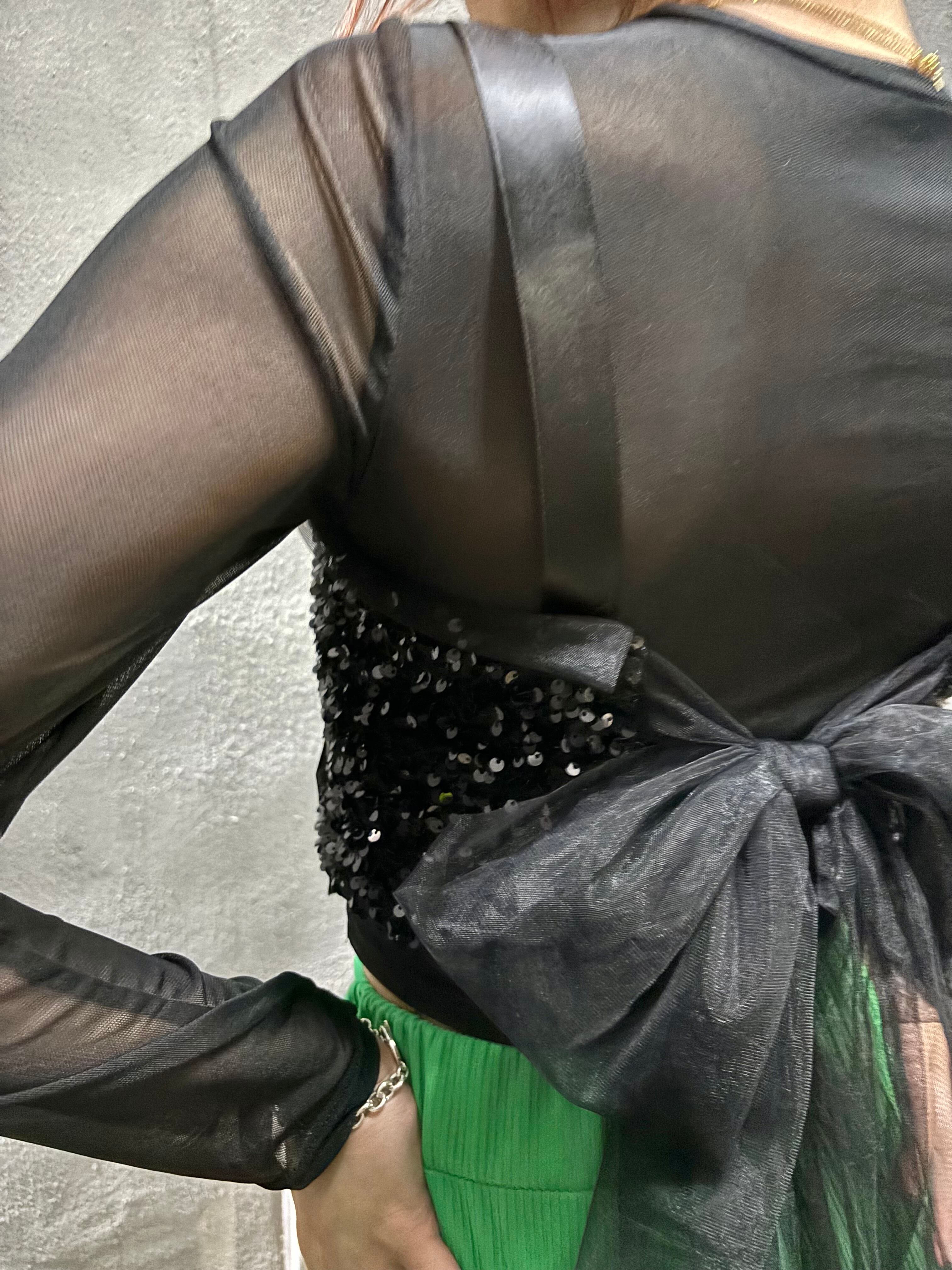 spangle × tulle ribbon design camisole キャミソール スパンコール チュール リボン 重ね着 ブラック 黒