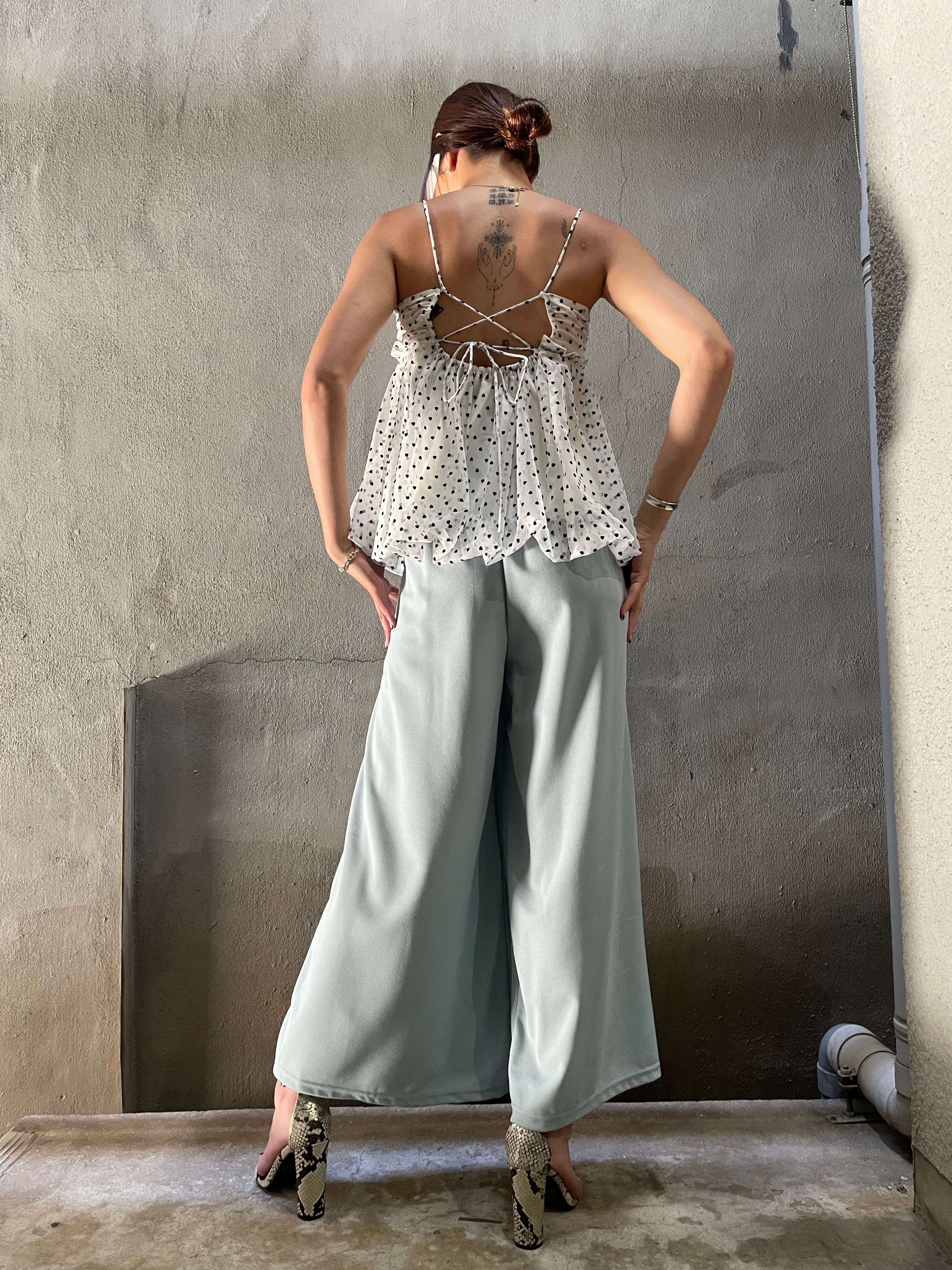 広がるフレアーデザインが美シルエットなデザインパンツ。
