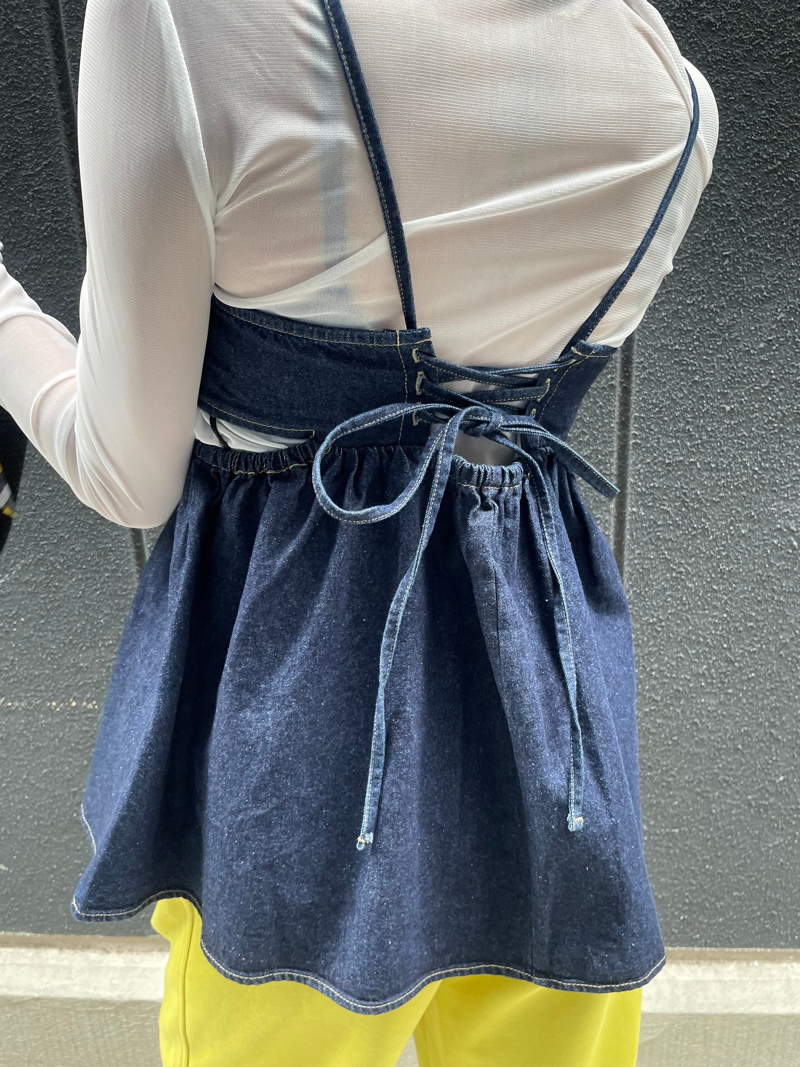 シンプルなデニム素材に、背中のレースアップデザインがアクセントを添えます♪