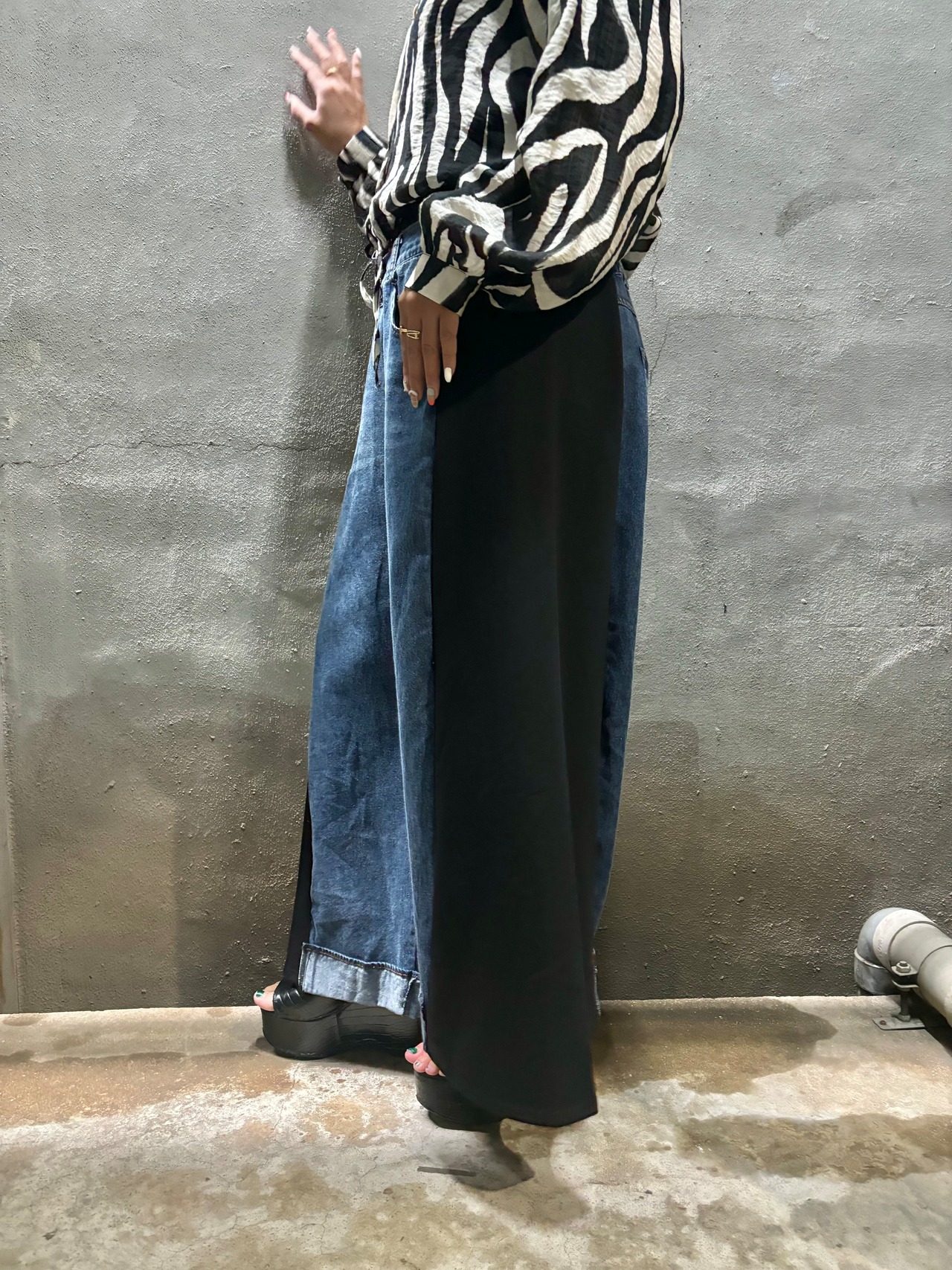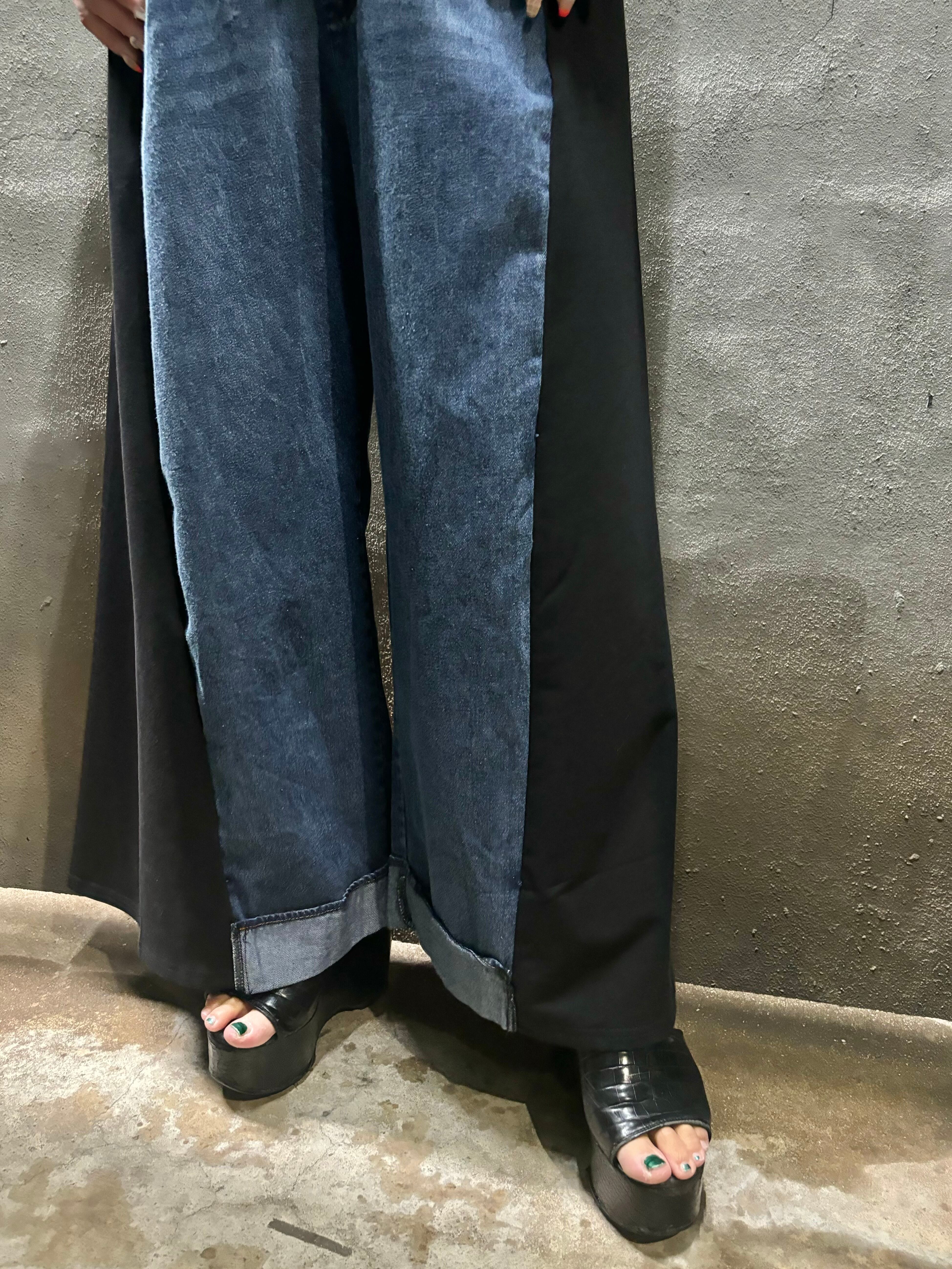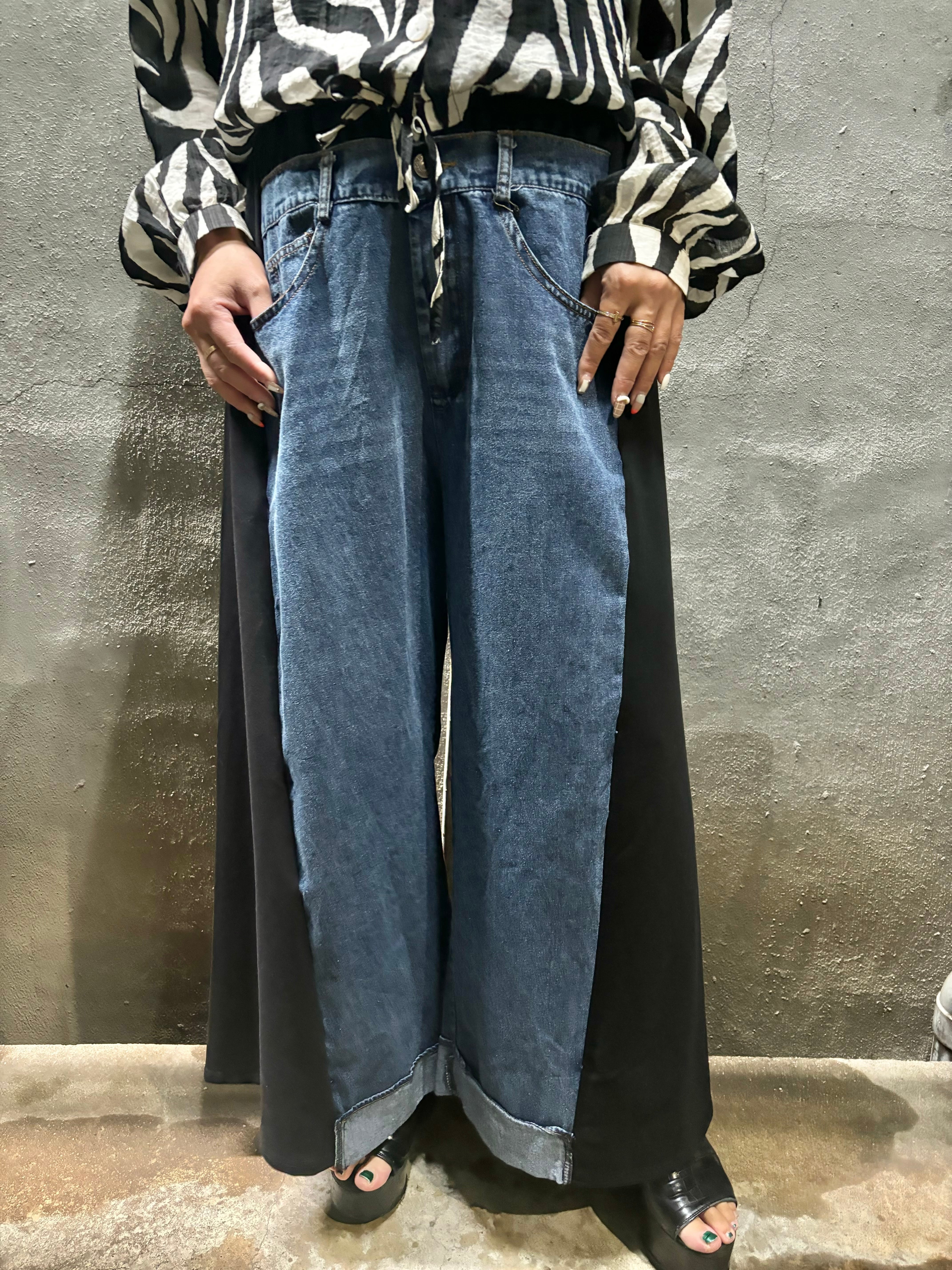 デニムと異素材の切り替えデザインが個性的なパンツ!