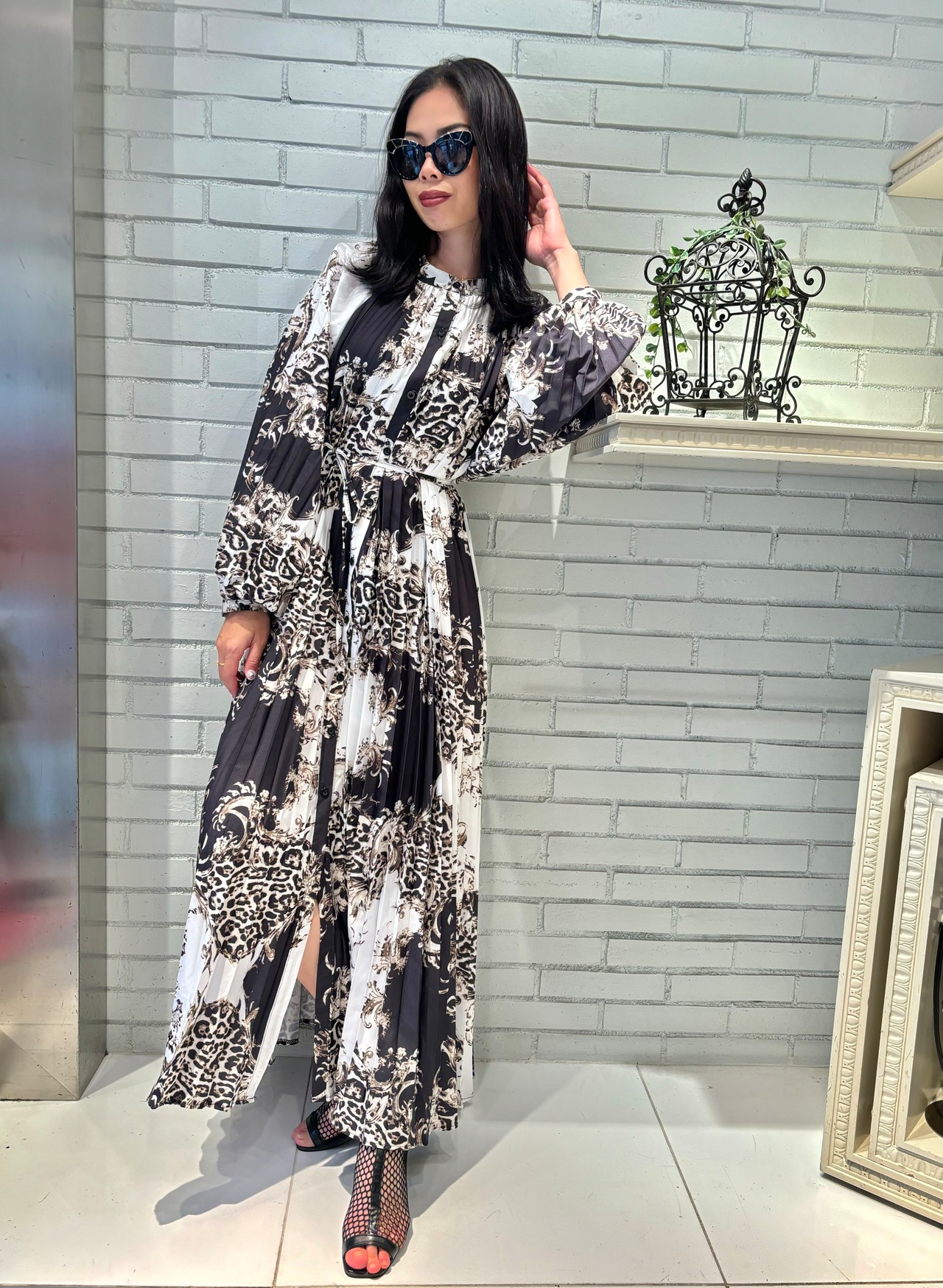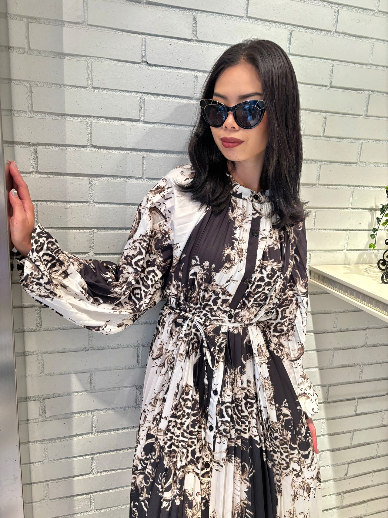 volume pleats animal print long one-piece ワンピース ワンピ プリーツ アニマル リボンベルト