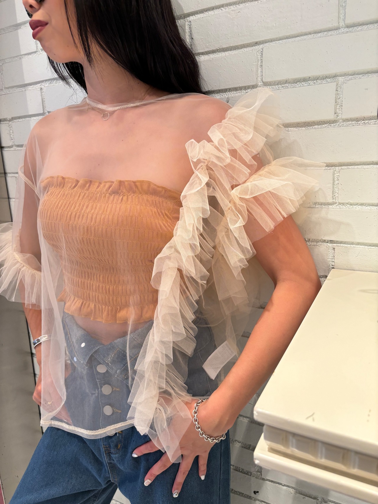 チュールメッシュ素材で作られたトップスは、アシンメトリーなフリルが特徴的♡