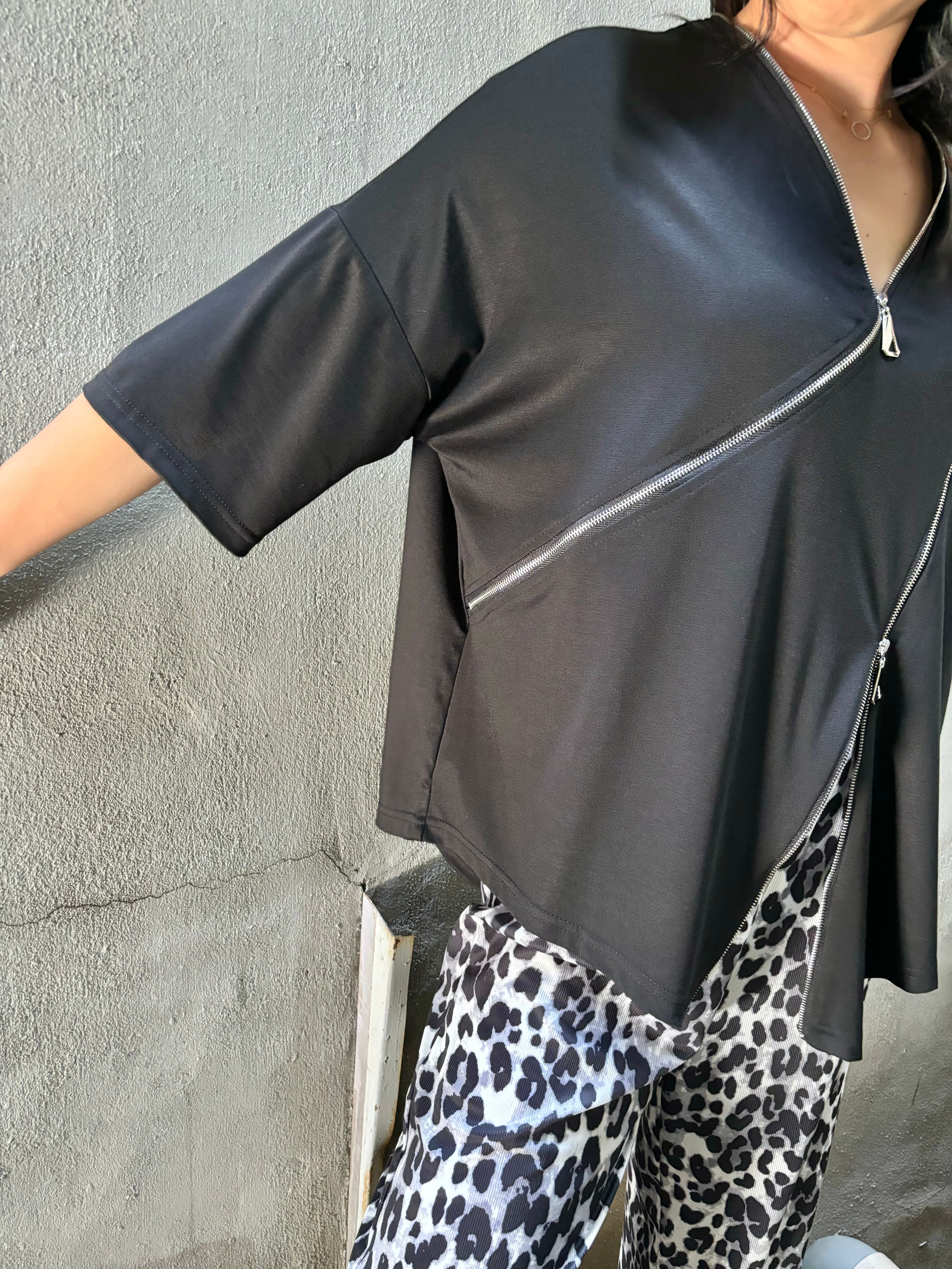シンプルなVネックトップスに、アクセントのジッパーデザインがクール。