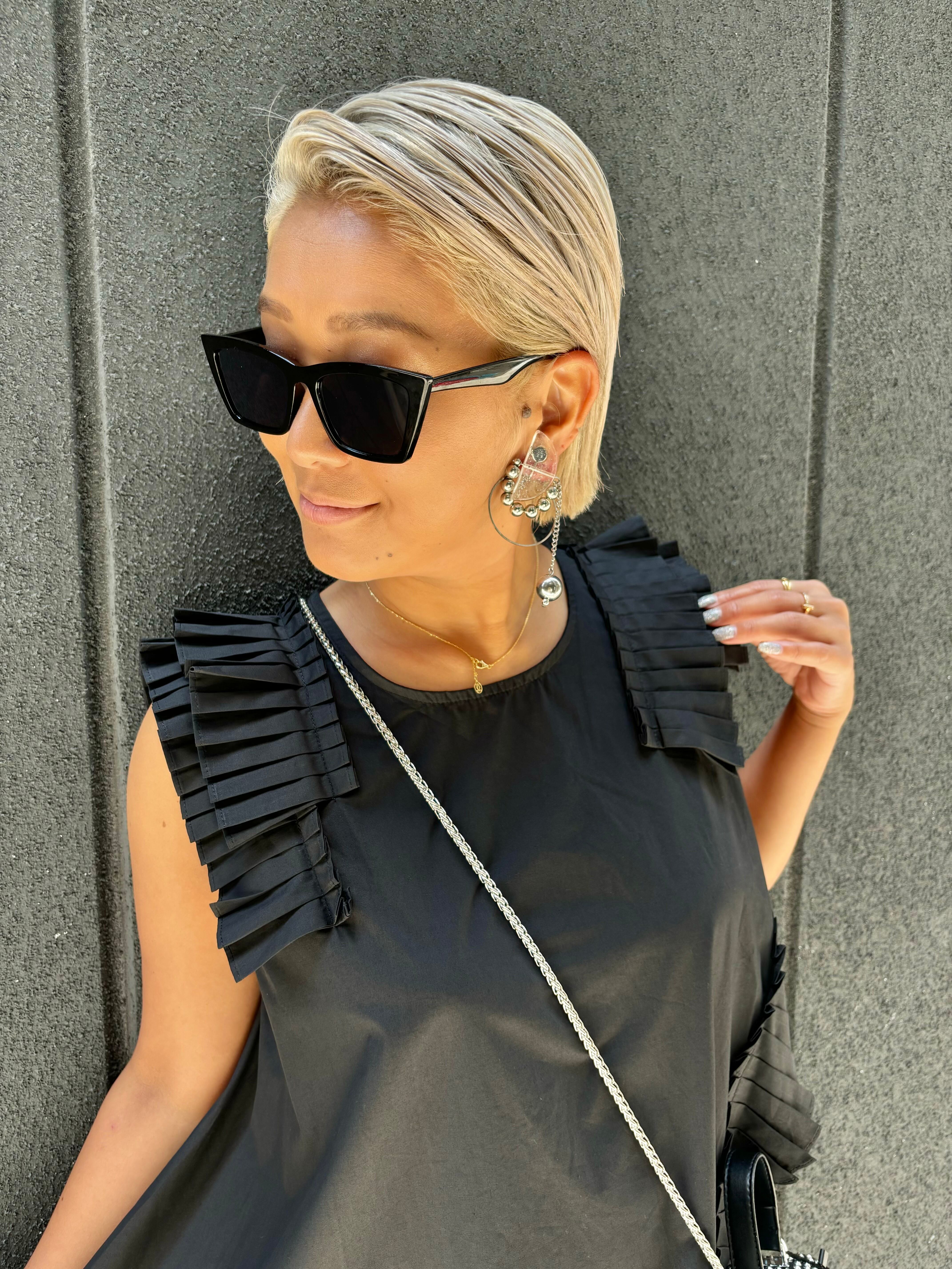 ボディラインを美しく包み込むプリーツトリミングが上品さを引き立ててくれます!