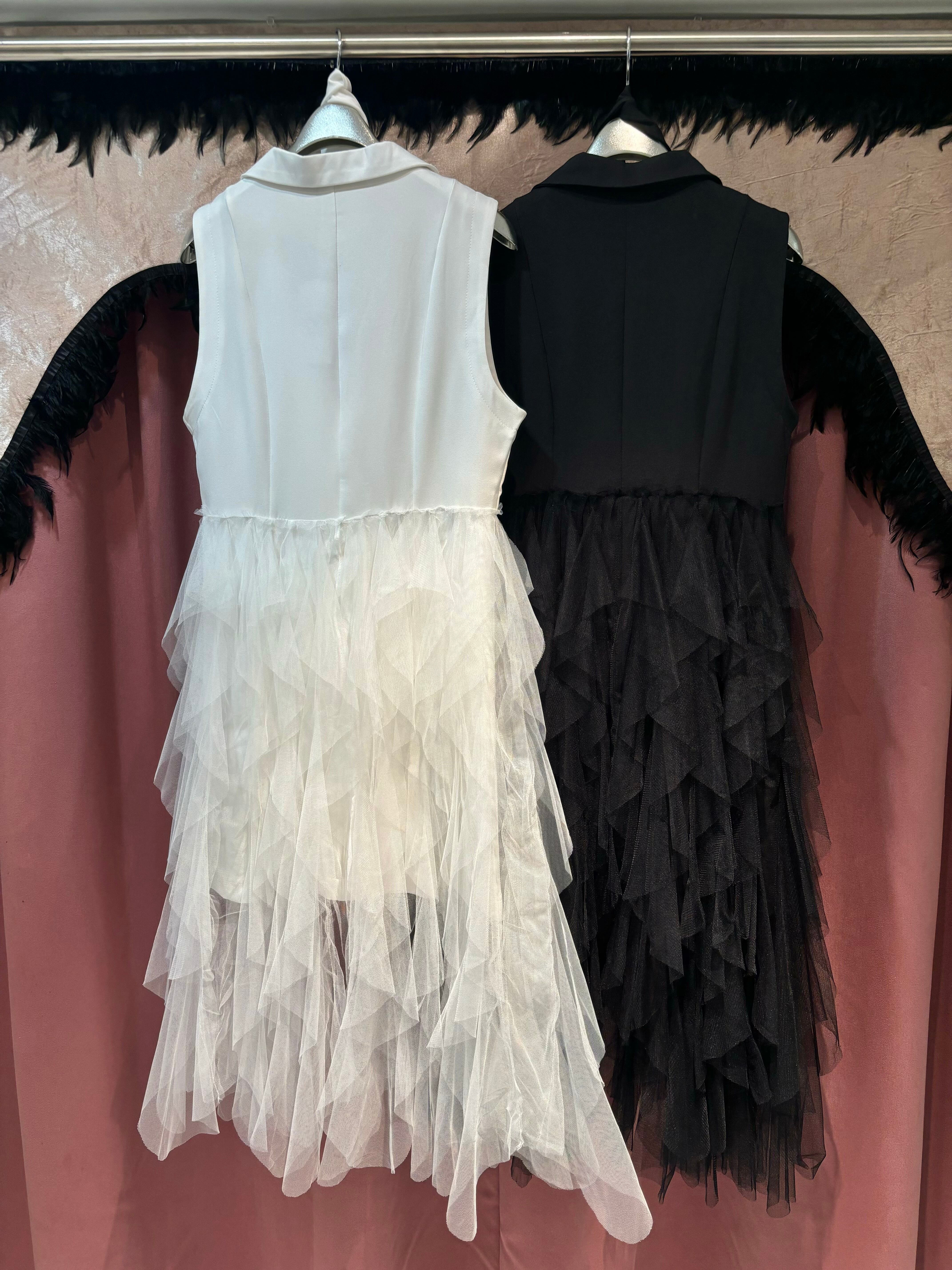 ウエスト部分のリボンで女性らしいシルエットを強調し、透け感のあるチュールで
