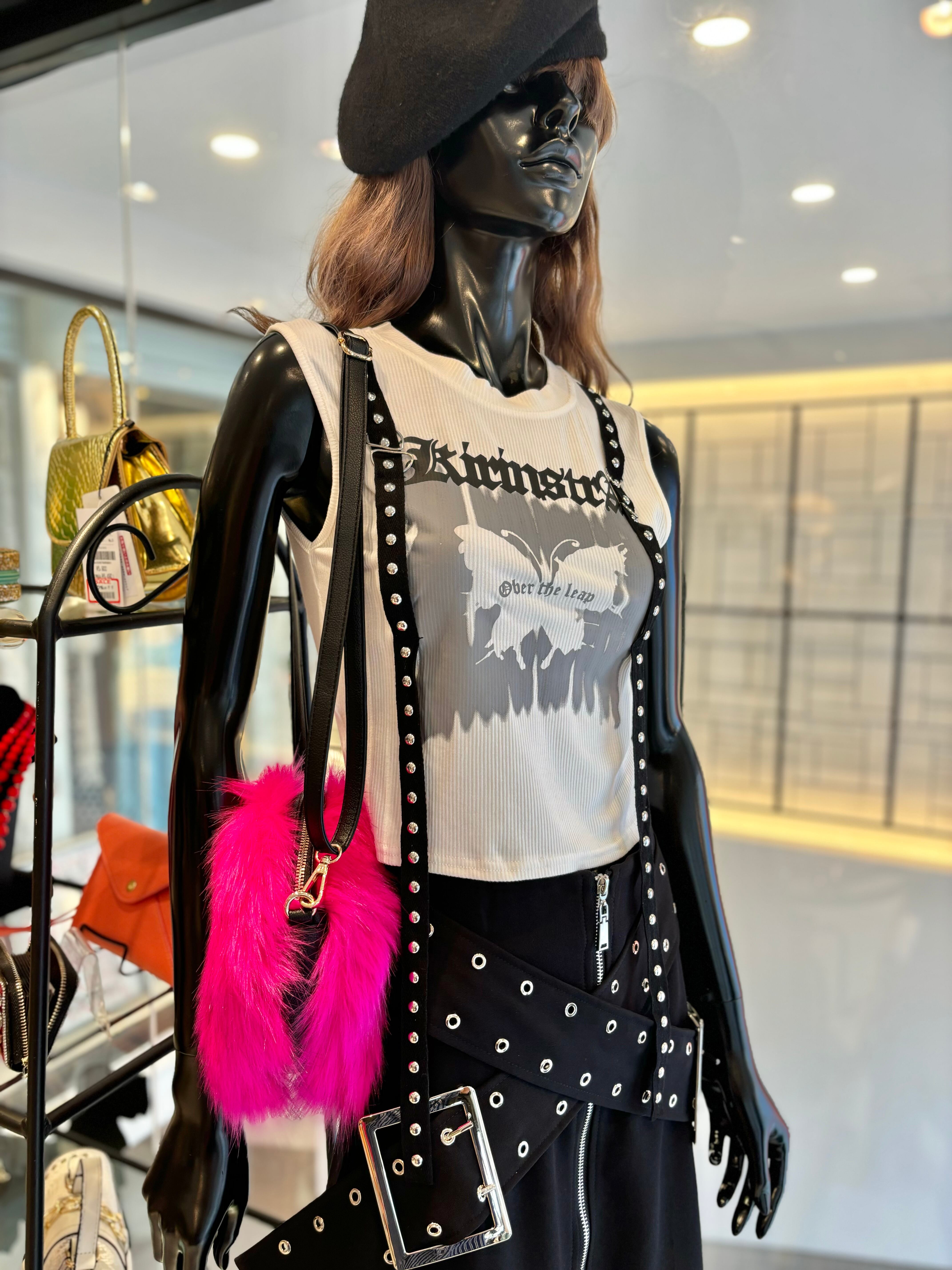 ユニークなスタッズとテーププリントデザインが個性を引き立て、どんなコーディネートにもスパイスを加えることができます。