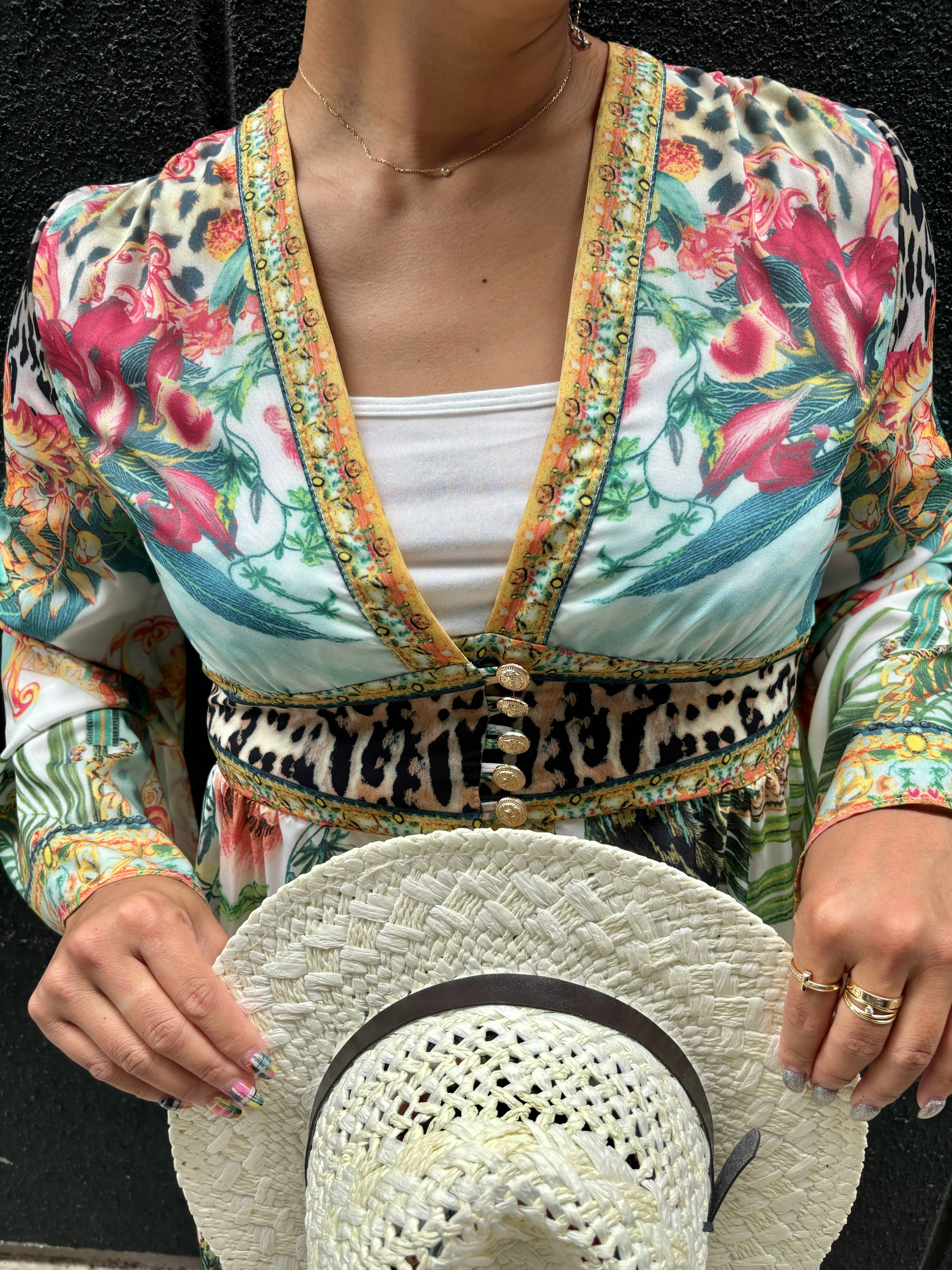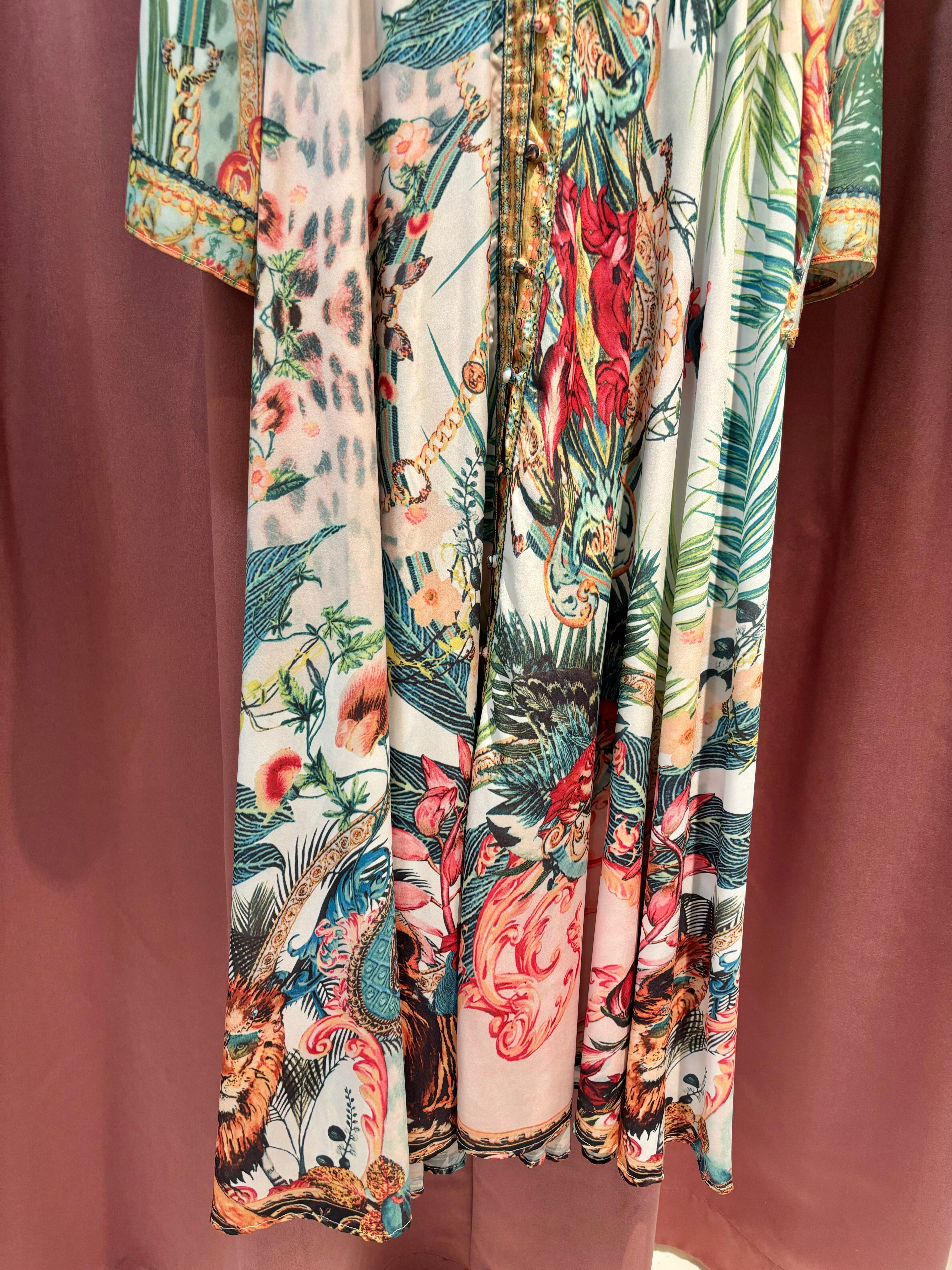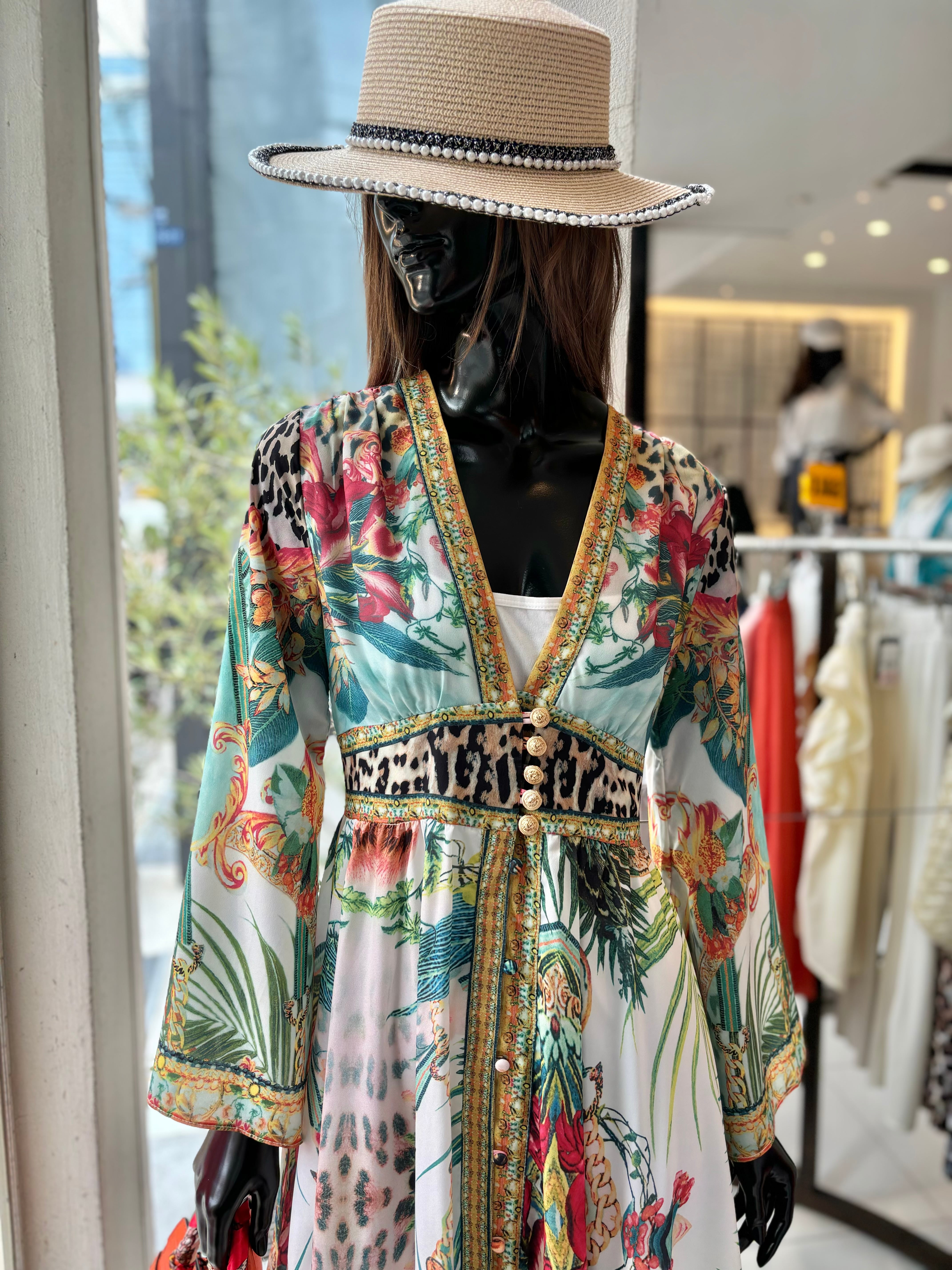 リゾートをイメージさせるトロピカル柄が目を引く、前開きのVネックロングワンピース。