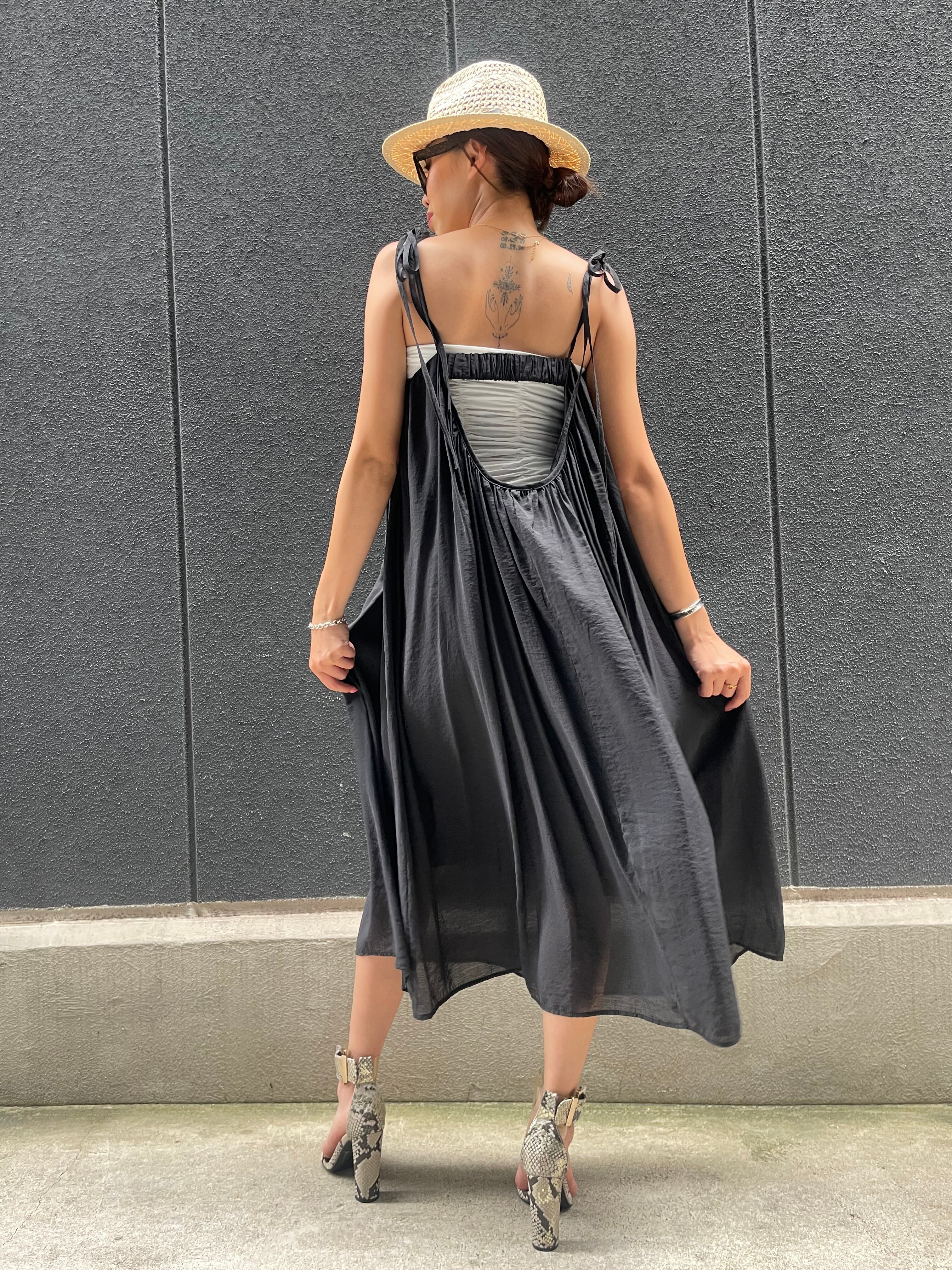 ribbon strap × back open camisole long one-piece ワンピース キャミワンピ ブラック 黒 背中開き 重ね着 薄手 夏