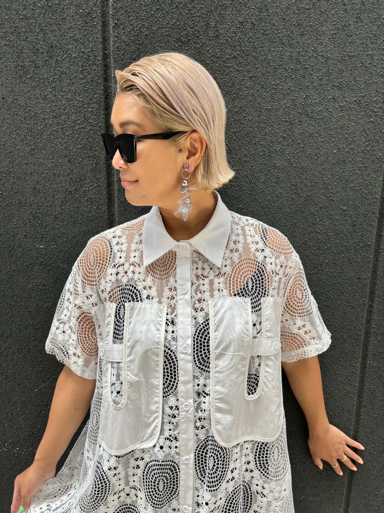 透け感のあるレースがオシャレな一着、グラフィカルレース・シャツワンピース。