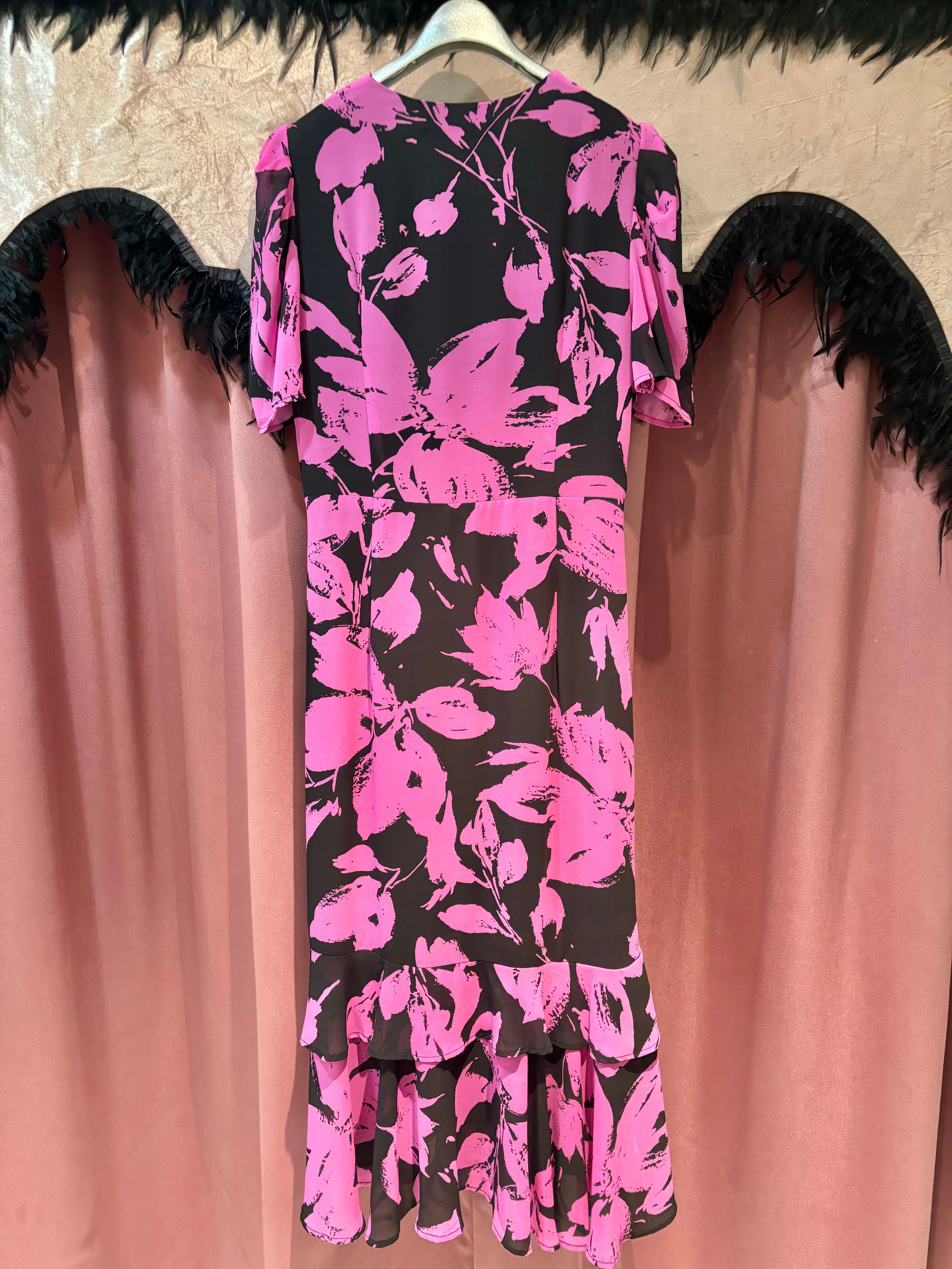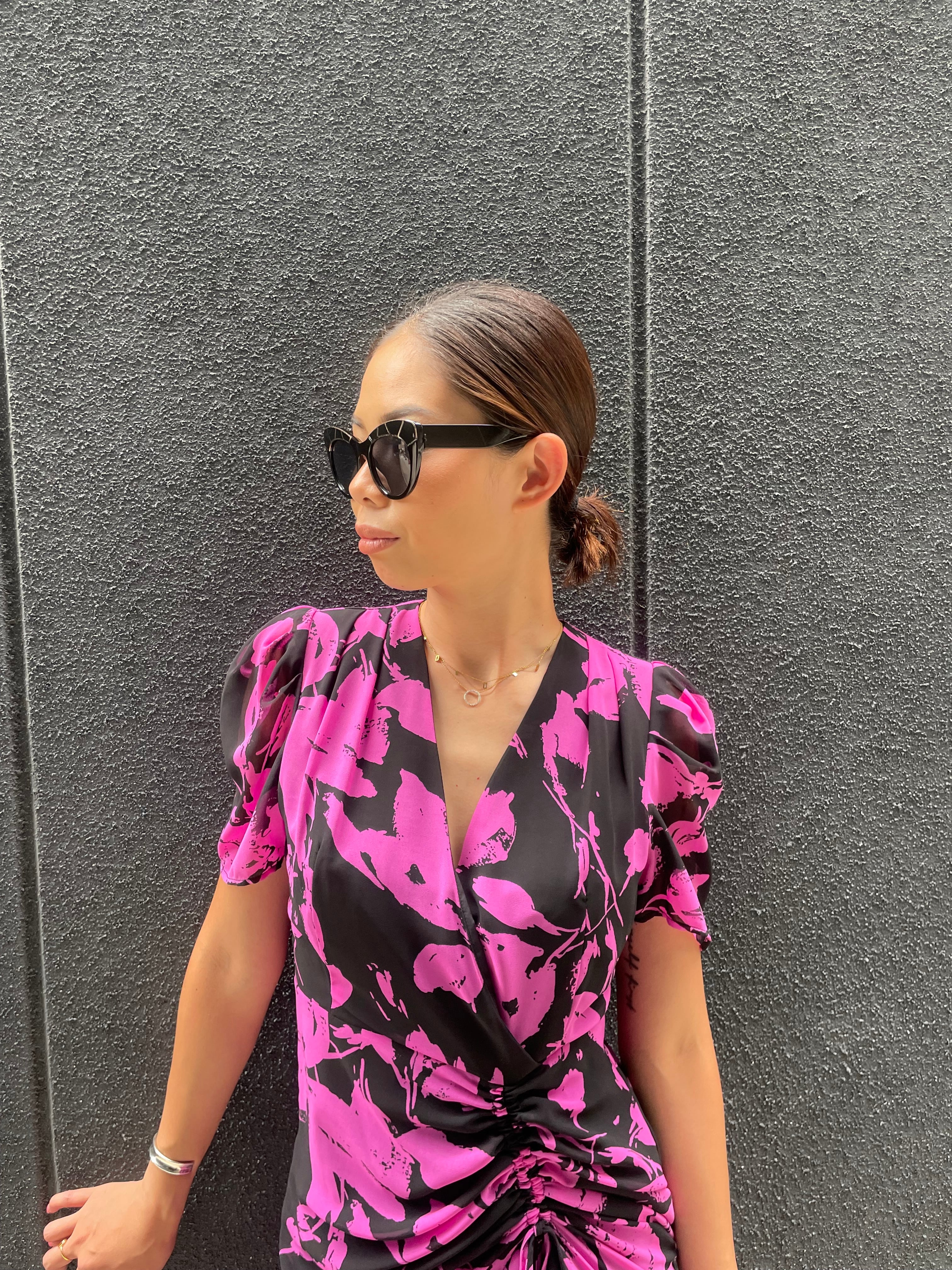 pink × black bi-color print cache-coeur touch design one-piece ワンピース ワンピ ドレス ピンク ブラック カシュクール風 シャーリング
