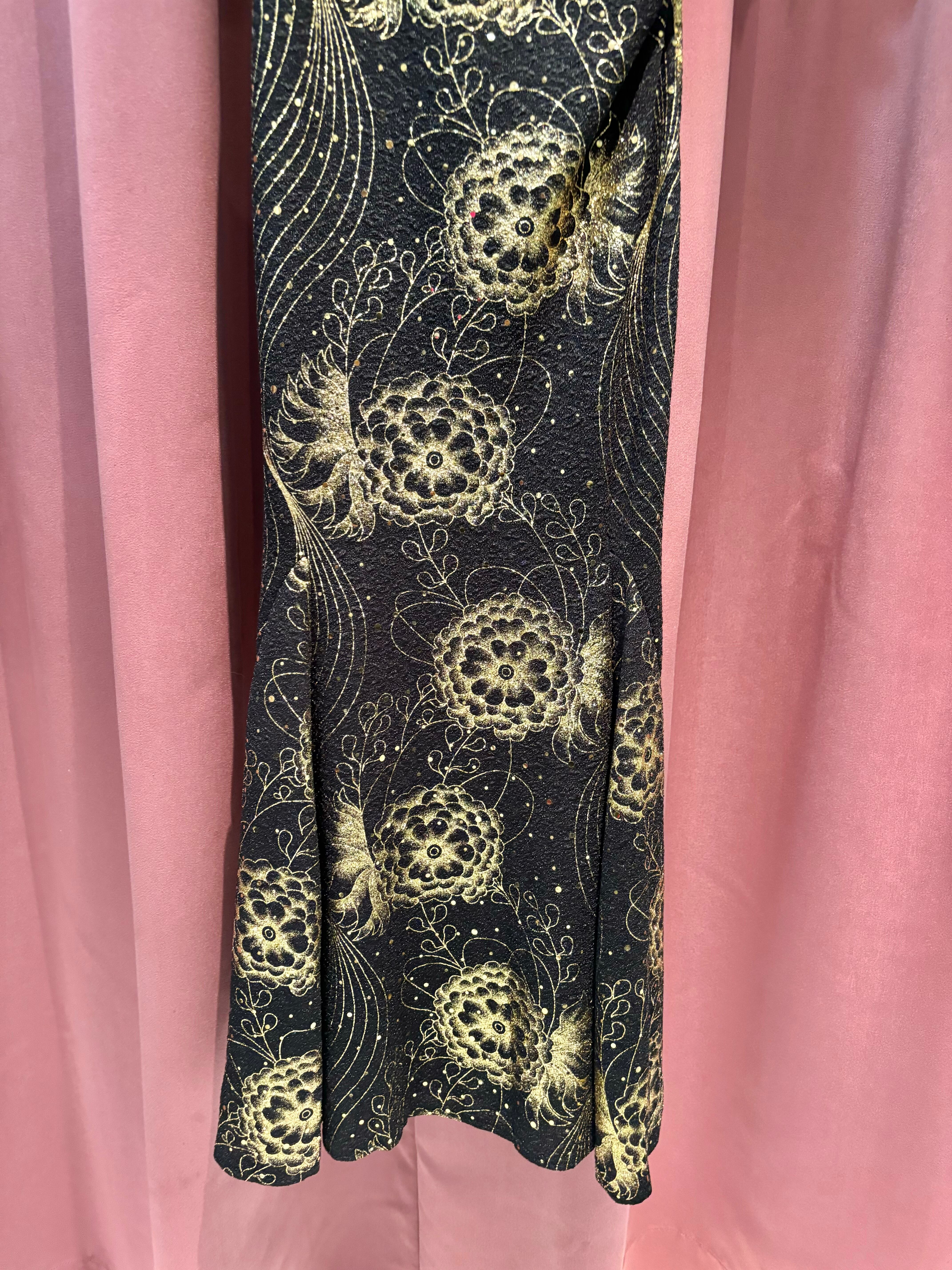 メタリックゴールドのプリントが目を引く、エレガントなワンピース。