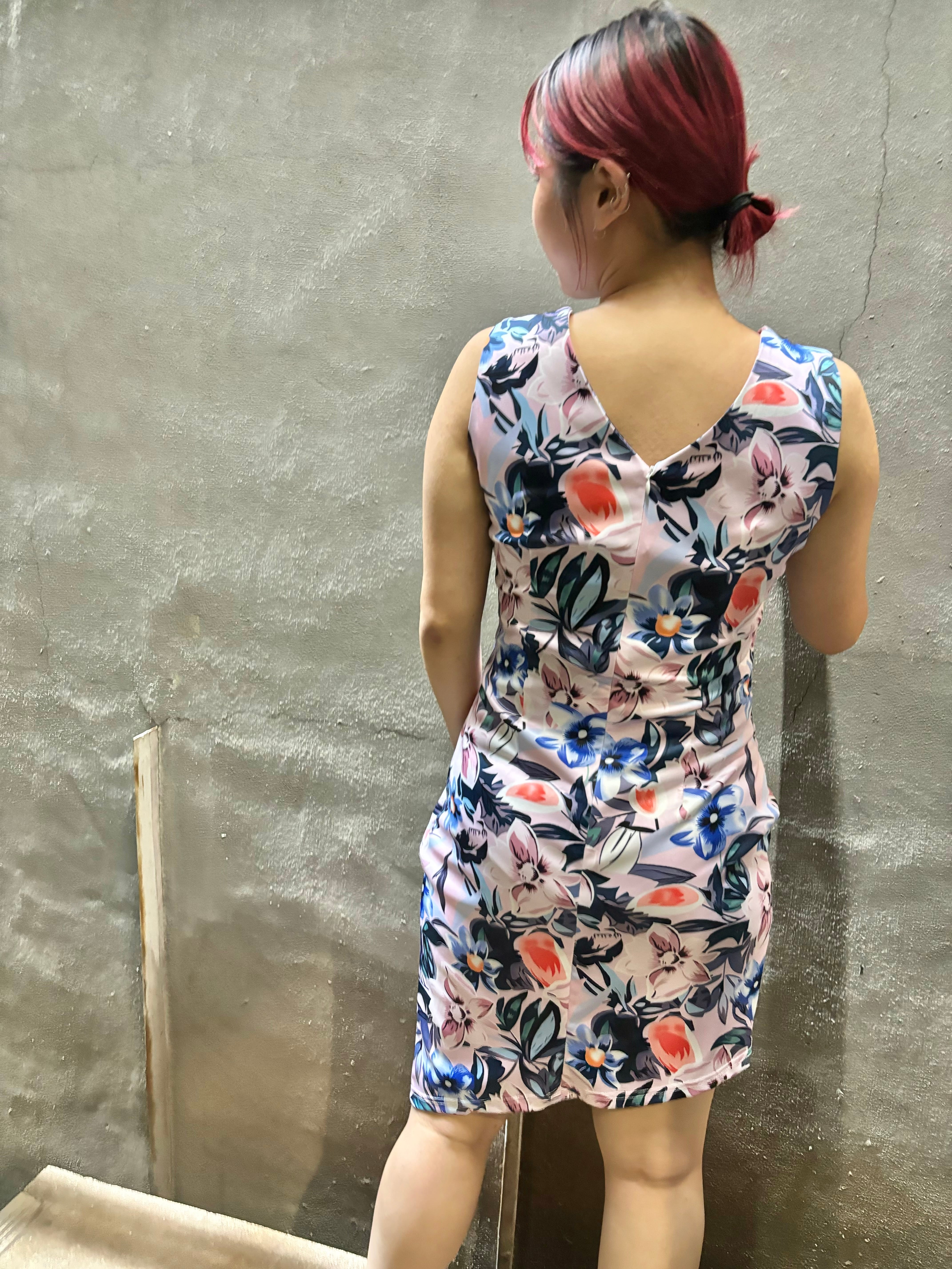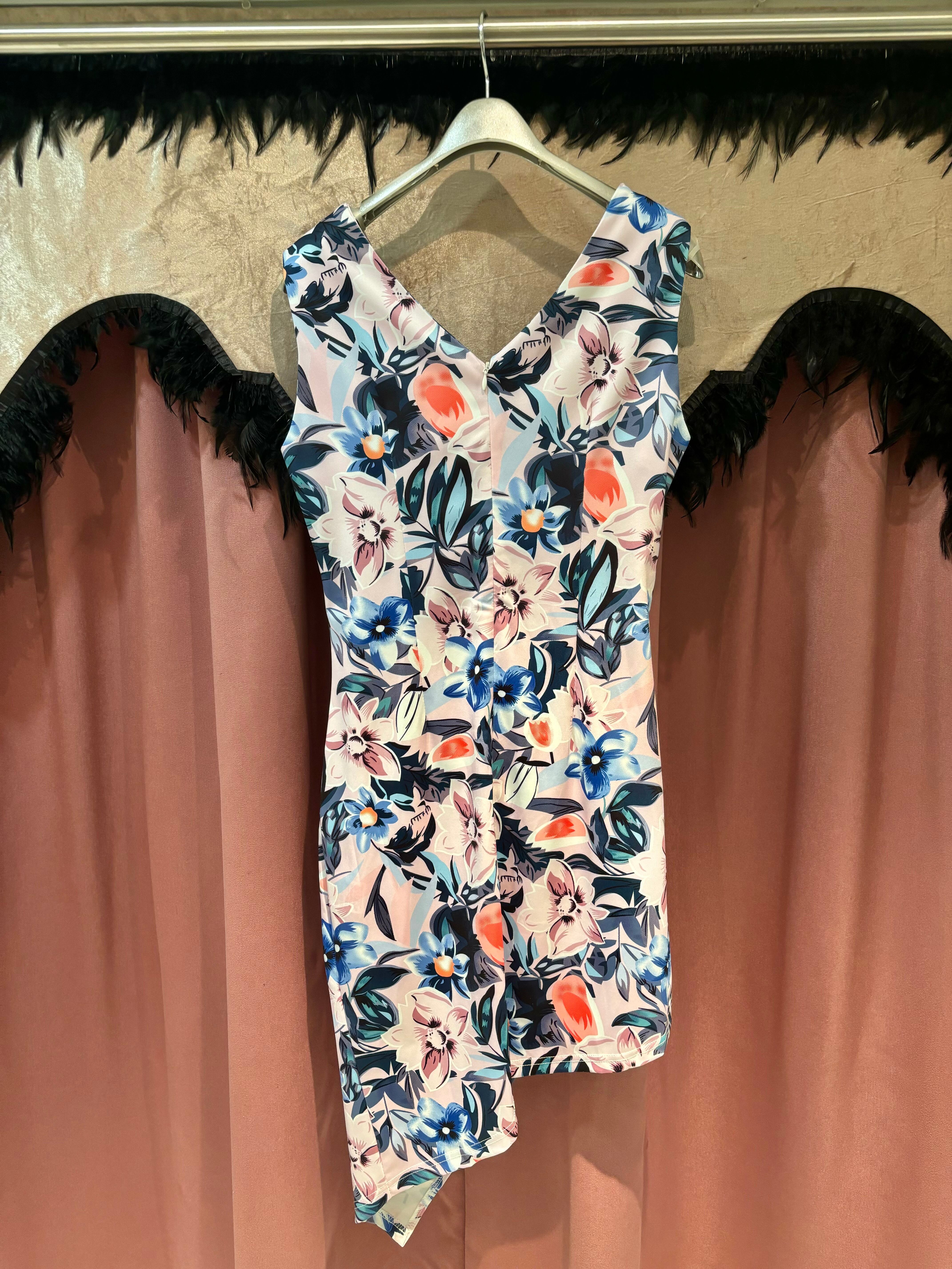 ボタニカル風な花柄プリントが目を惹く、イレギュラーな裾デザイン&カシュクールのミニワンピース。