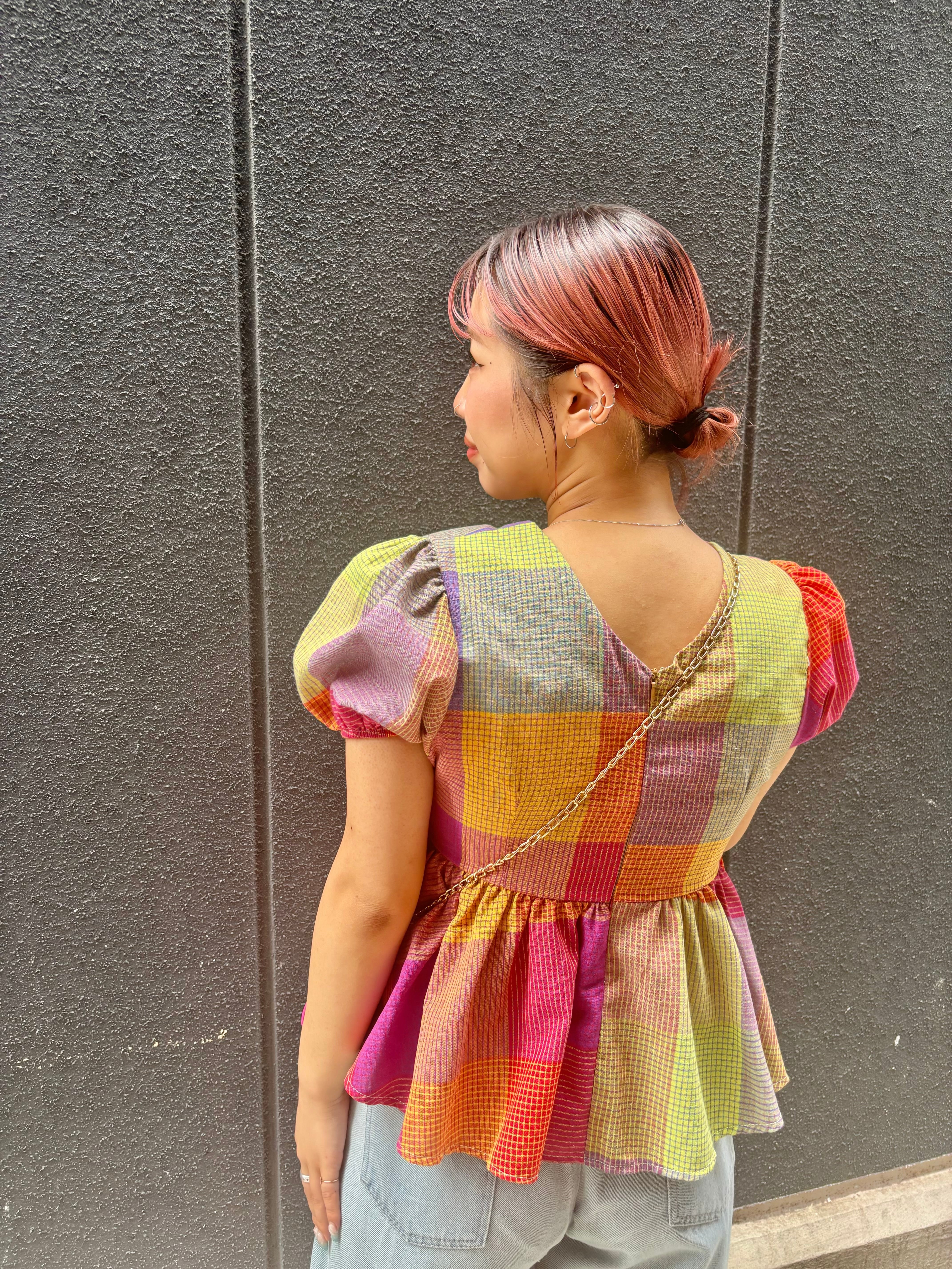 candy check design tops トップス デザイントップス キャンディチェック チェック カラフル パフスリーブ