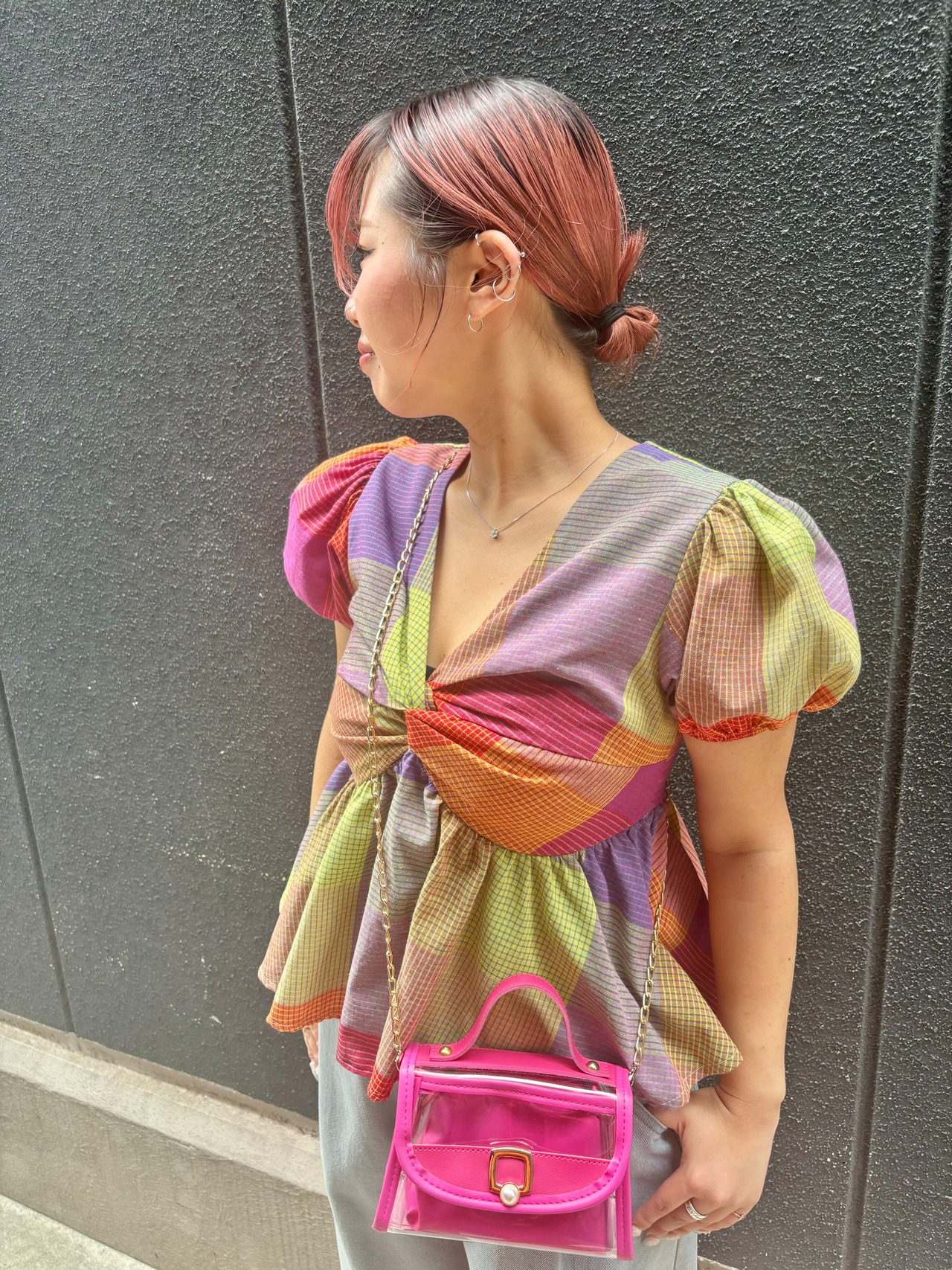 華やかなカラーチェック柄が目を引く、デザイントップス♪
