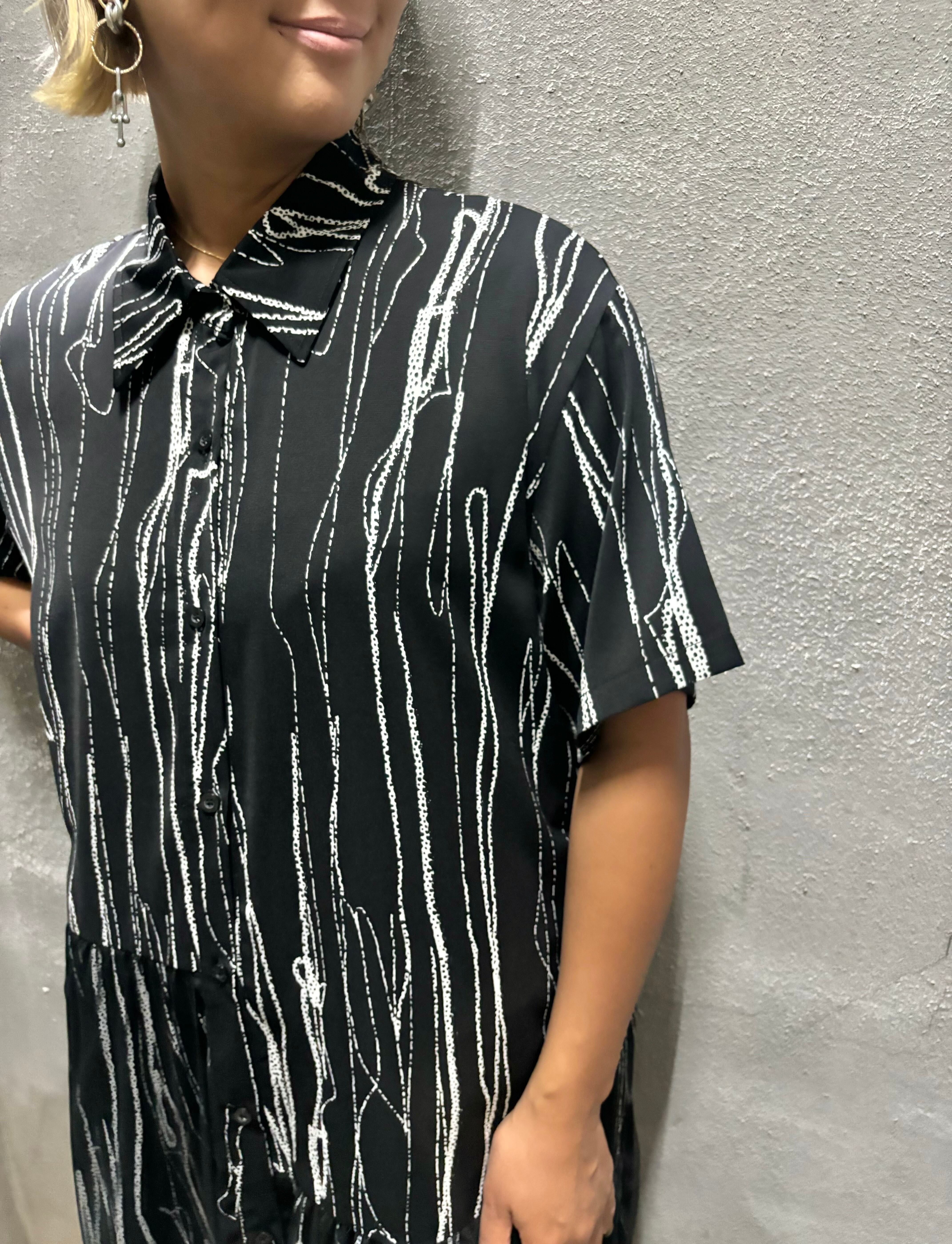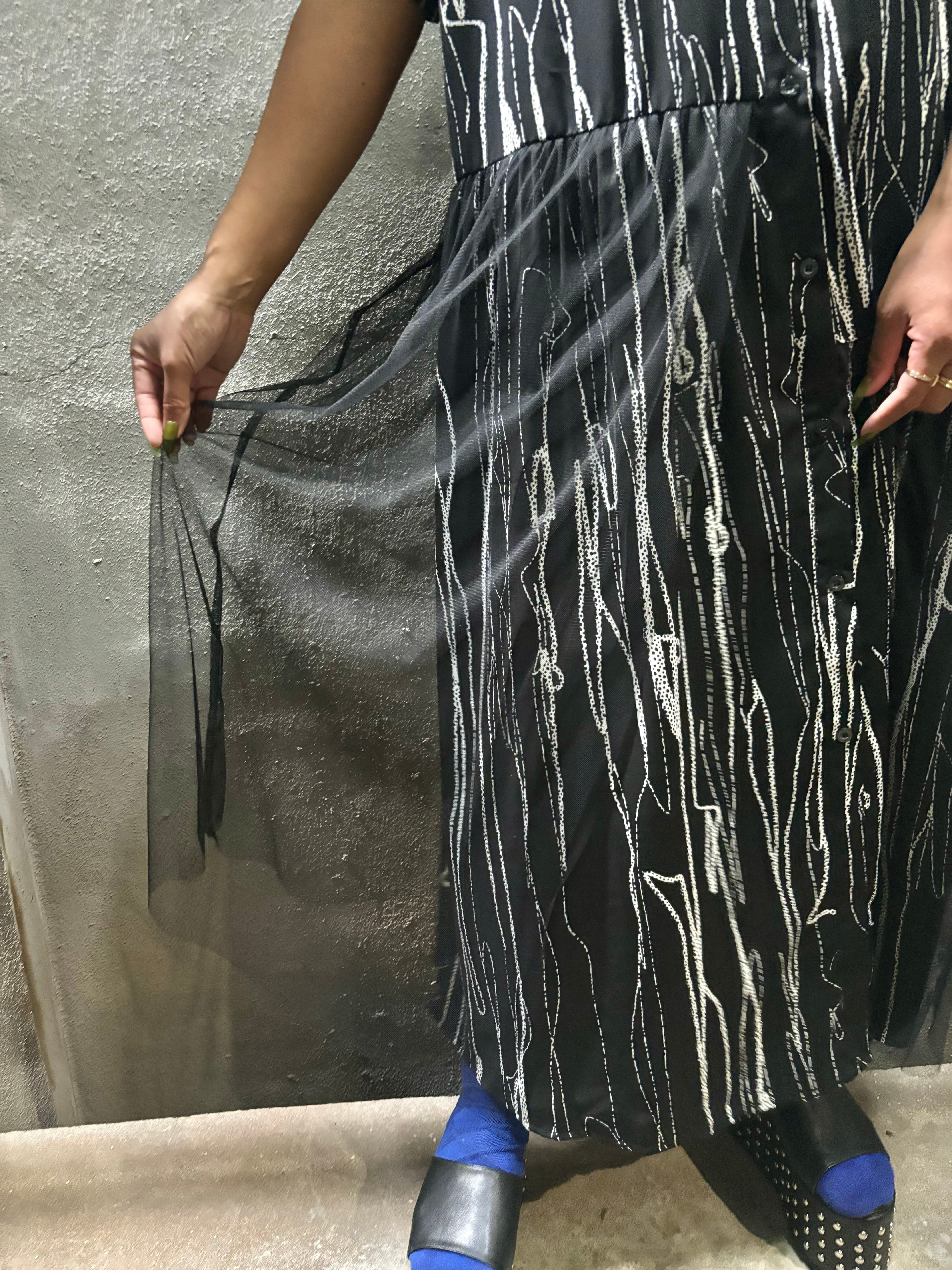 bi-color print tulle mix shirt one-piece ワンピース ワンピ シャツワンピ 白黒 バイカラー チュール 切替デザイン