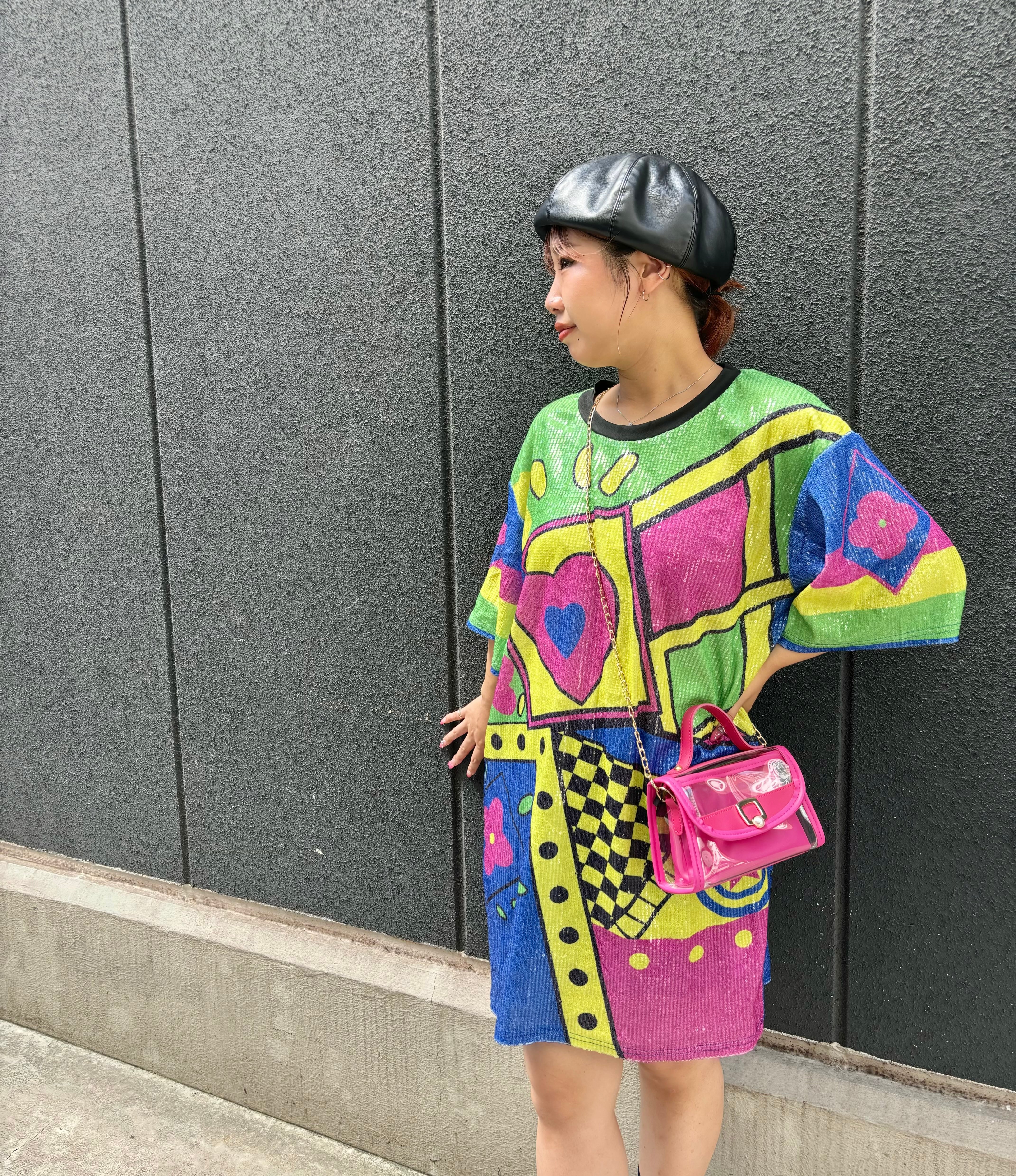 目を奪うスパンコールが輝くカラフルなプリントが特徴のミニワンピース♡