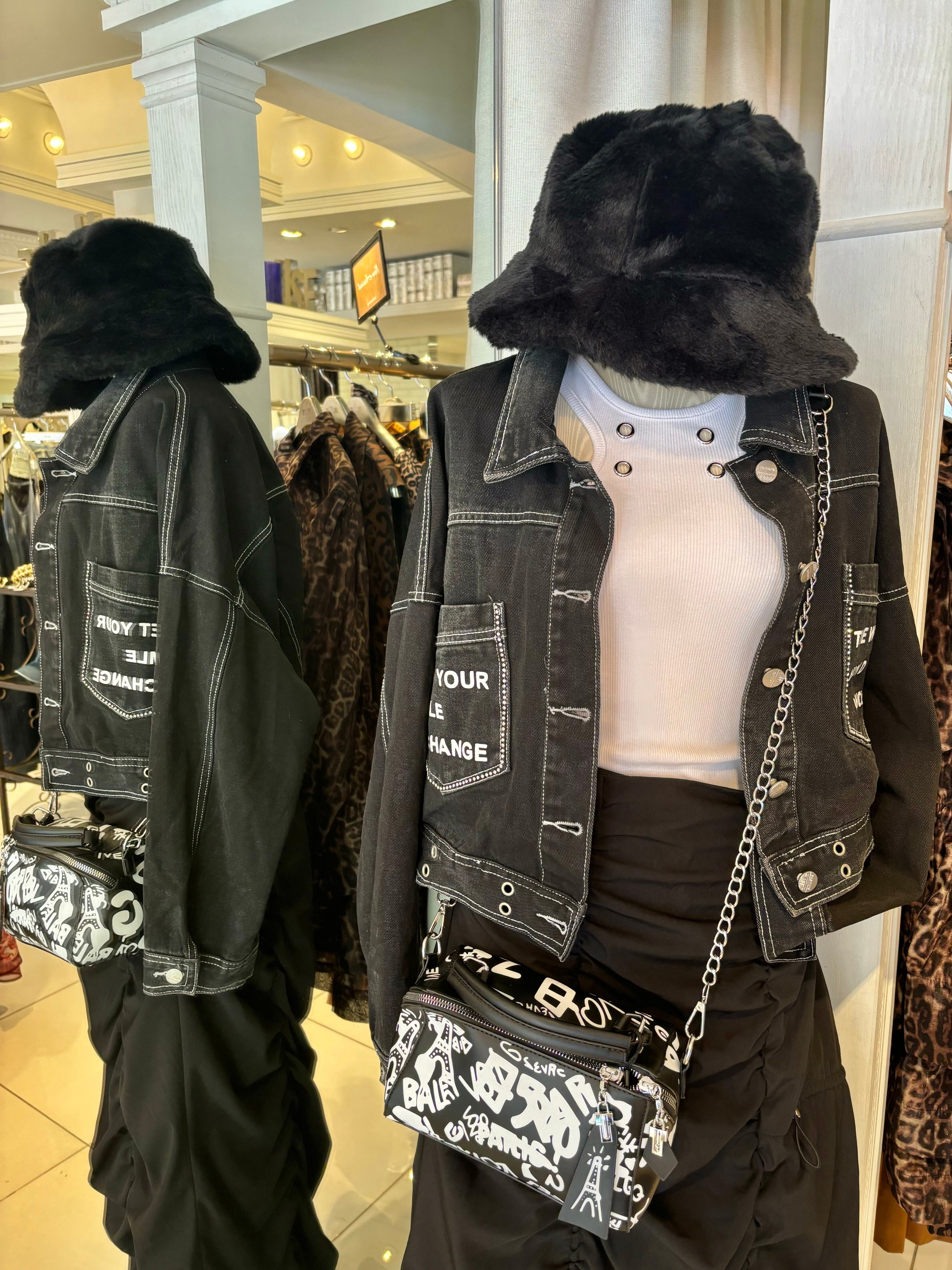 stone trimming black denim jacket ジャケット デニム Gジャン ブラックデニム プリント ストーン ホワイトステッチ