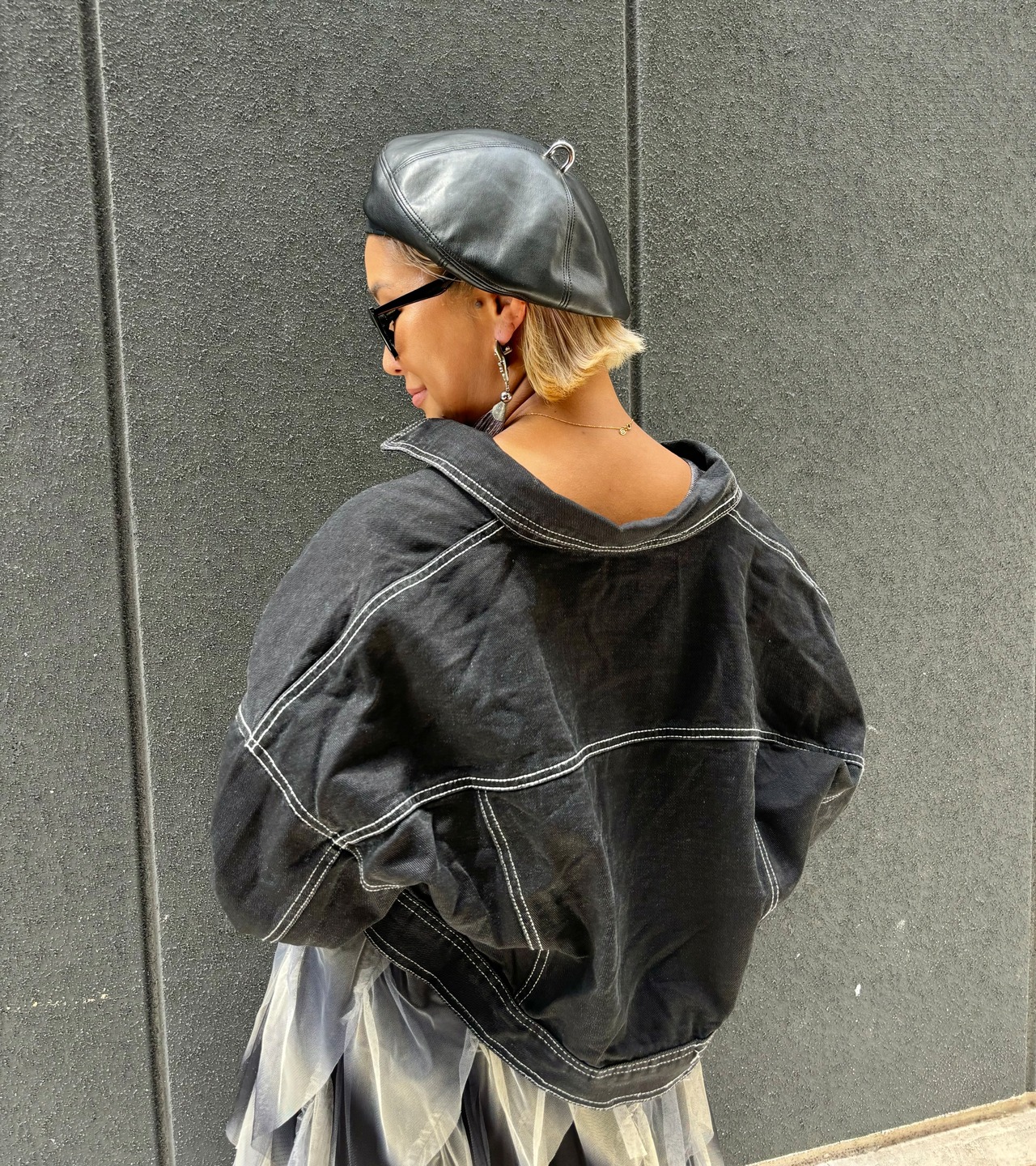 シーズンレスで活躍するアイテムとして、様々なコーディネートに取り入れやすい一着です。ストーンの光沢とデニムの風合いが絶妙なバランスを生み出し