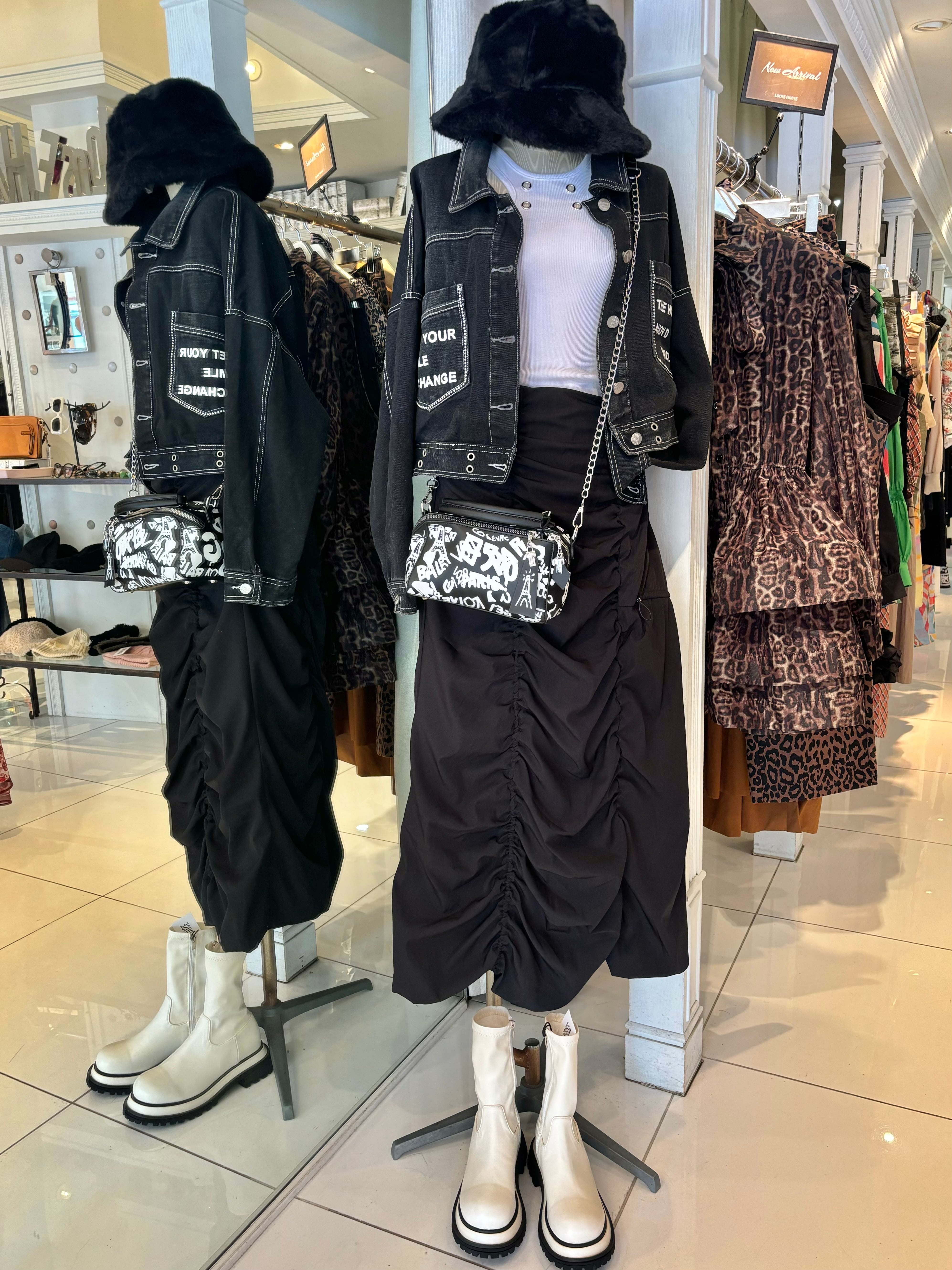 ブラックデニムに施されたストーンディテールやホワイトステッチが