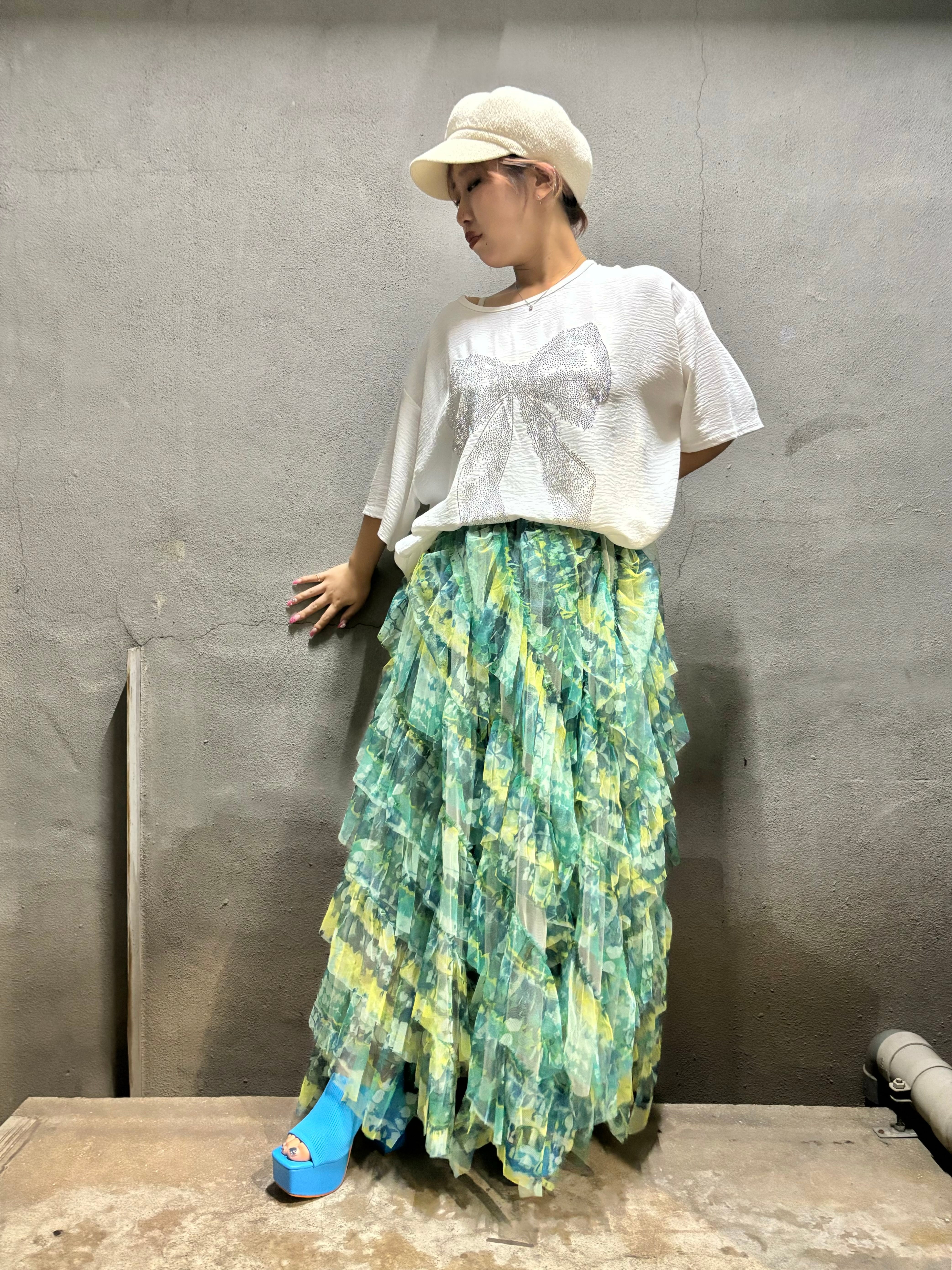 print tulle frill design skirt スカート チュール フリル プリント グリーン ゴムウエスト