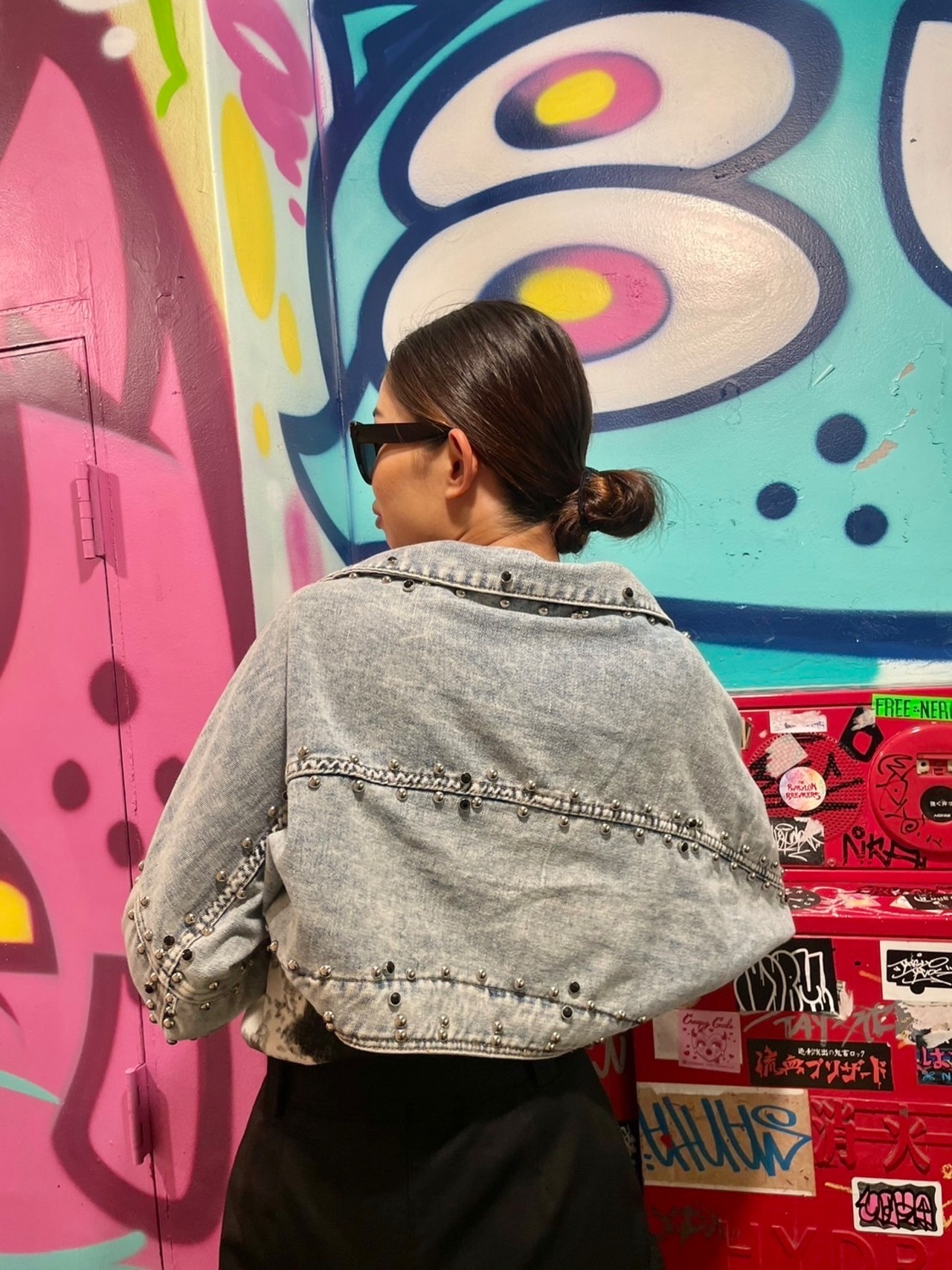 デニム×ストーンが織りなす大胆で個性的なルックが魅力のボレロ風ジャケット。