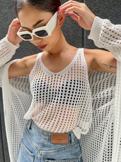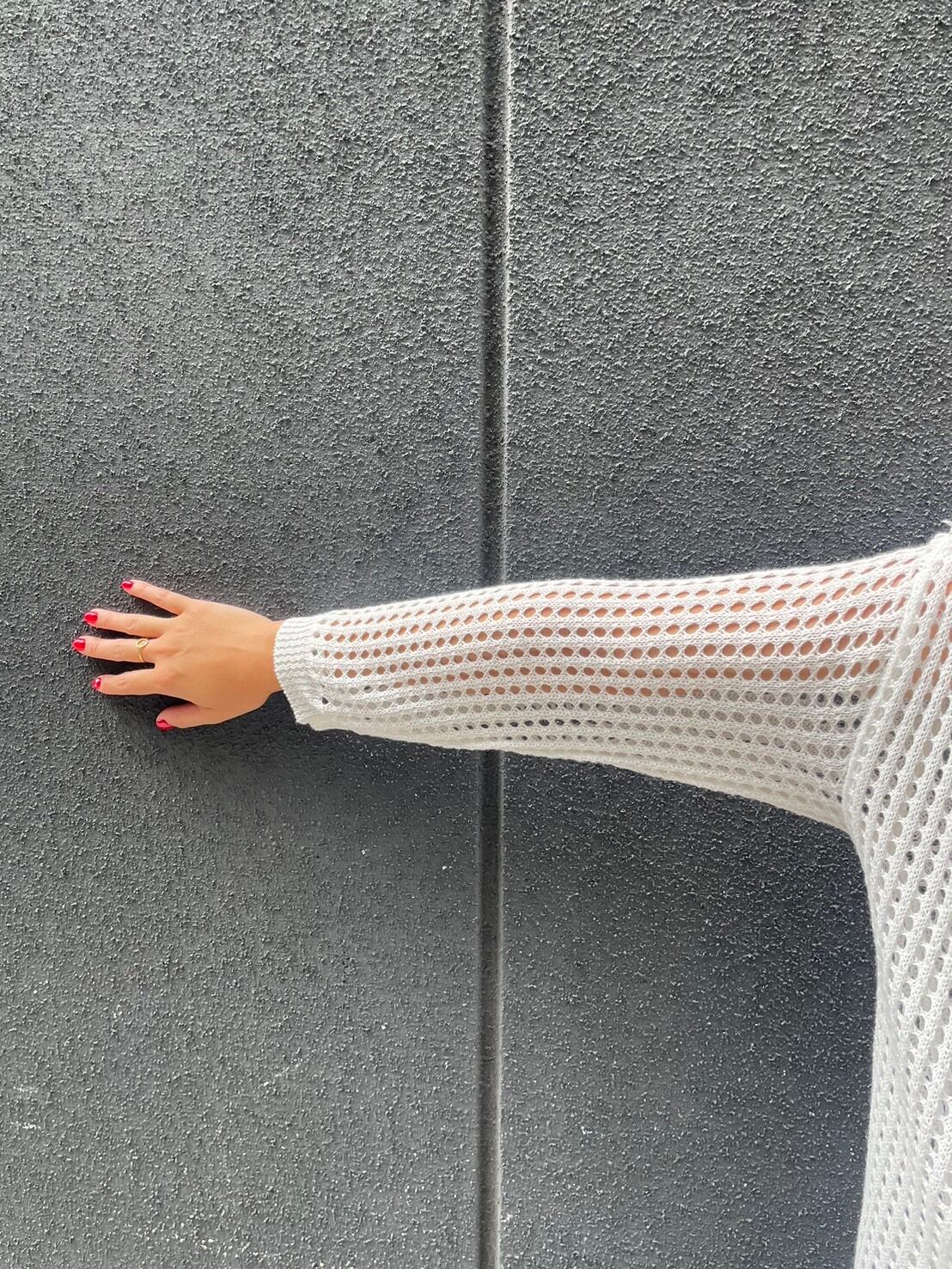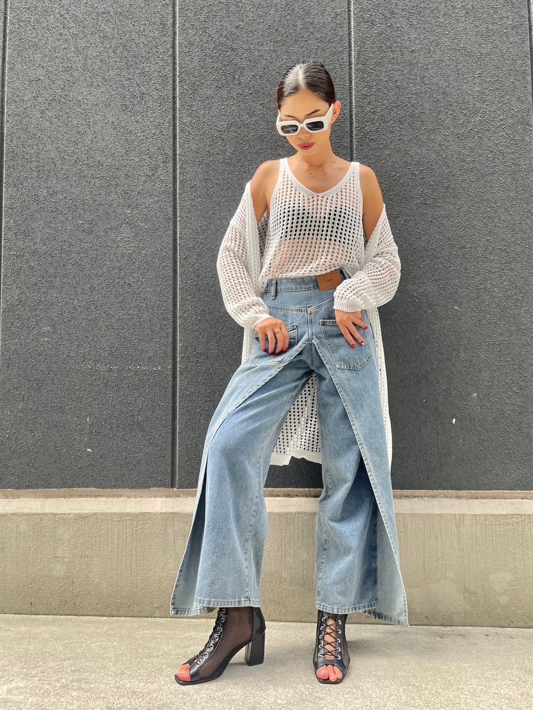 編み目が大きく開いたメッシュニットが、抜け感のあるカジュアルさを演出。