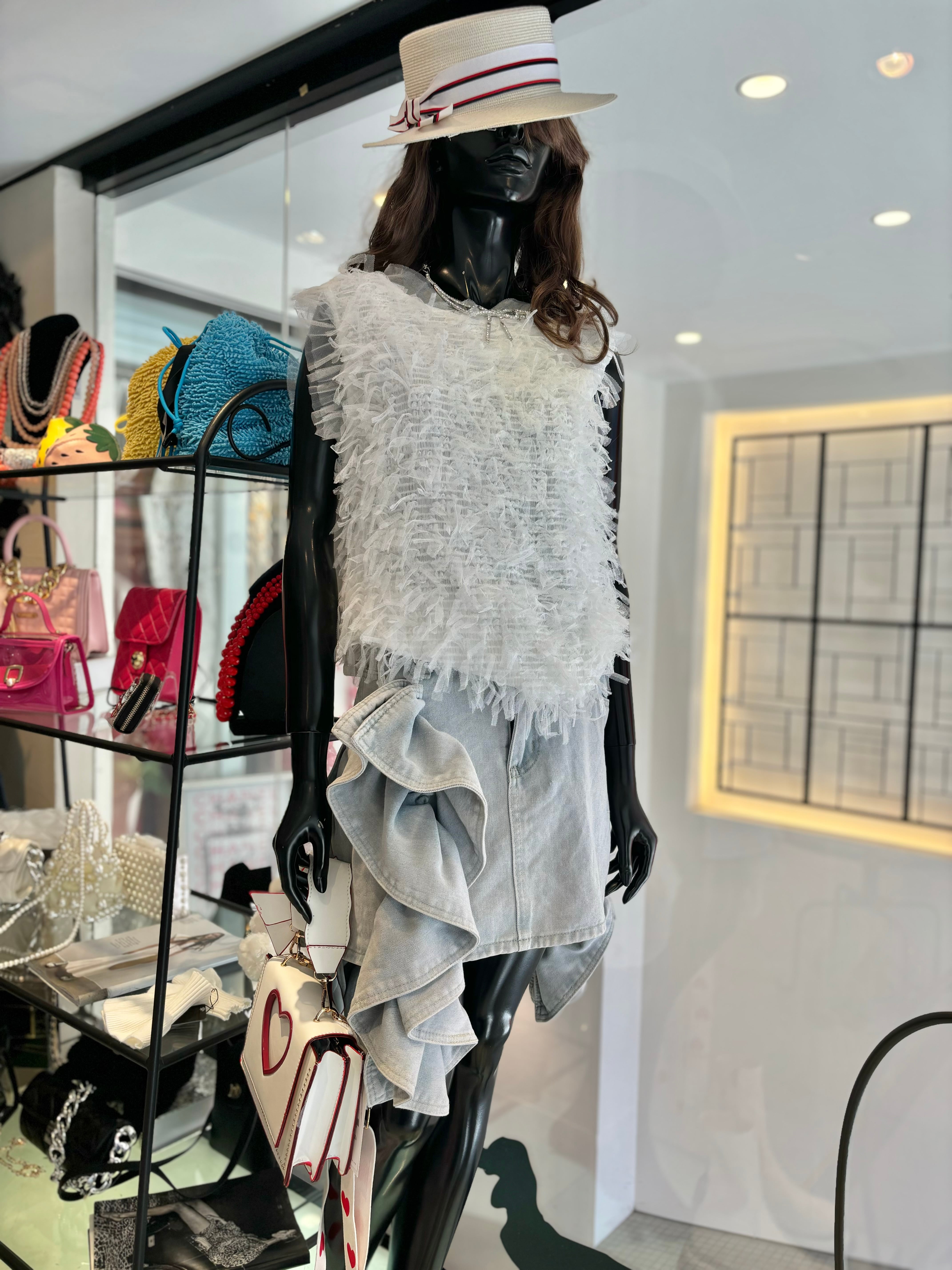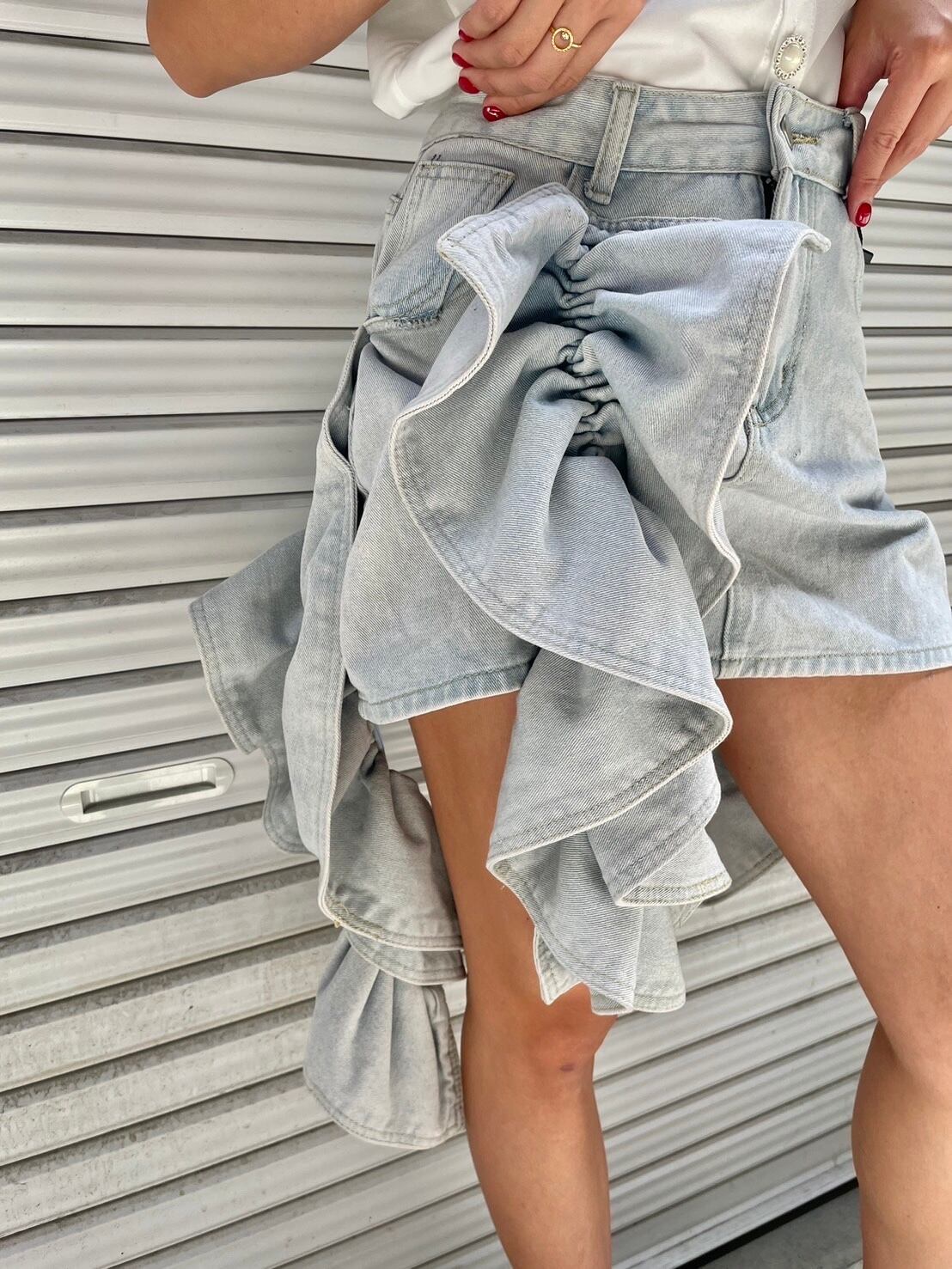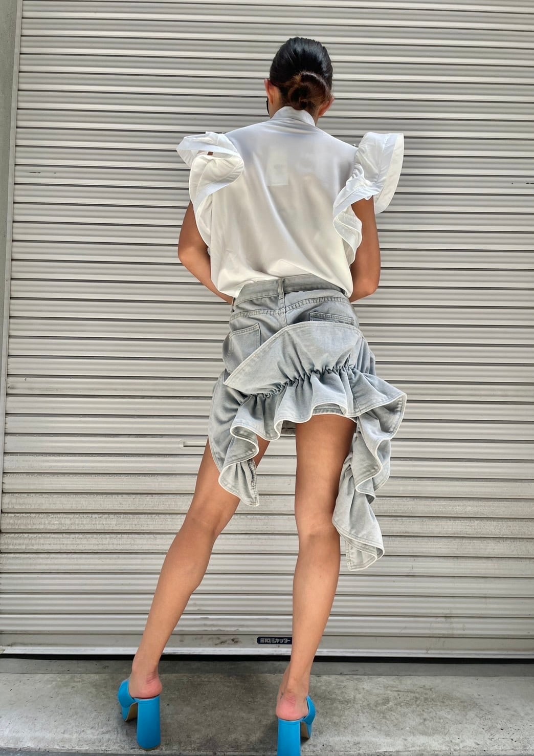 淡いブルーカラーのデニム生地に、アシンメトリーに配置されたフリルがポイント。