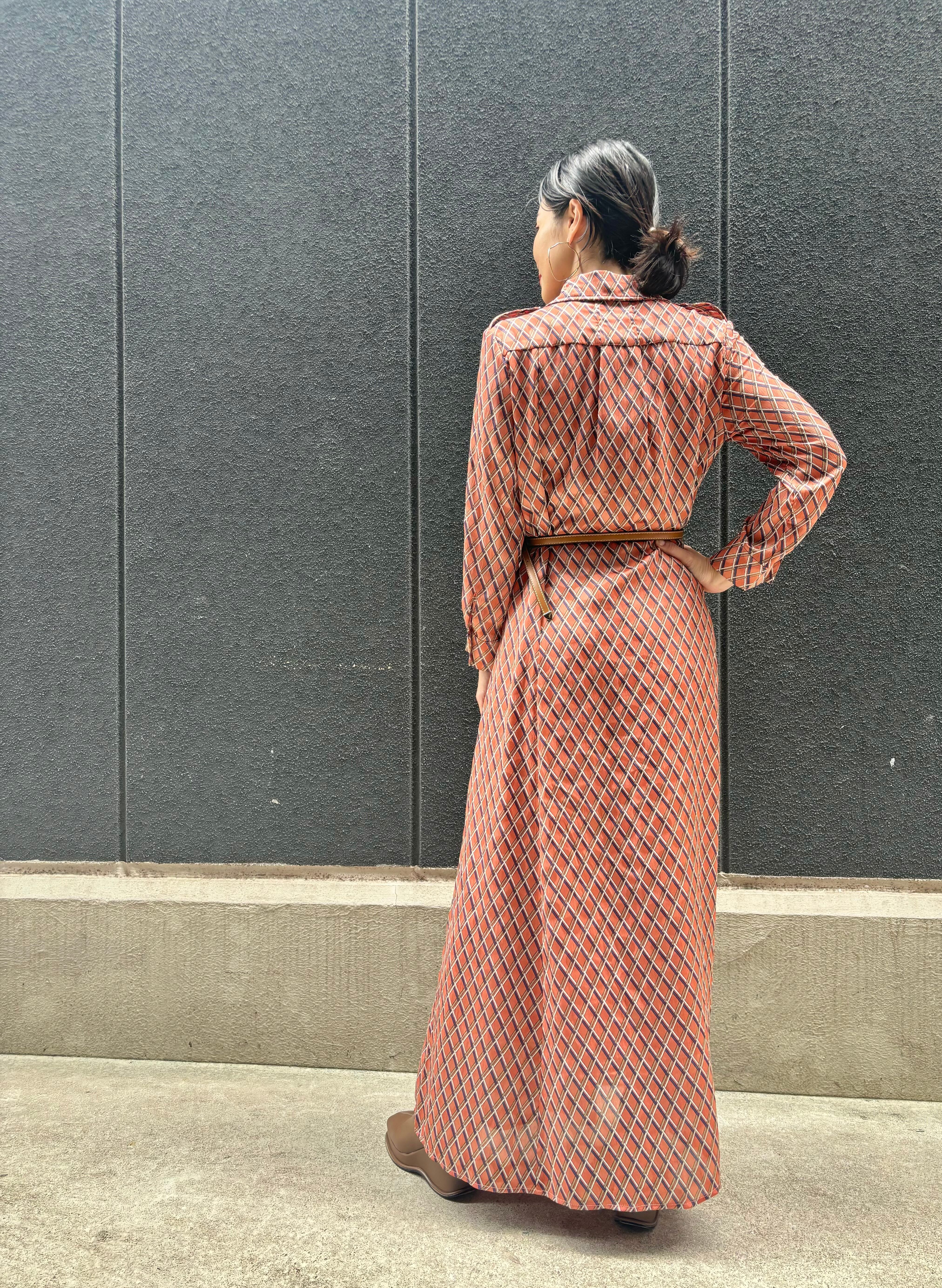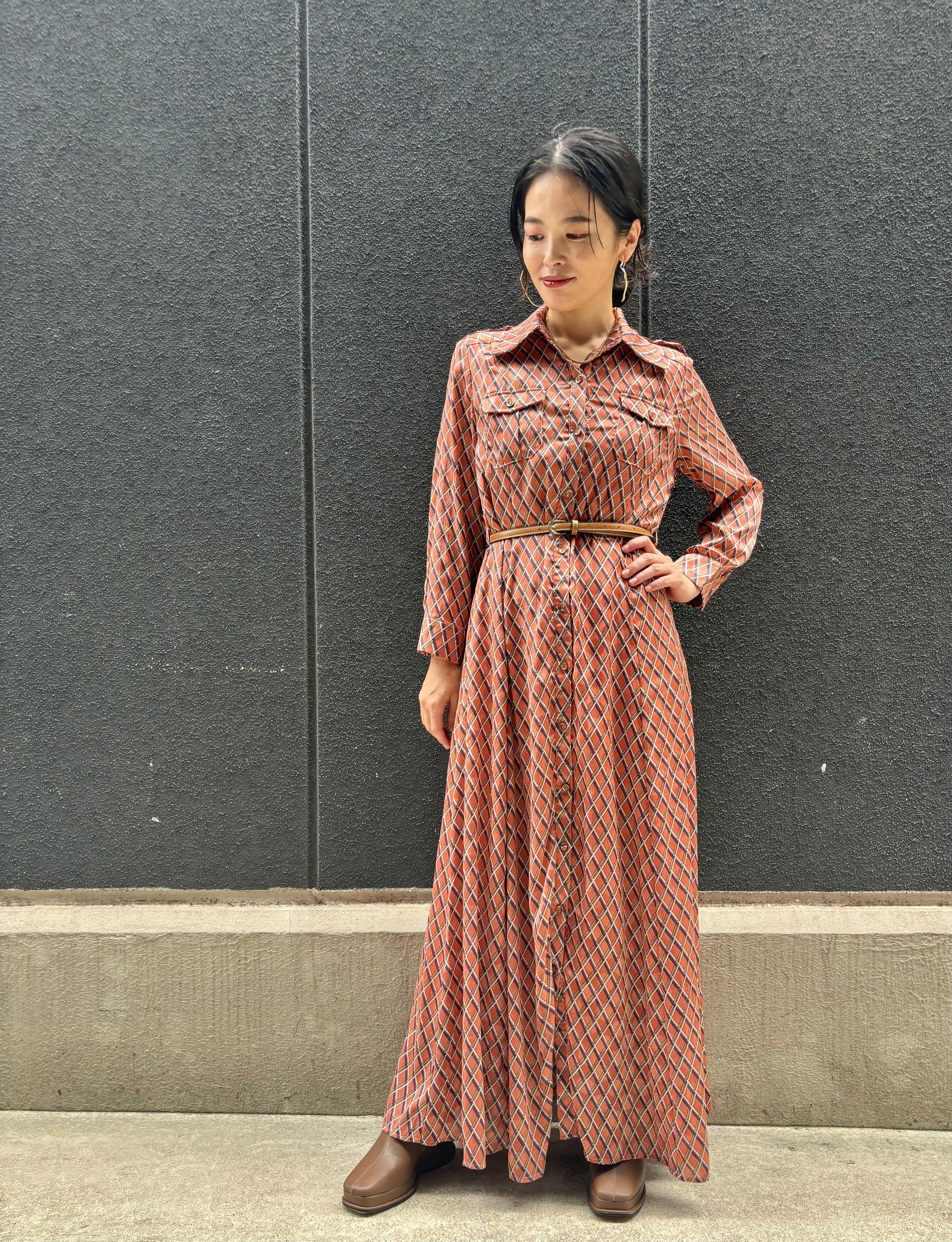 bias check pattern long sleeve shirt one-piece ワンピース シャツワンピ ロングワンピ チェック 細ベルト 前開き