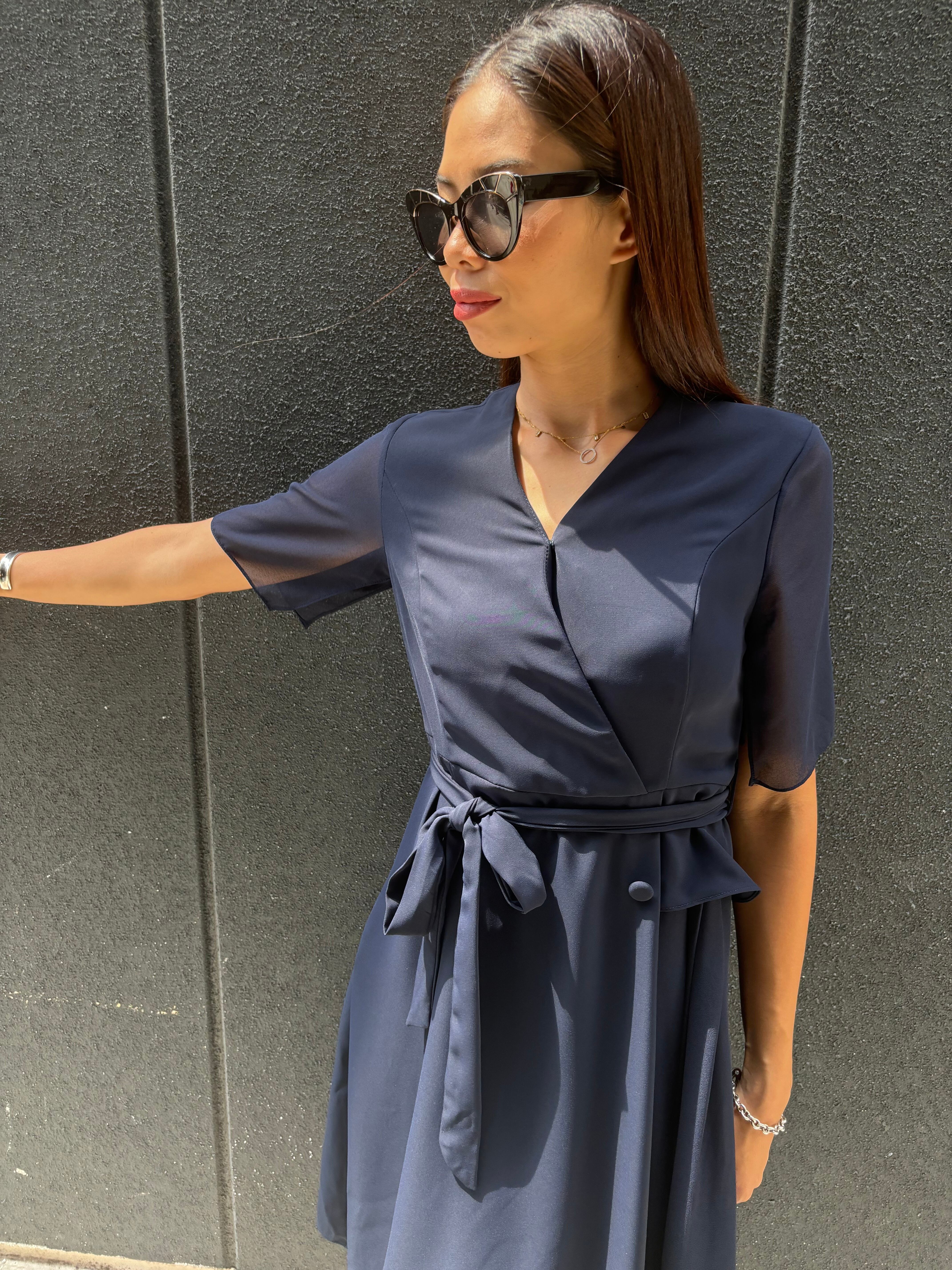 シフォン生地の繊細な透け感が美しい、カシュクール風デザインのワンピース☆