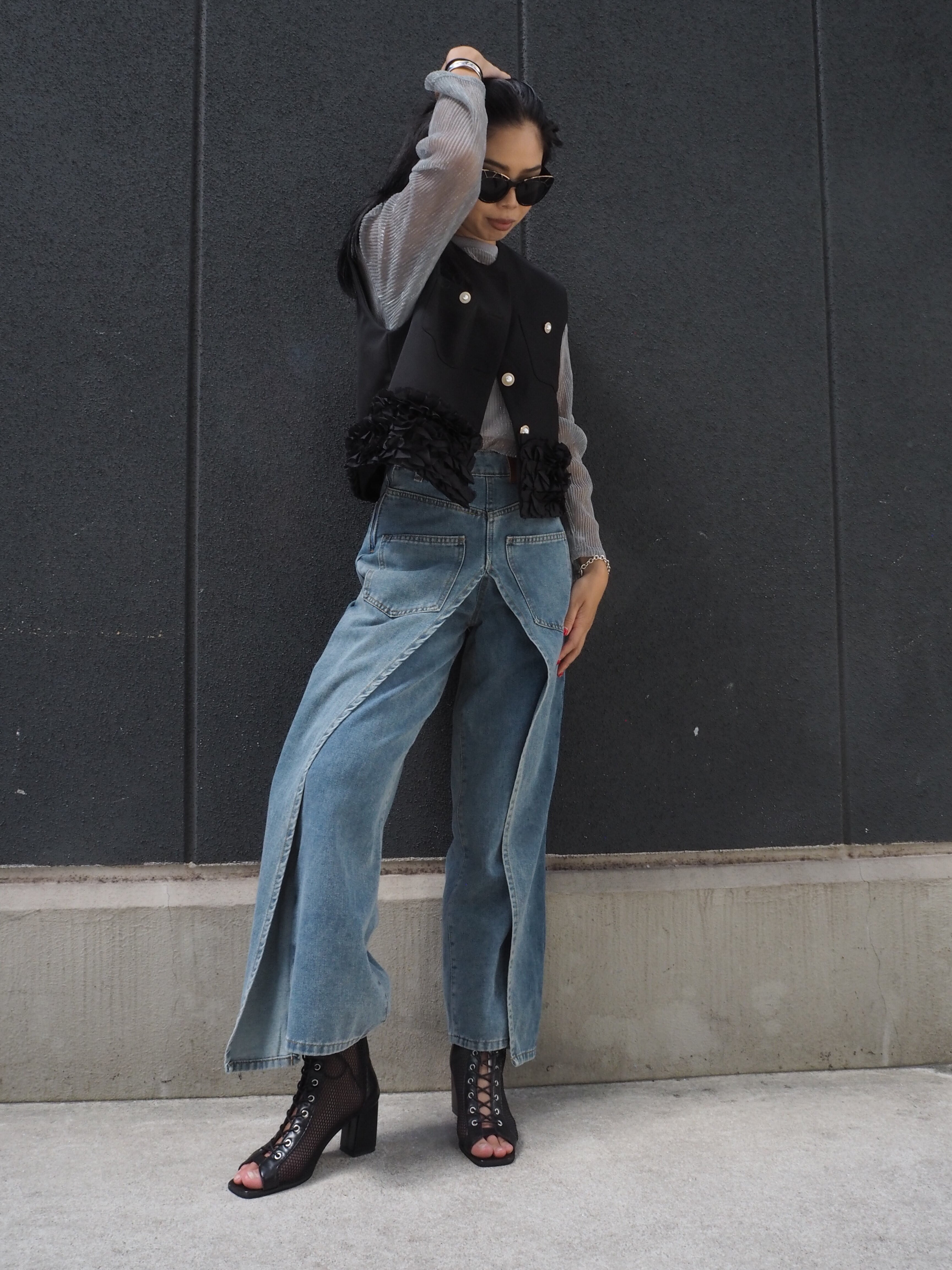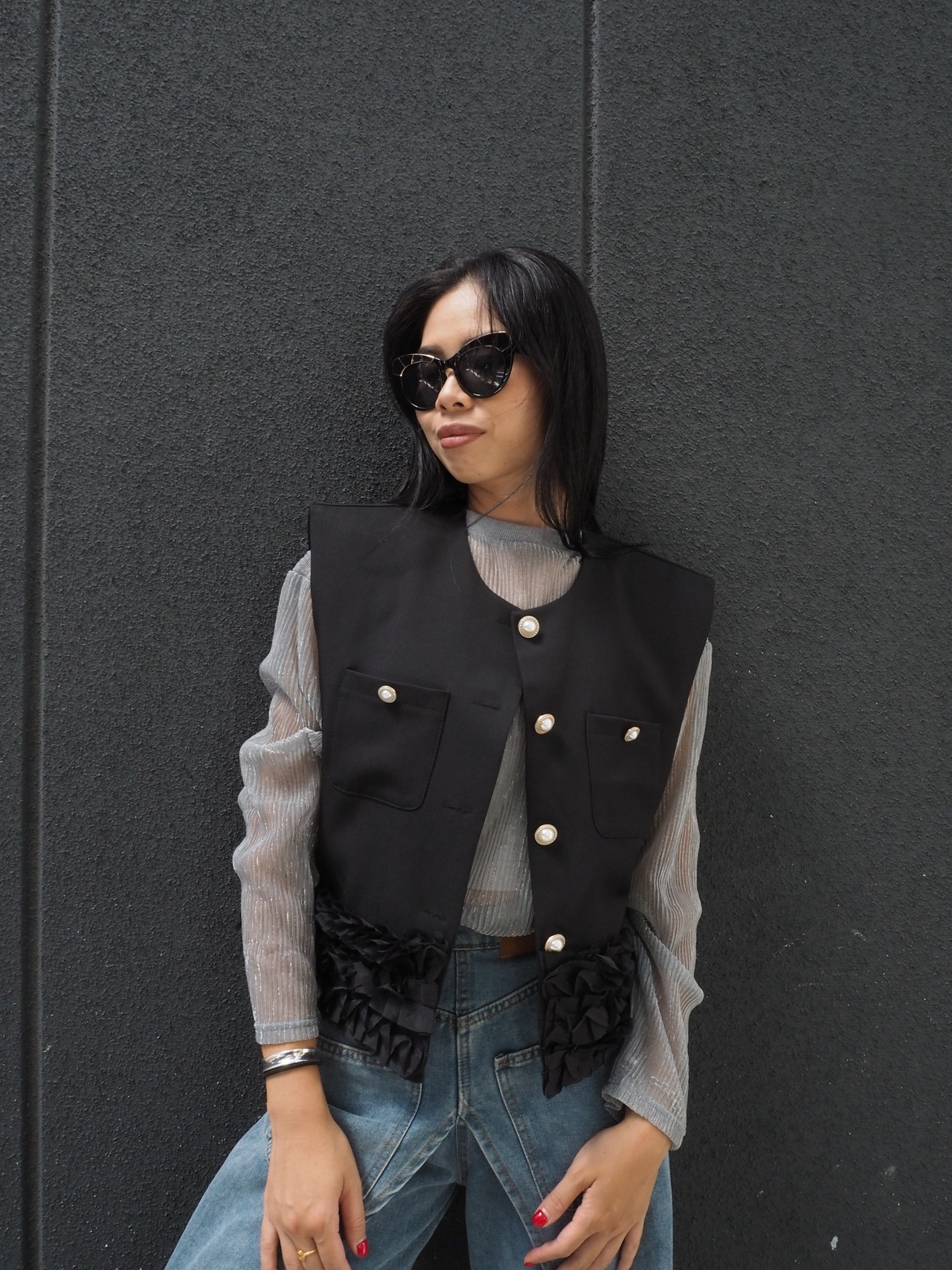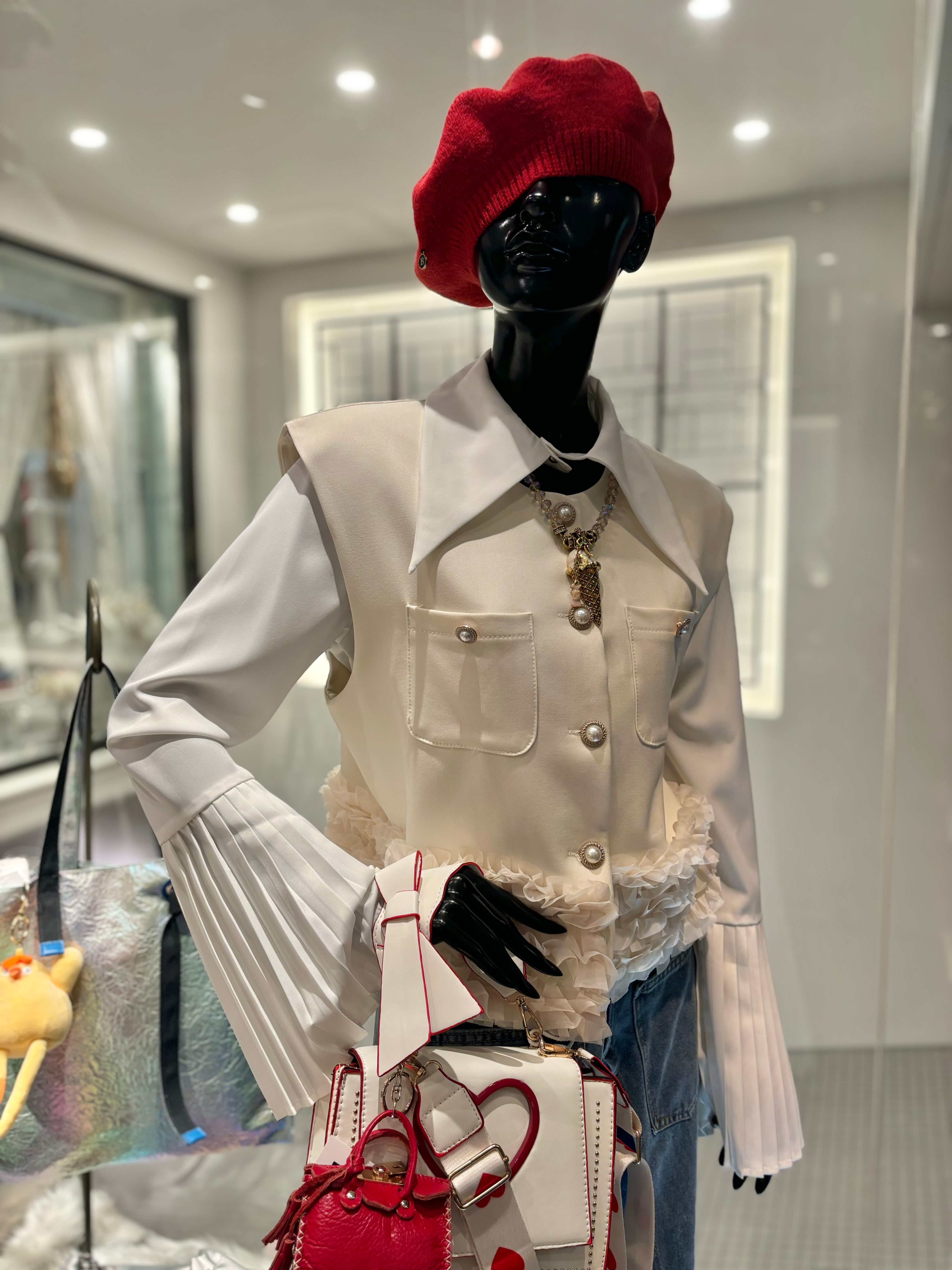 mini frill hem C-neck design vest ベスト フリル 金ボタン 重ね着 Cネック きれいめ