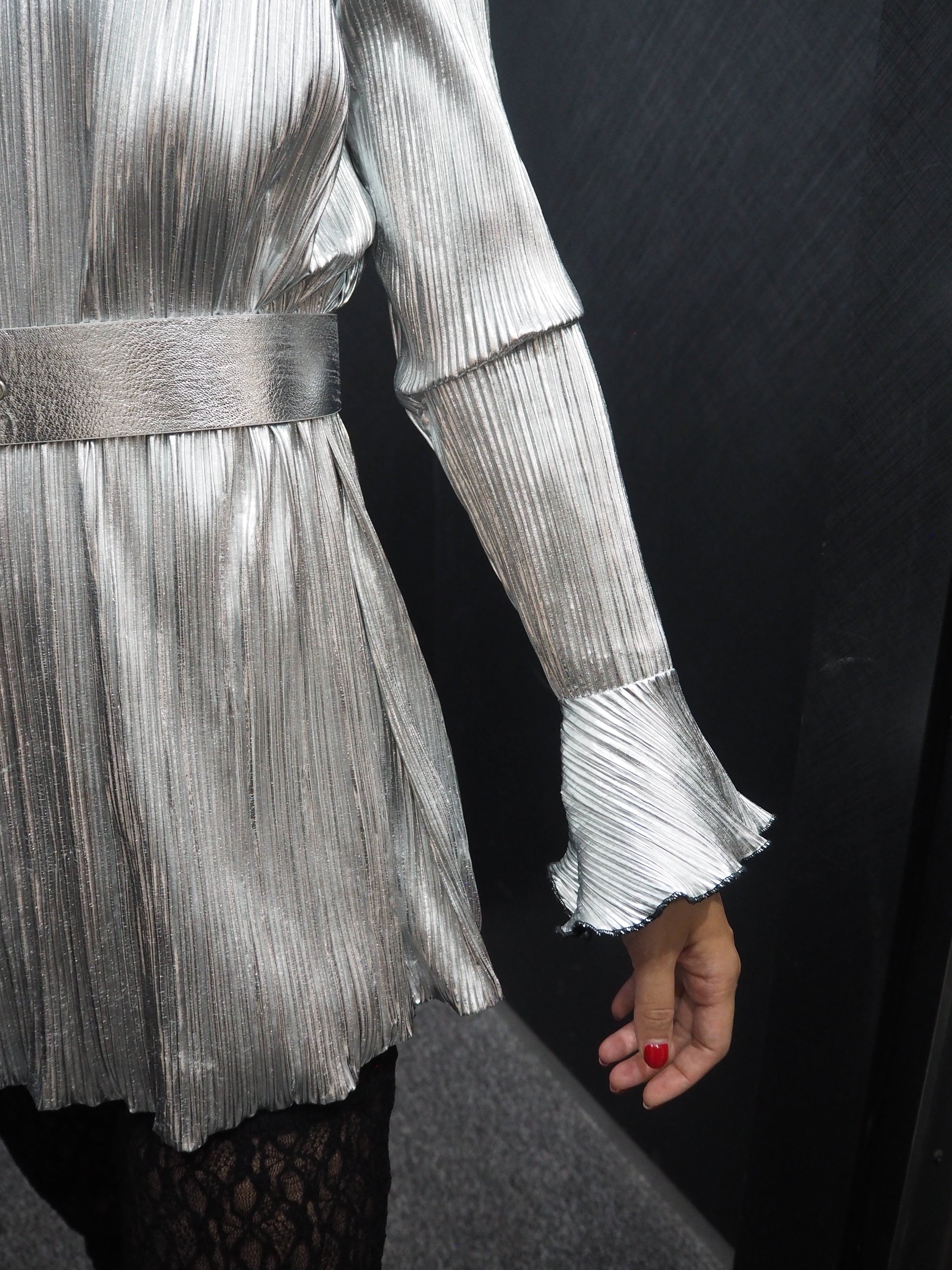 輝くメタリックな輝きと女性らしいプリーツが魅力的な、モダンでエレガントな一枚!!