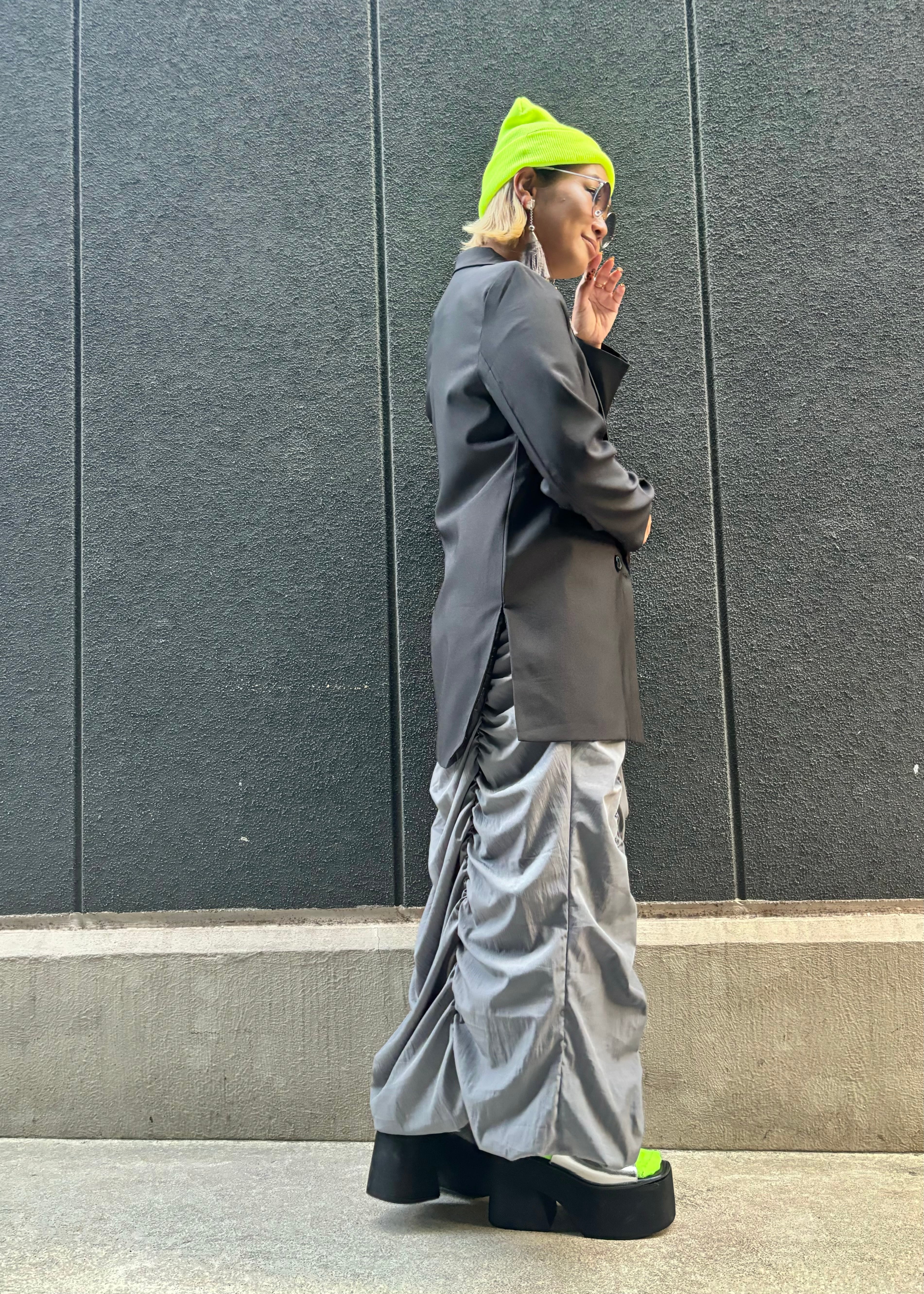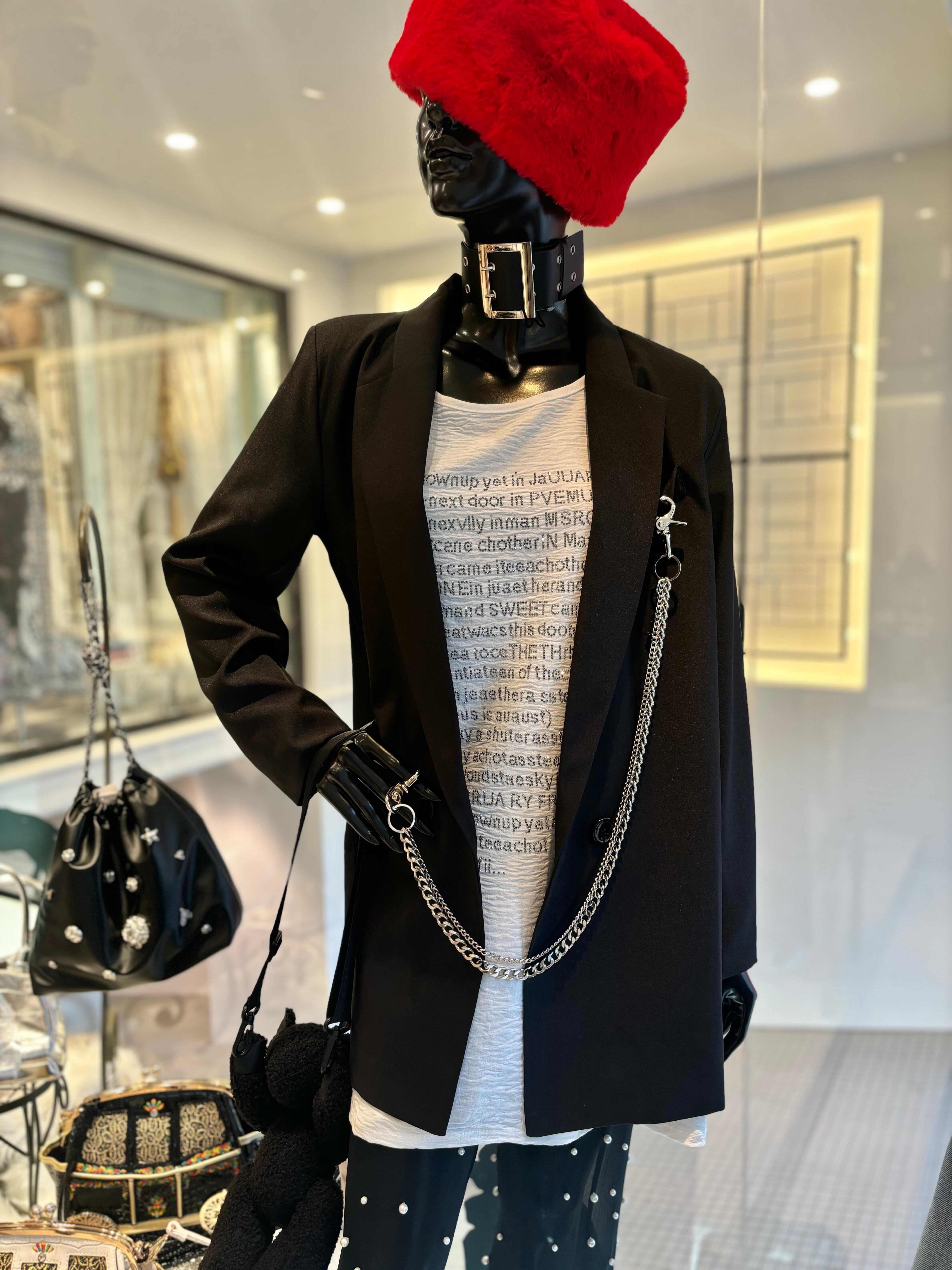 真っ黒なカラーリングとテーラードのシルエットが、どんなコーディネートにもマッチし