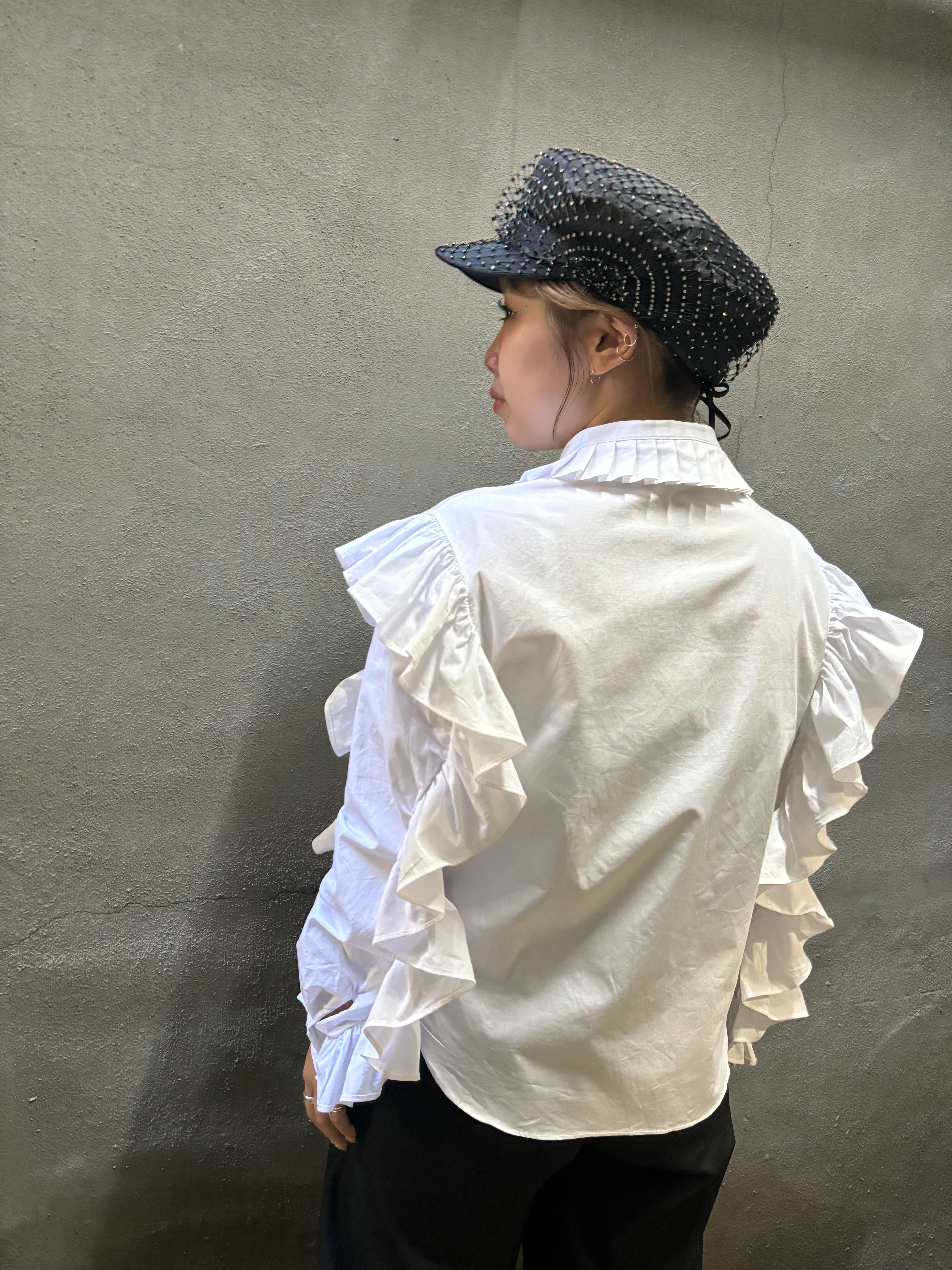 スタイリッシュな白シャツに、フェミニンなフリルスリーブデザインが加わった一枚!!
