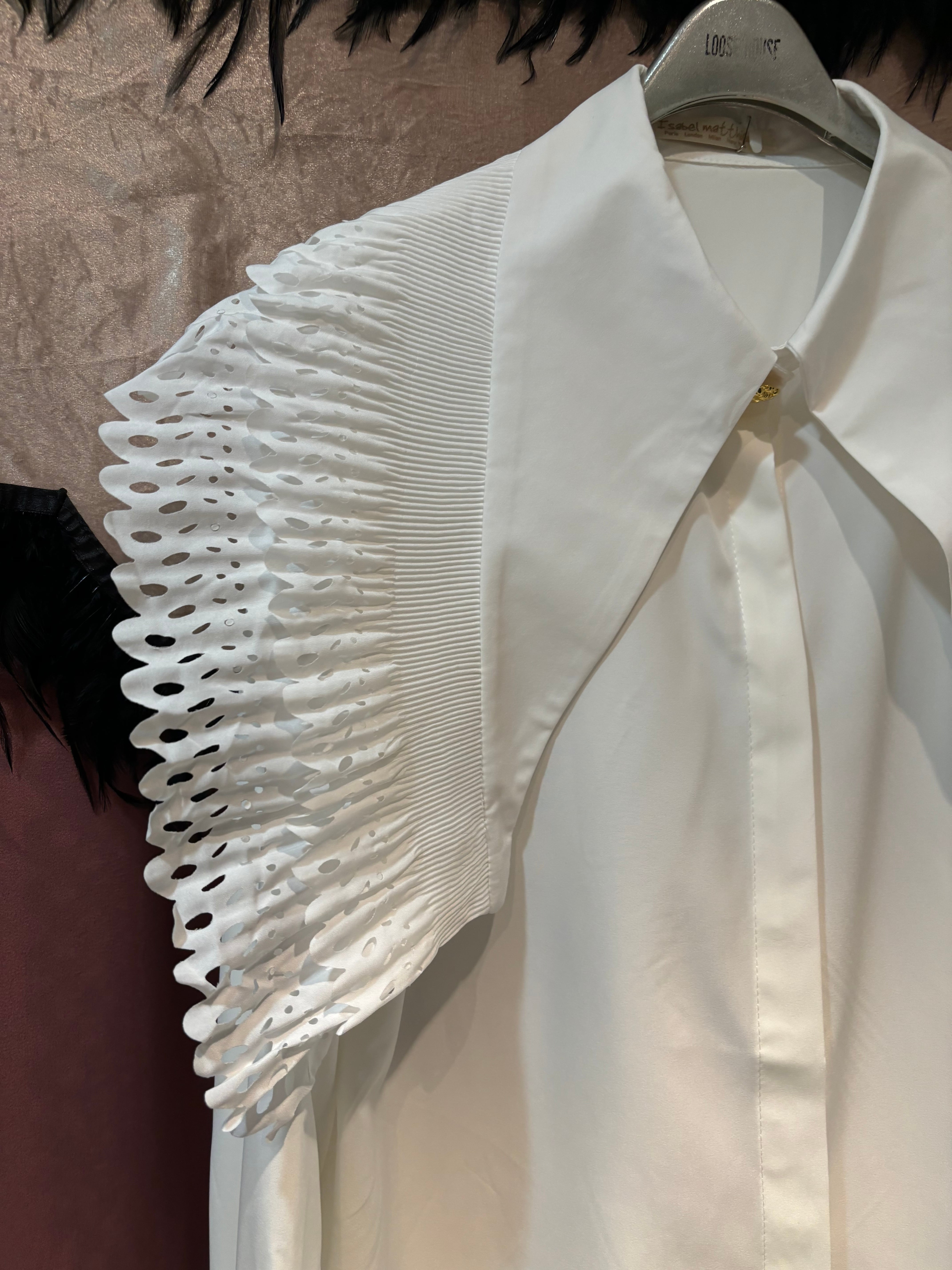 プリーツが入ったシャープな襟が特徴で、ホワイトシャツのシンプルさに
