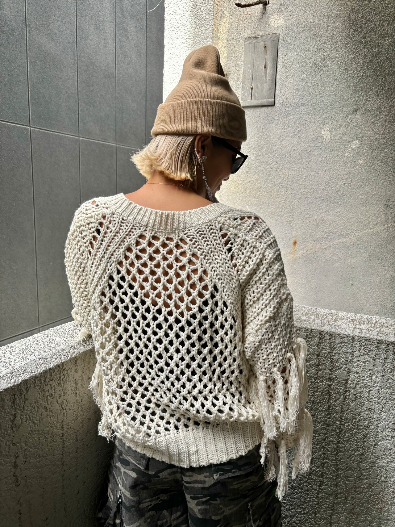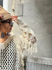 mesh fringe design V-neck knit tops sweater ニット トップス セーター Vネック フリンジ 重ね着 秋