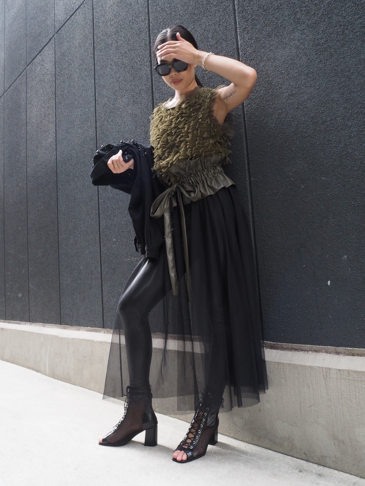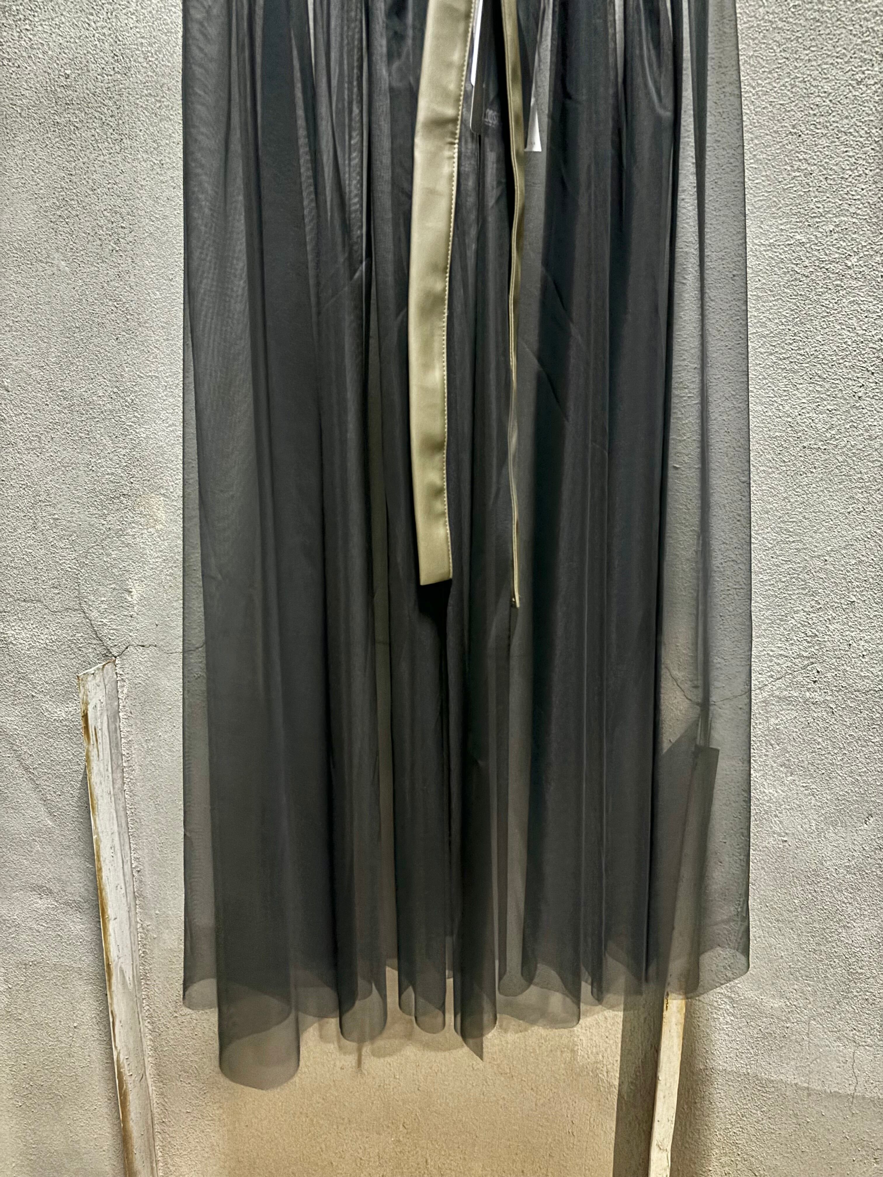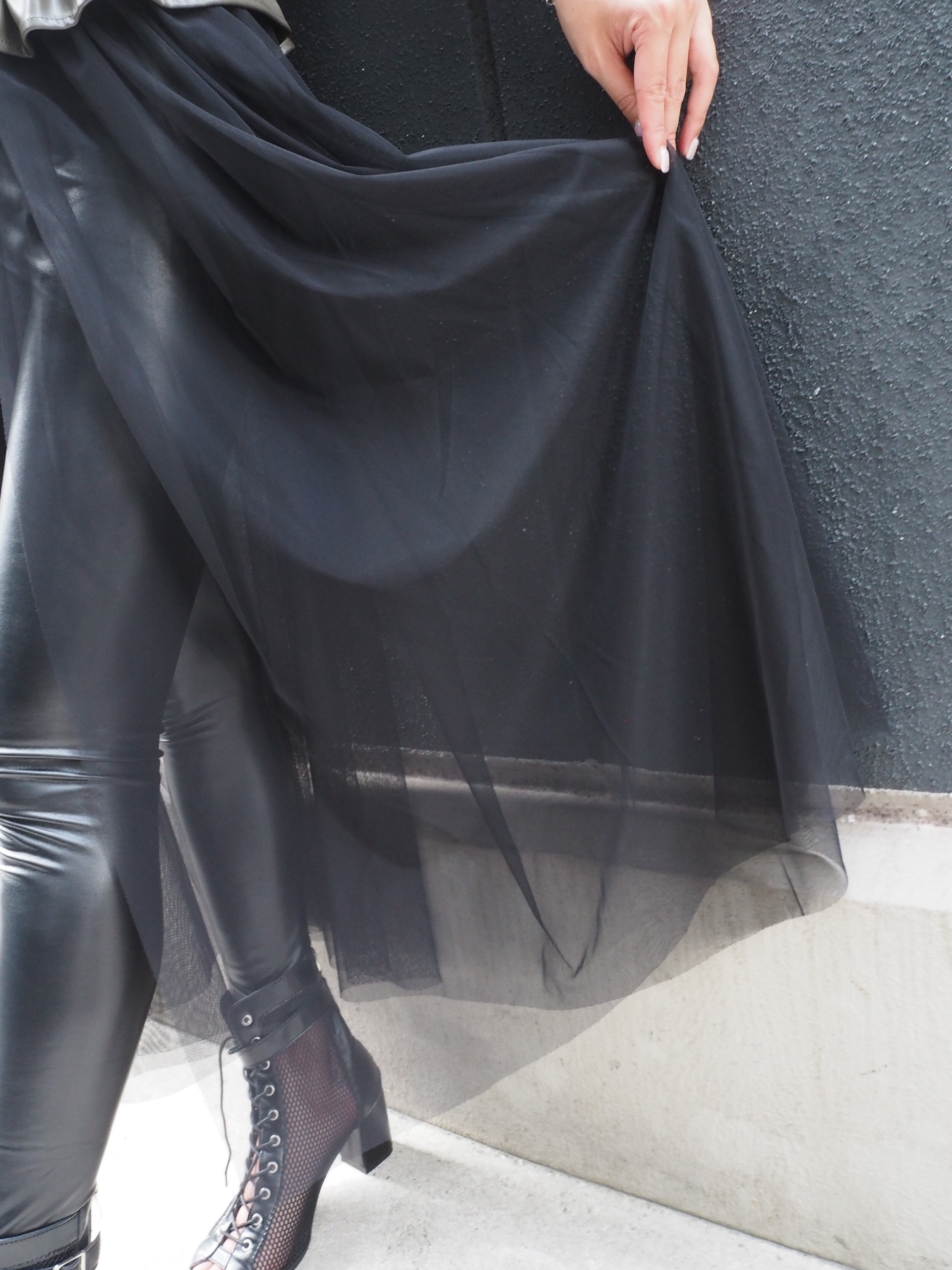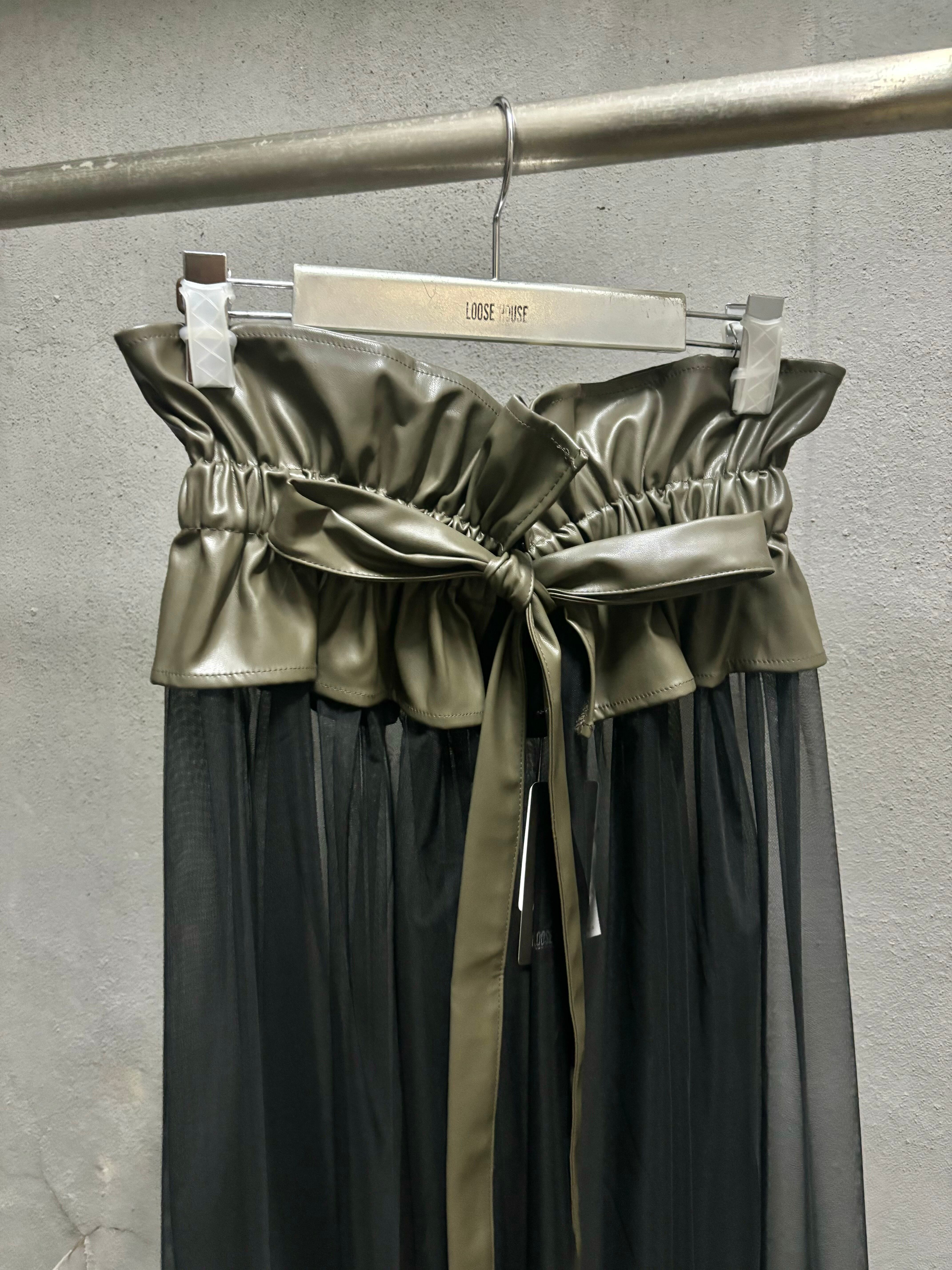 eco leather waist design tulle mesh cover skirt スカート チュール メッシュ エコレザー ベルト ウエストマーク カバー 重ね着