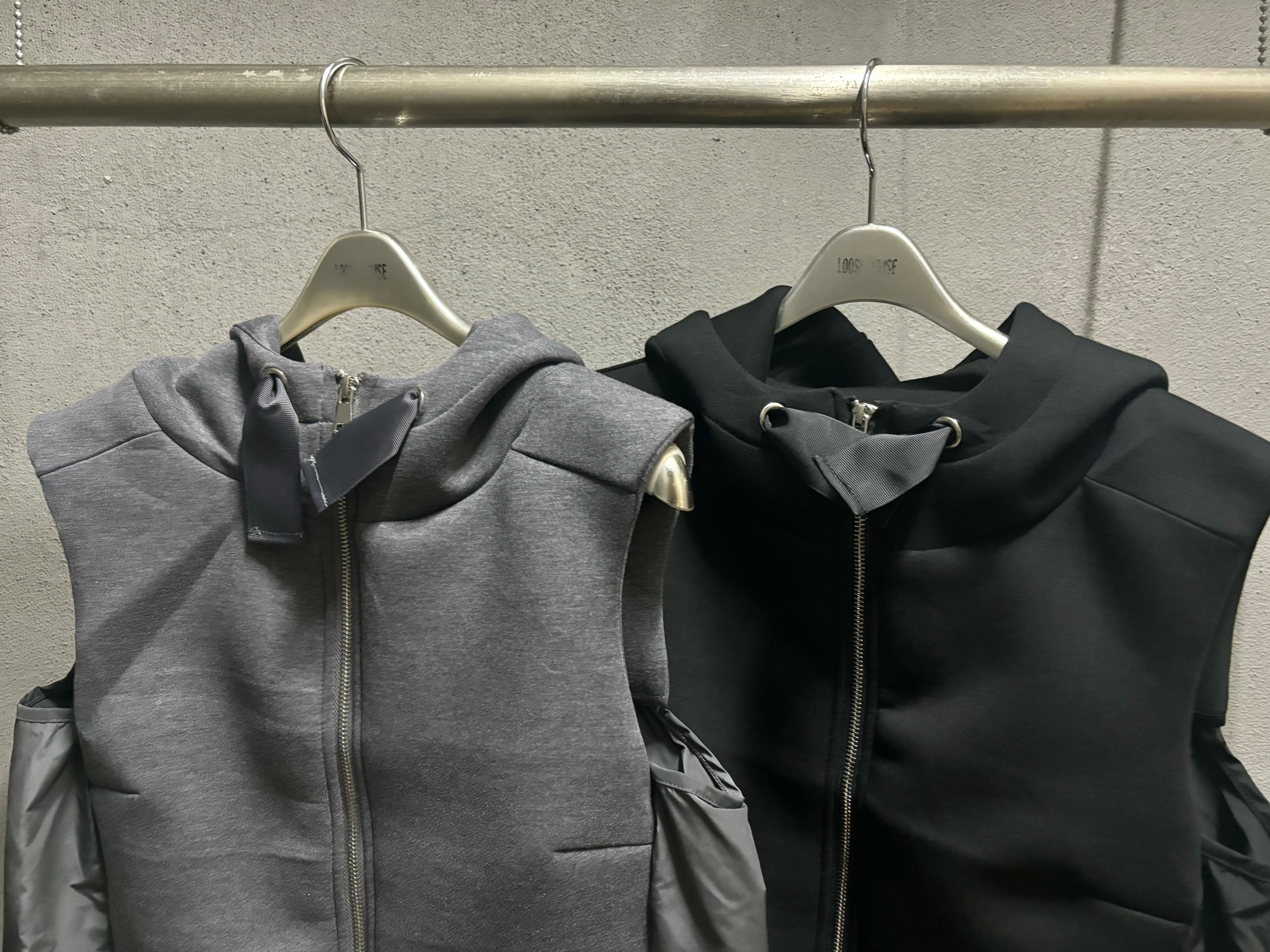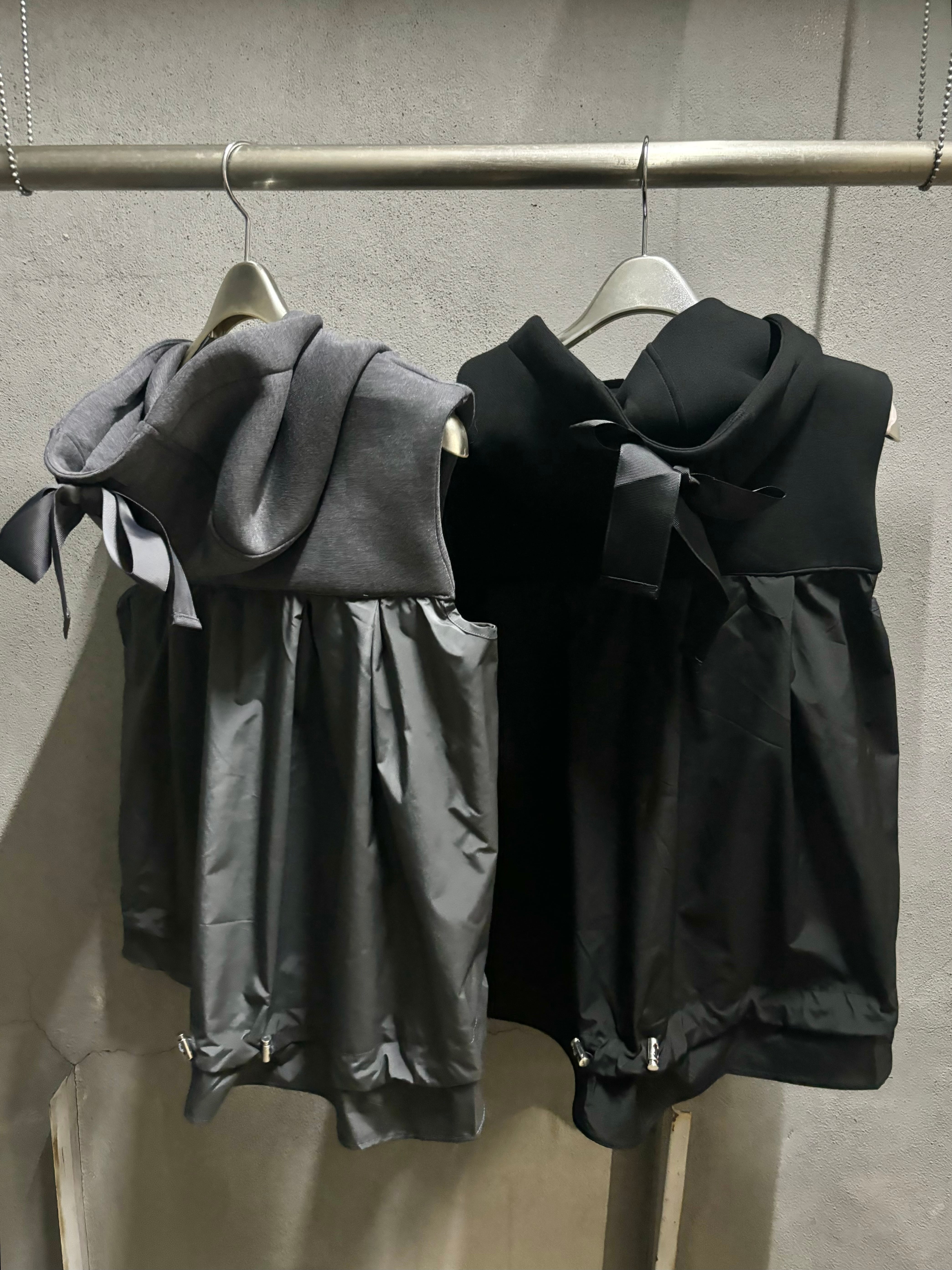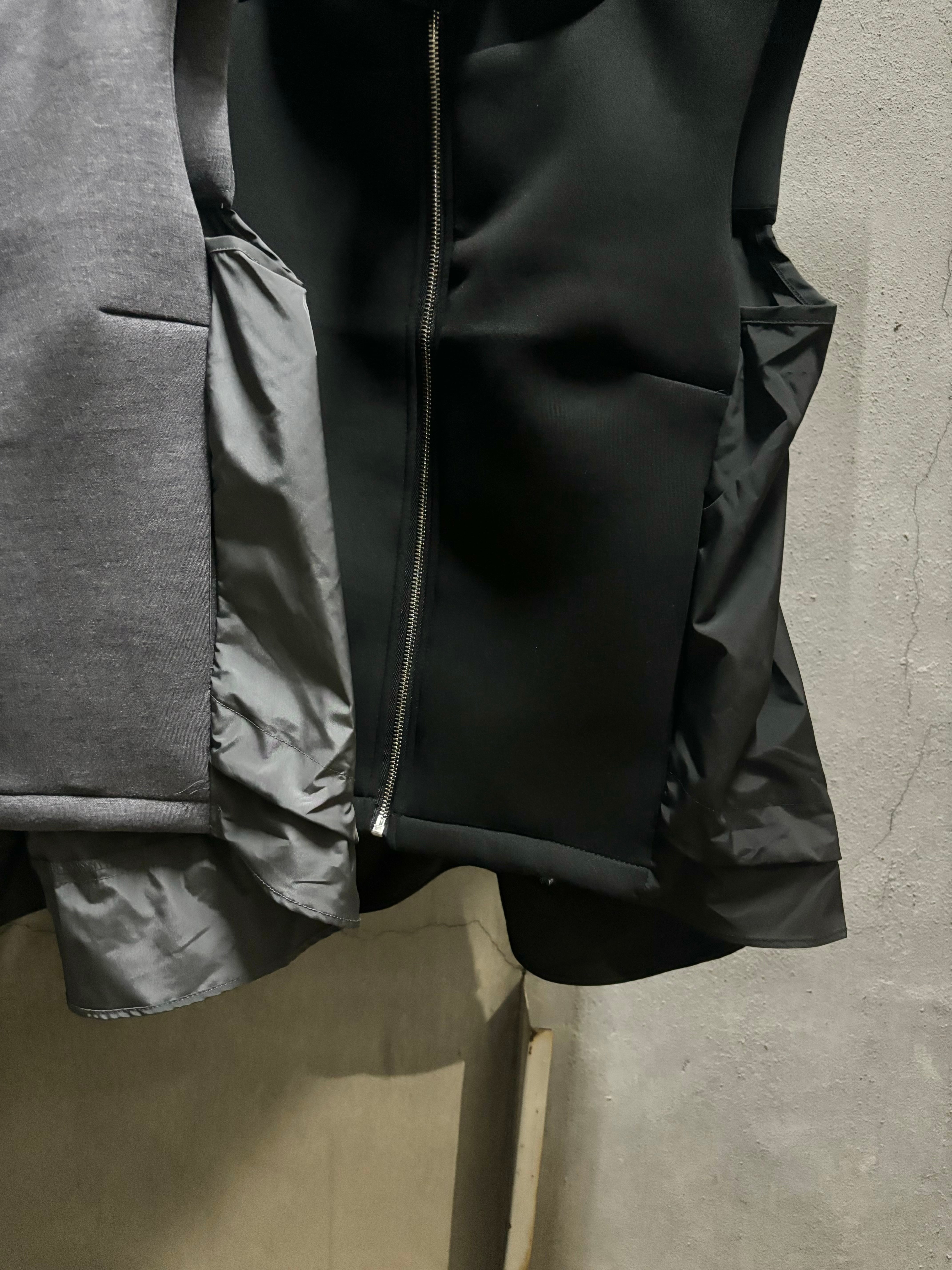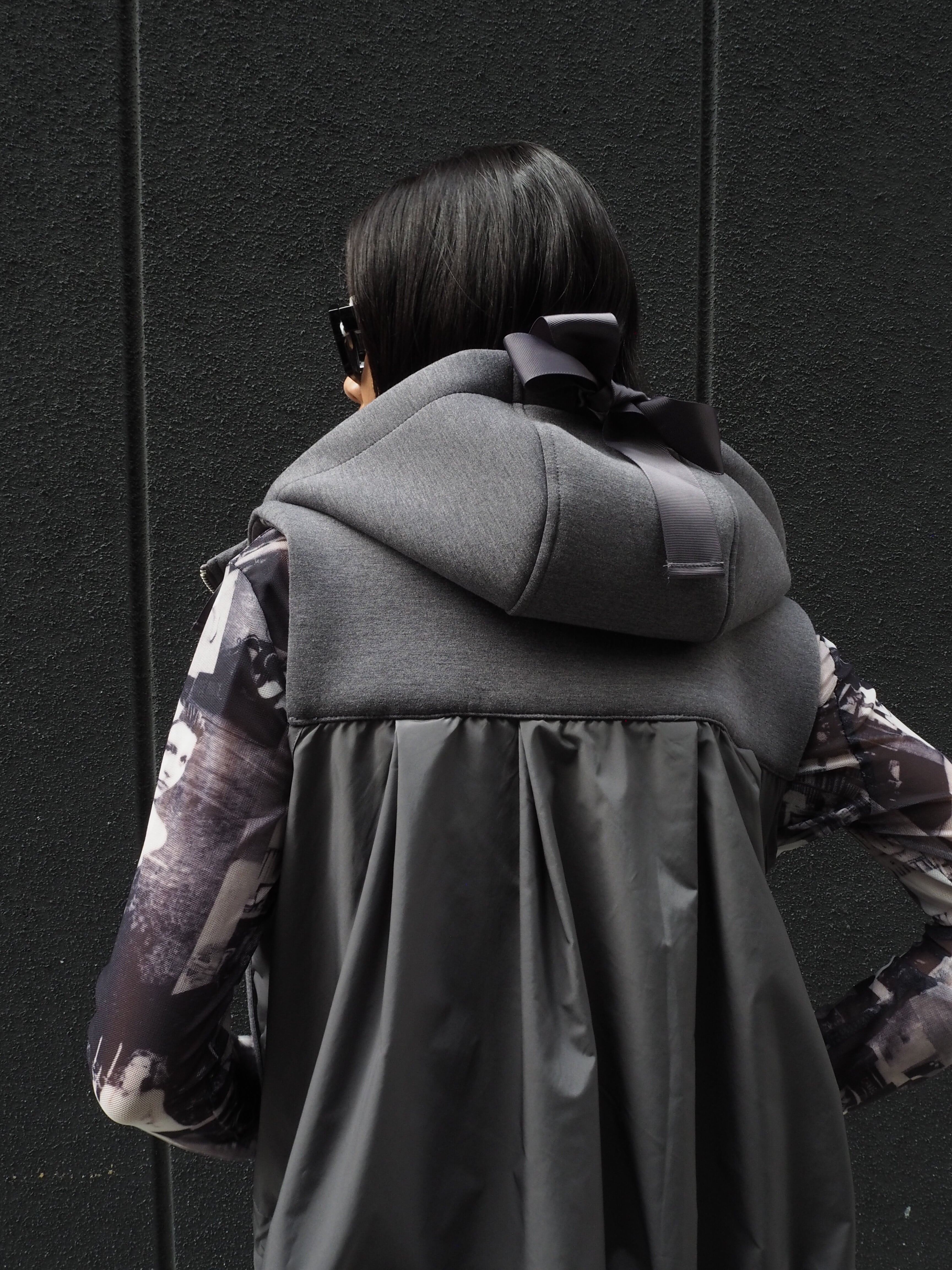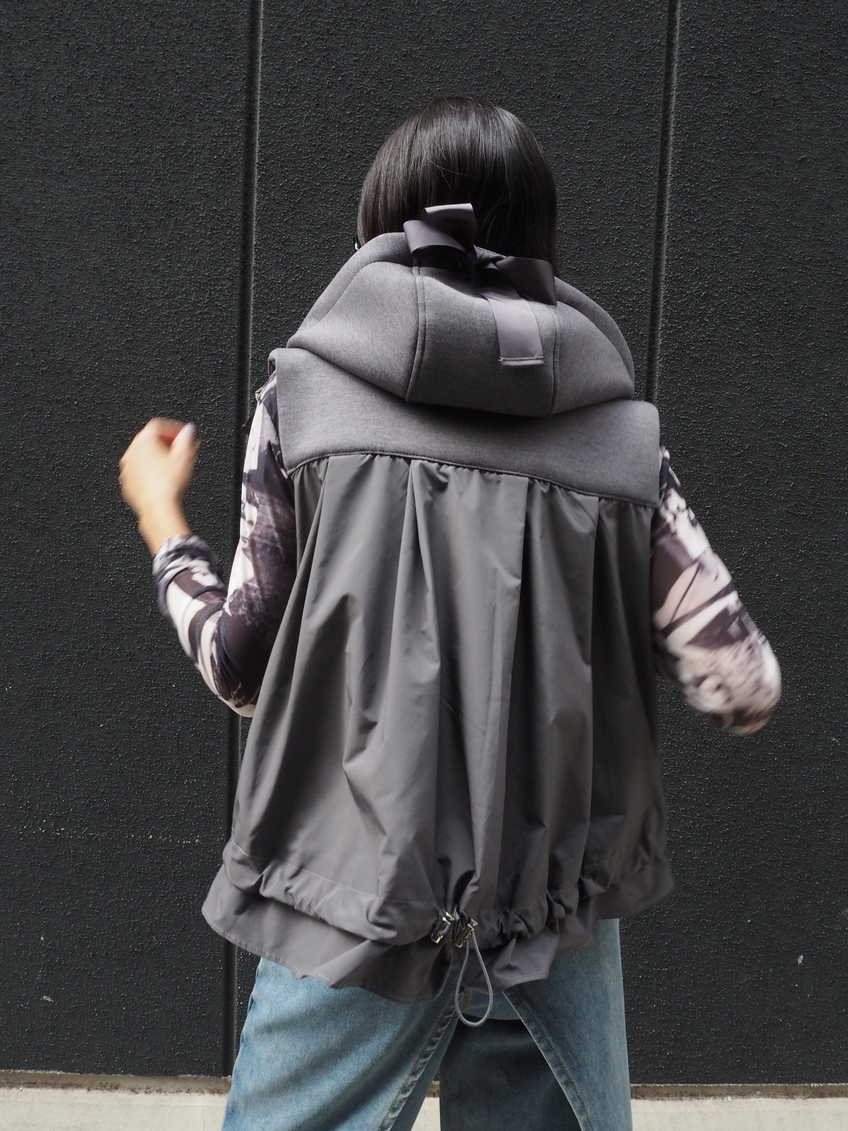 different fabrics change ribbon design hoodie vest ベスト フーディー フード 異素材切替 切替デザイン ドローコード ジップアップ リボン重ね着