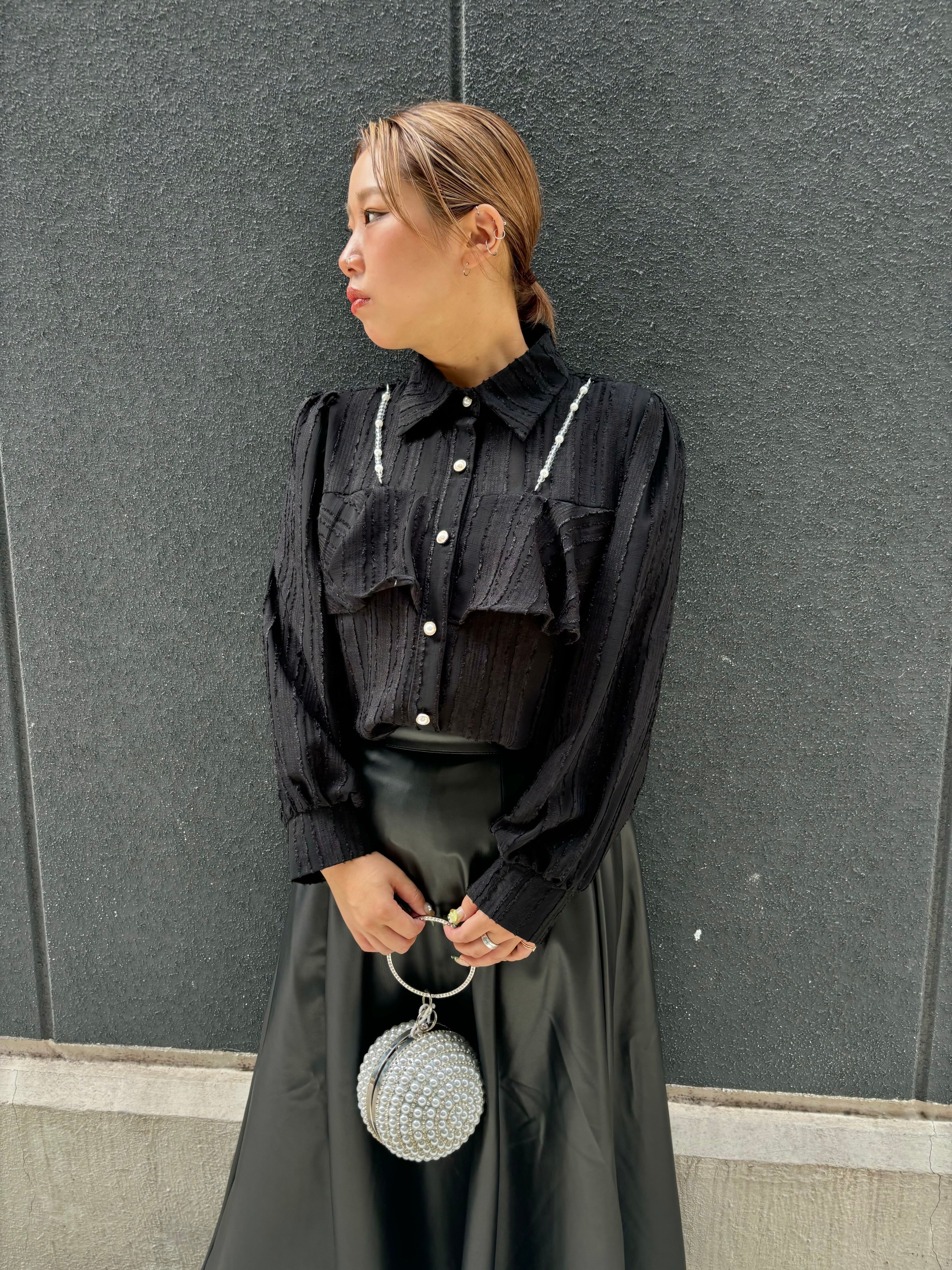 chiffon solid stripe design shirt シャツ デザインシャツ シフォン ストライプ 重ね着風デザイン ブラック 黒