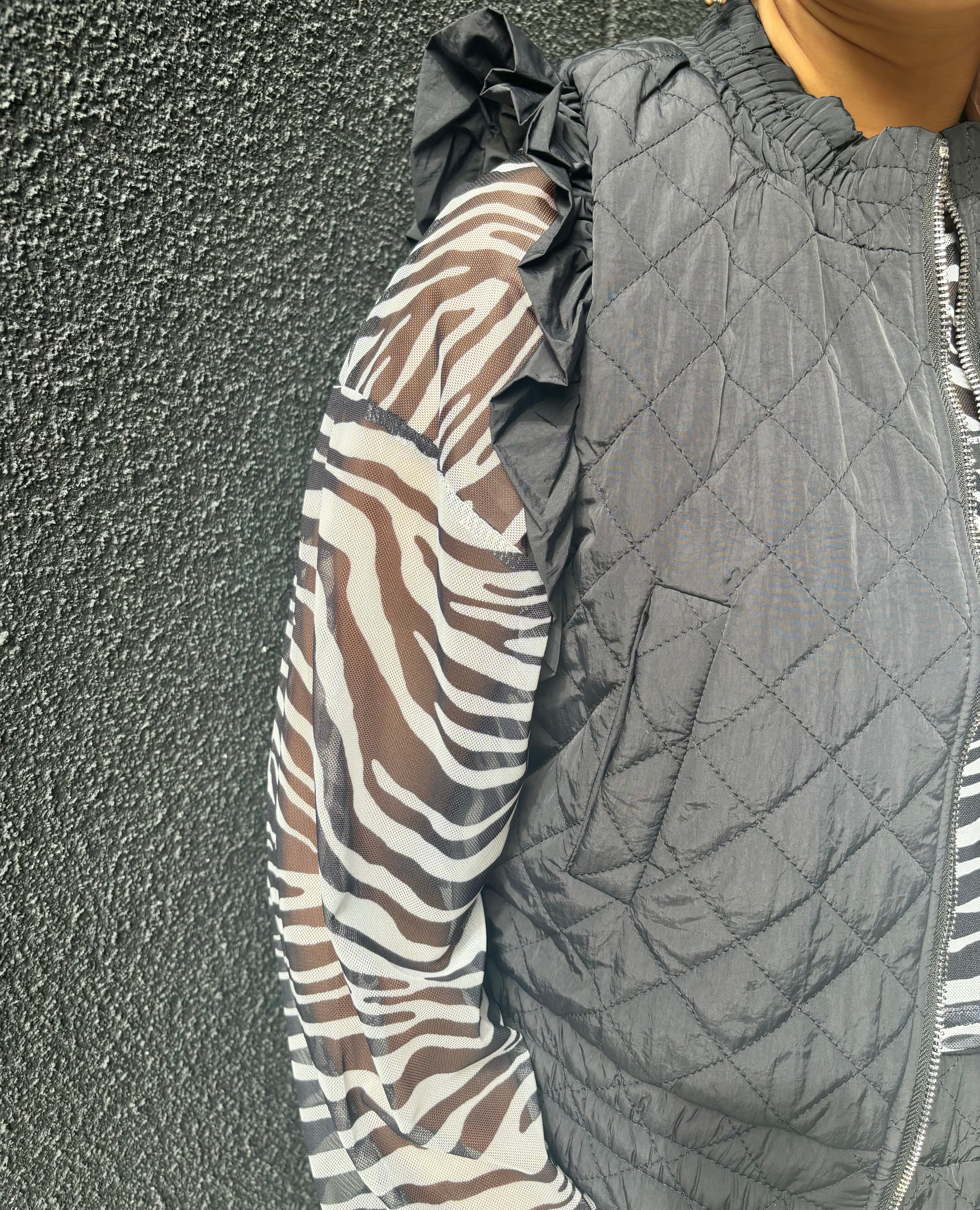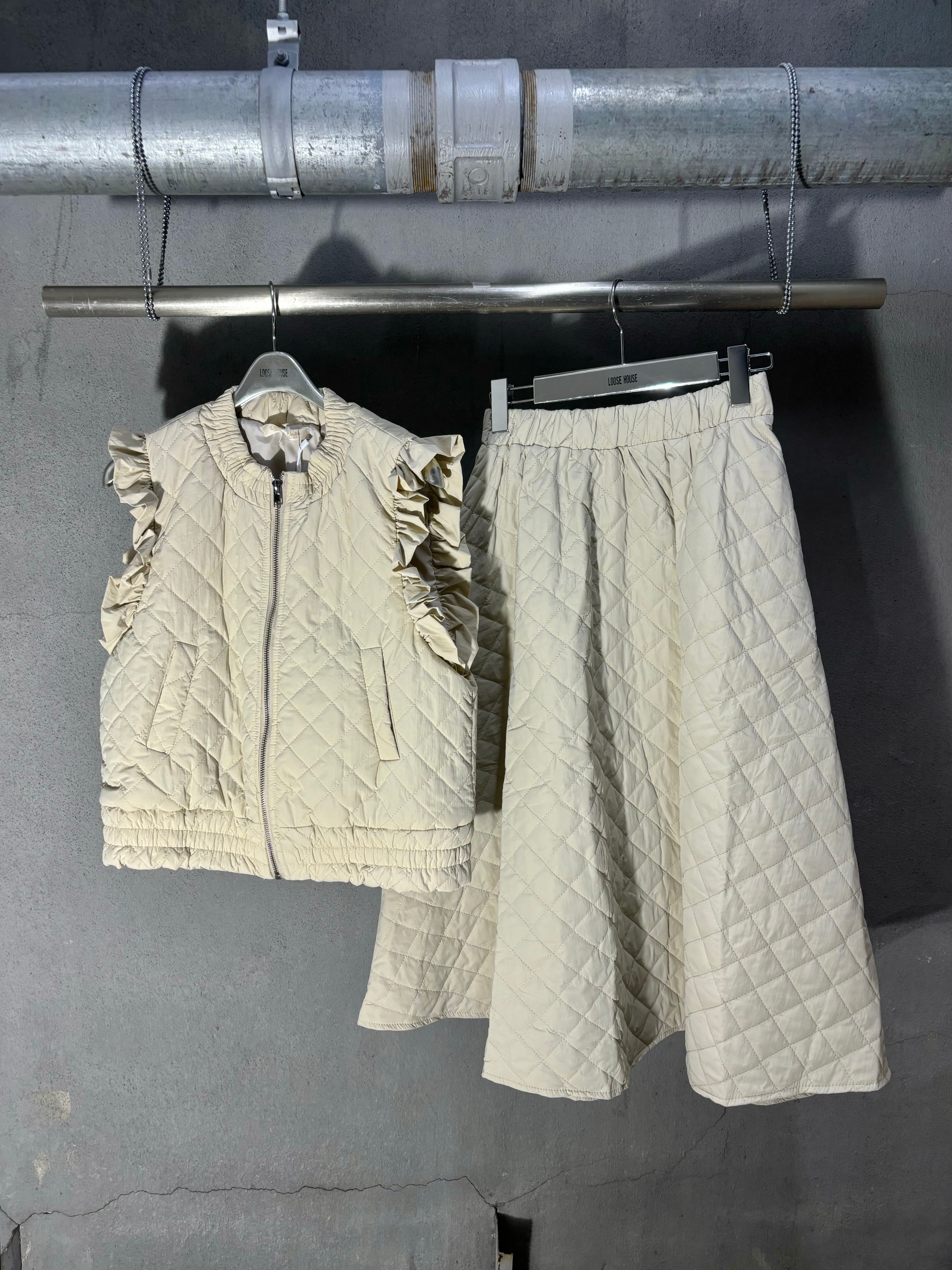 quilting frill vest × flare skirt 2P set up セットアップ 2点セット キルティング ベスト ジップアップ スカート フレアスカート ゴムウエスト