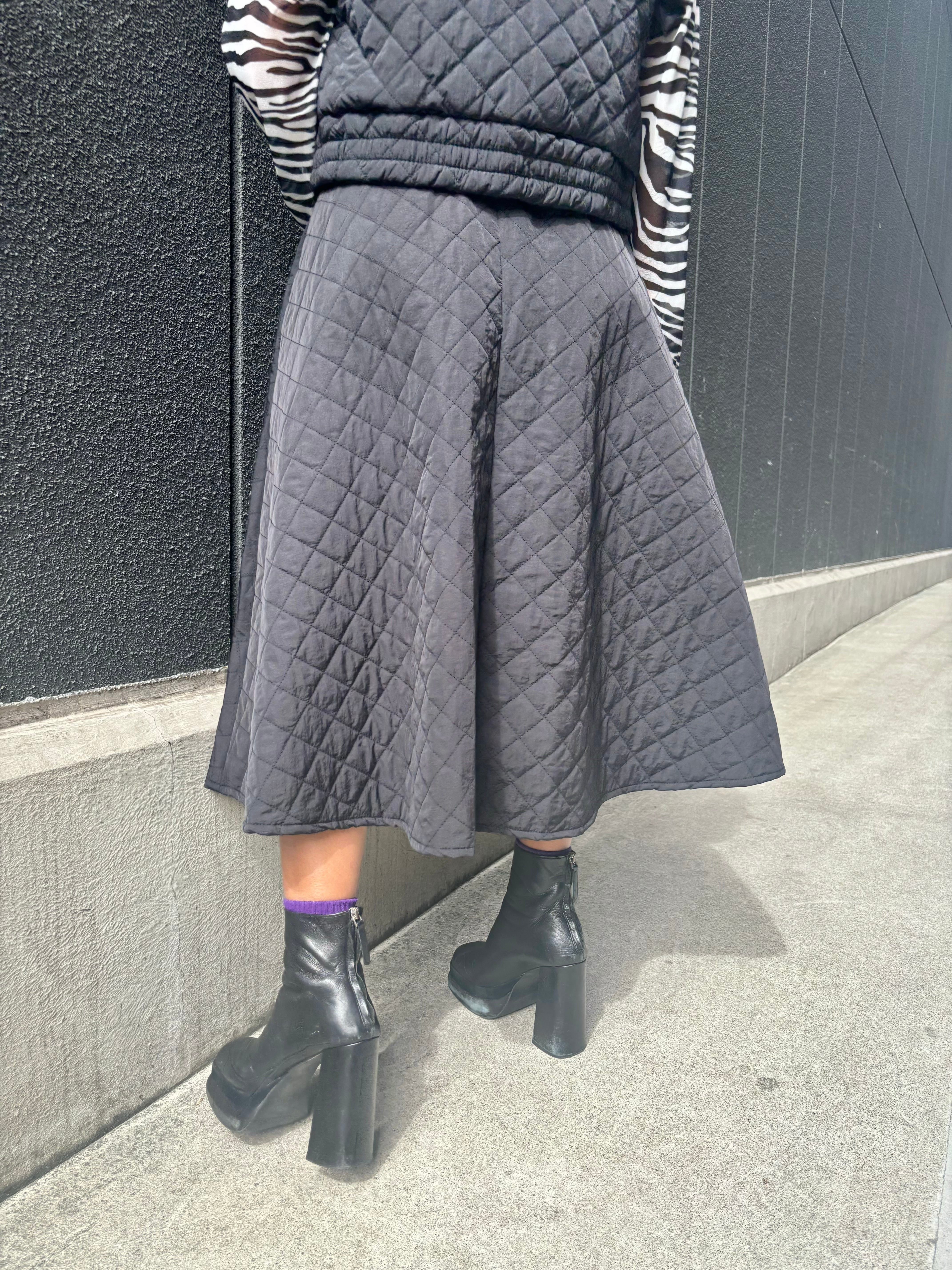 シンプルなデザインに、トレンドのキルティングが映えるベストとフレアスカートの2点セット♪