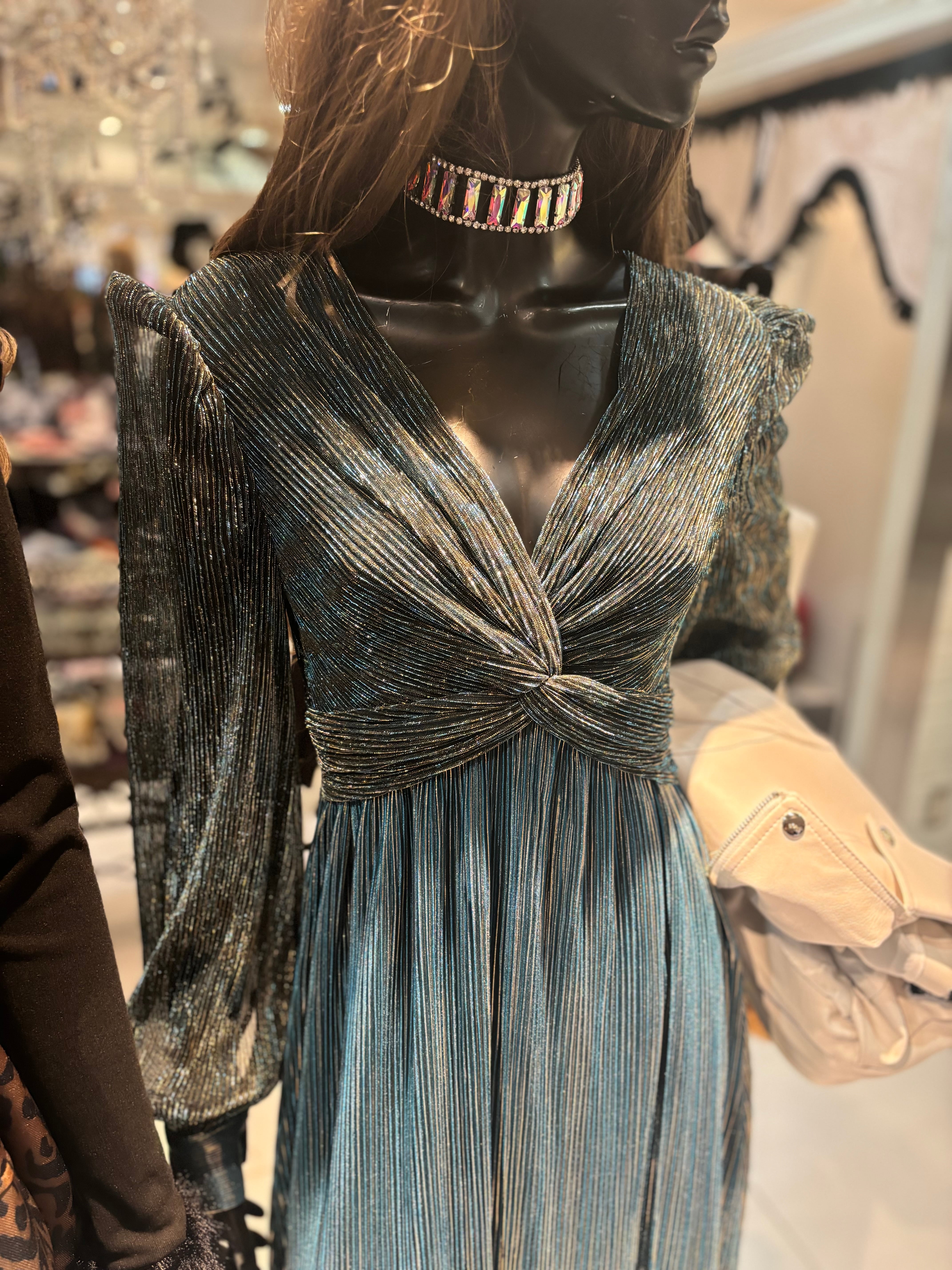 結婚式やパーティーなど特別なシーンにぴったりな一着で、動くたびに光を反射し存在感を引き立てます。プリーツデザインが美しいシルエットを作り、スタイルアップ効果も期待できるドレスです。