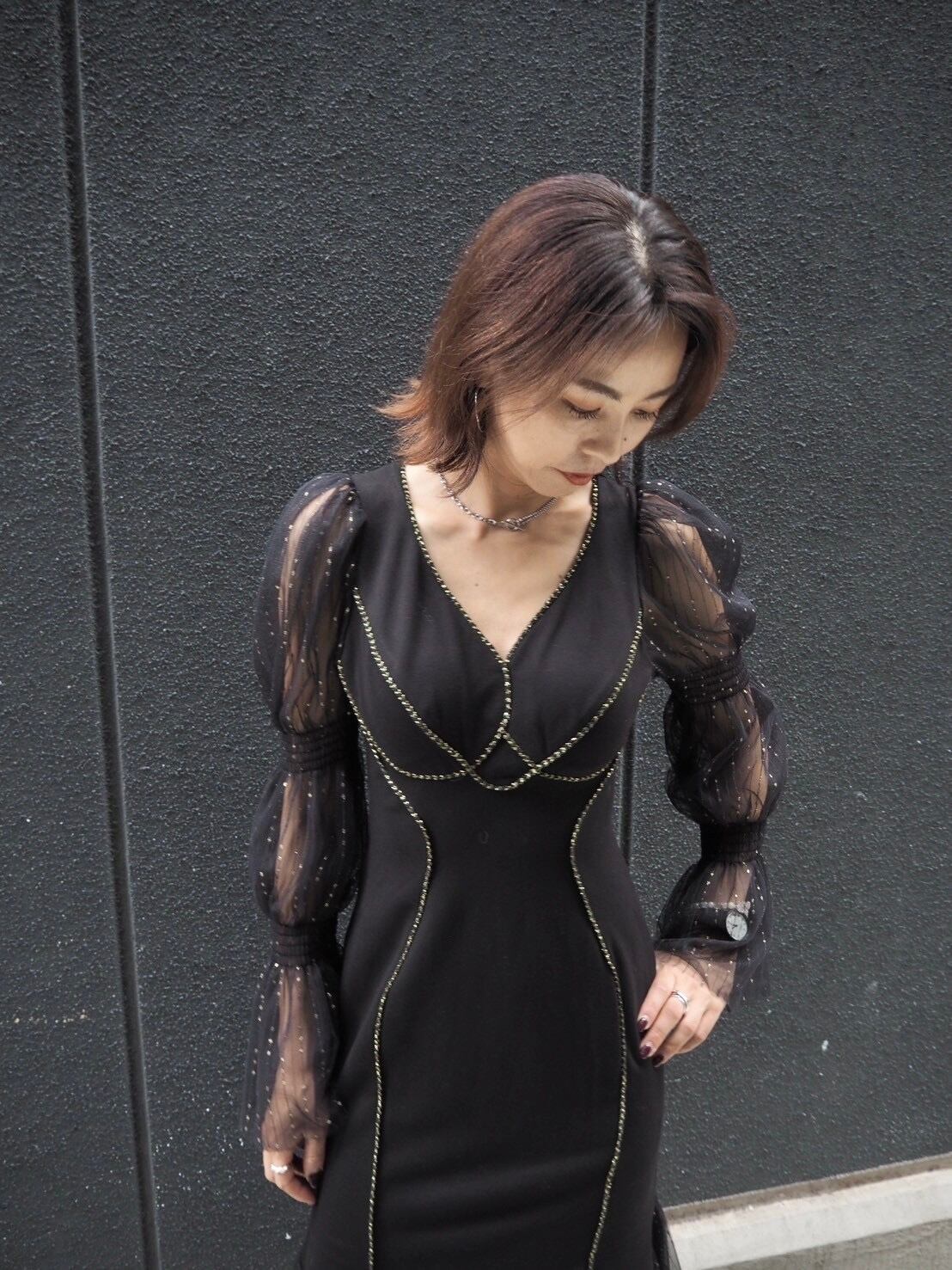 tulle change gold stitch tight one-piece ワンピース ワンピ ドレス タイト ストレッチ タイト チュール ブラック 黒 結婚式 二次会