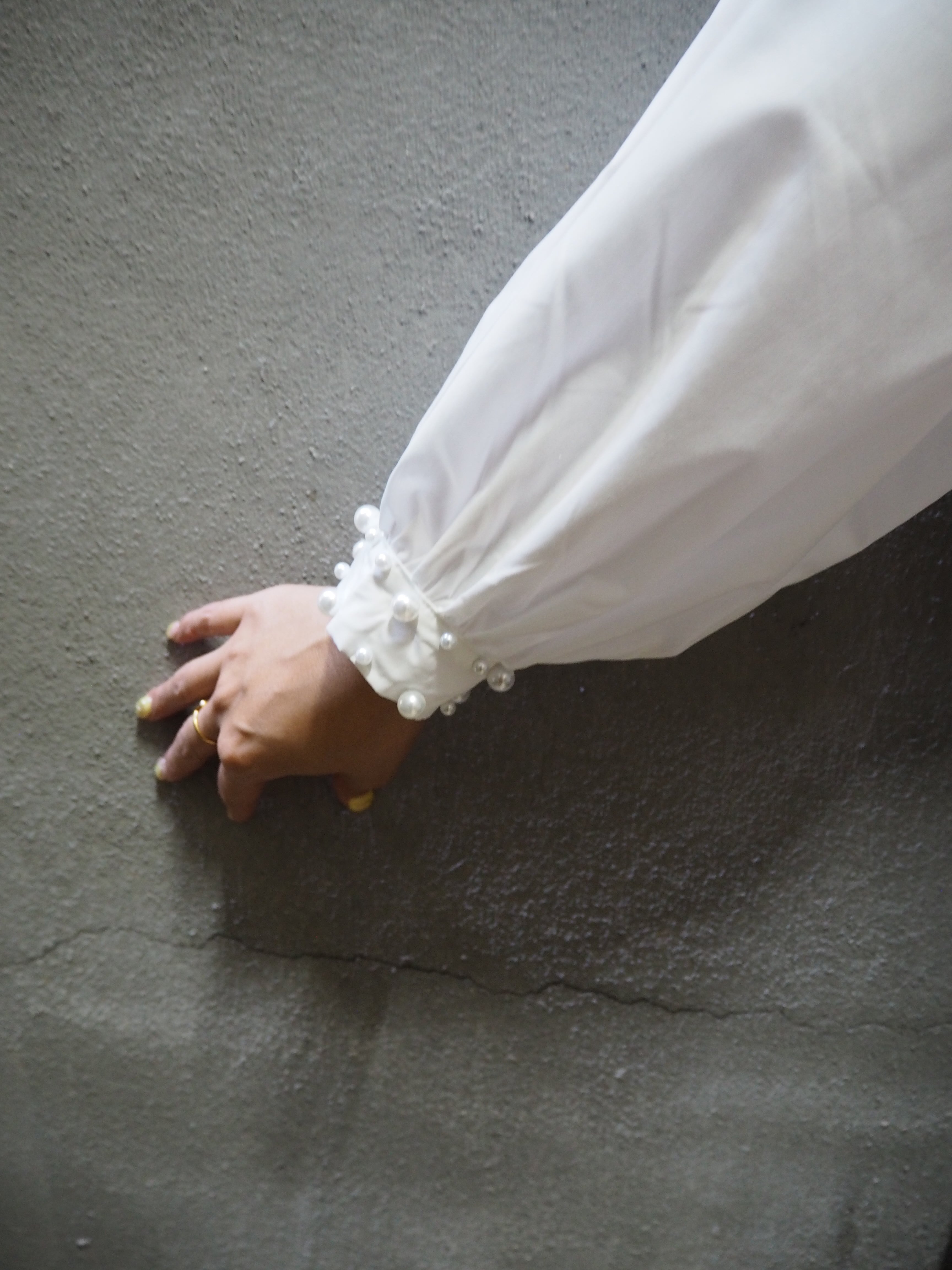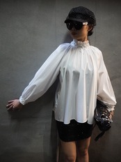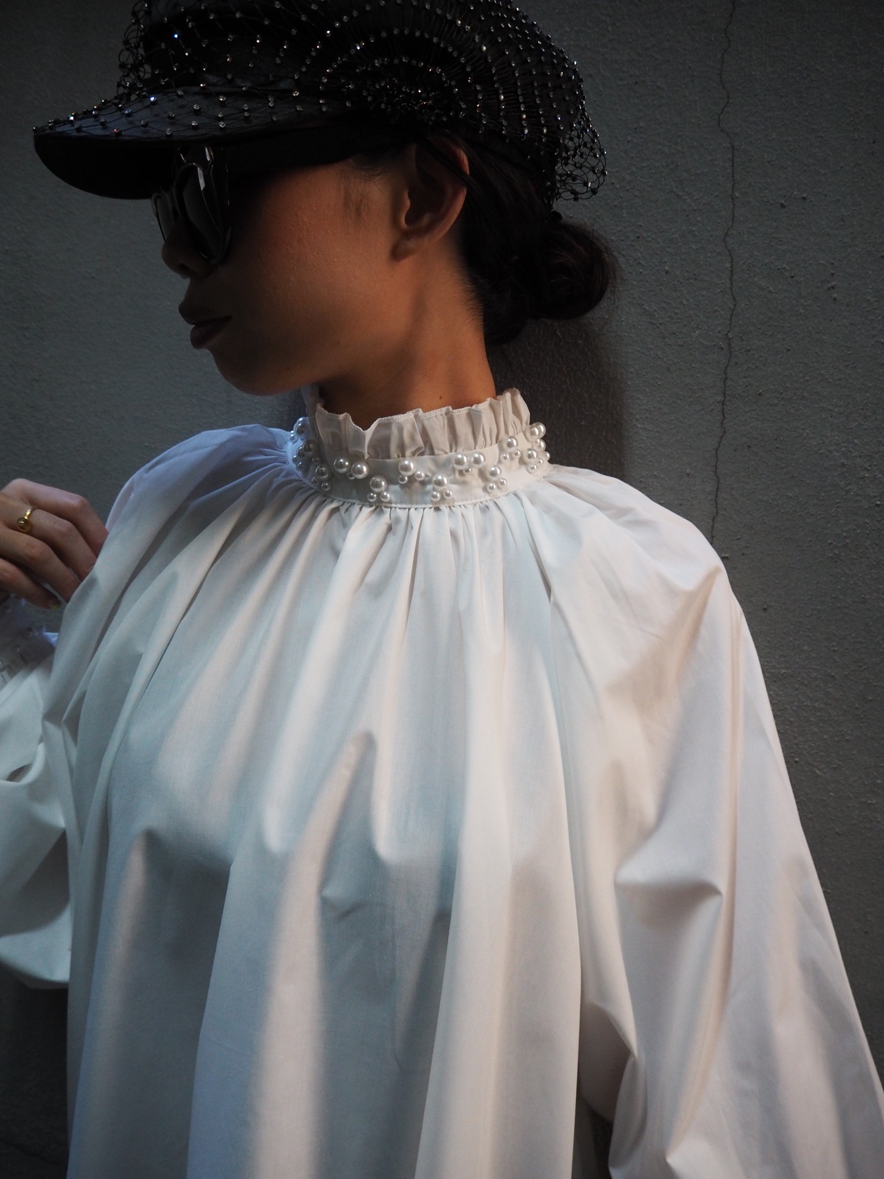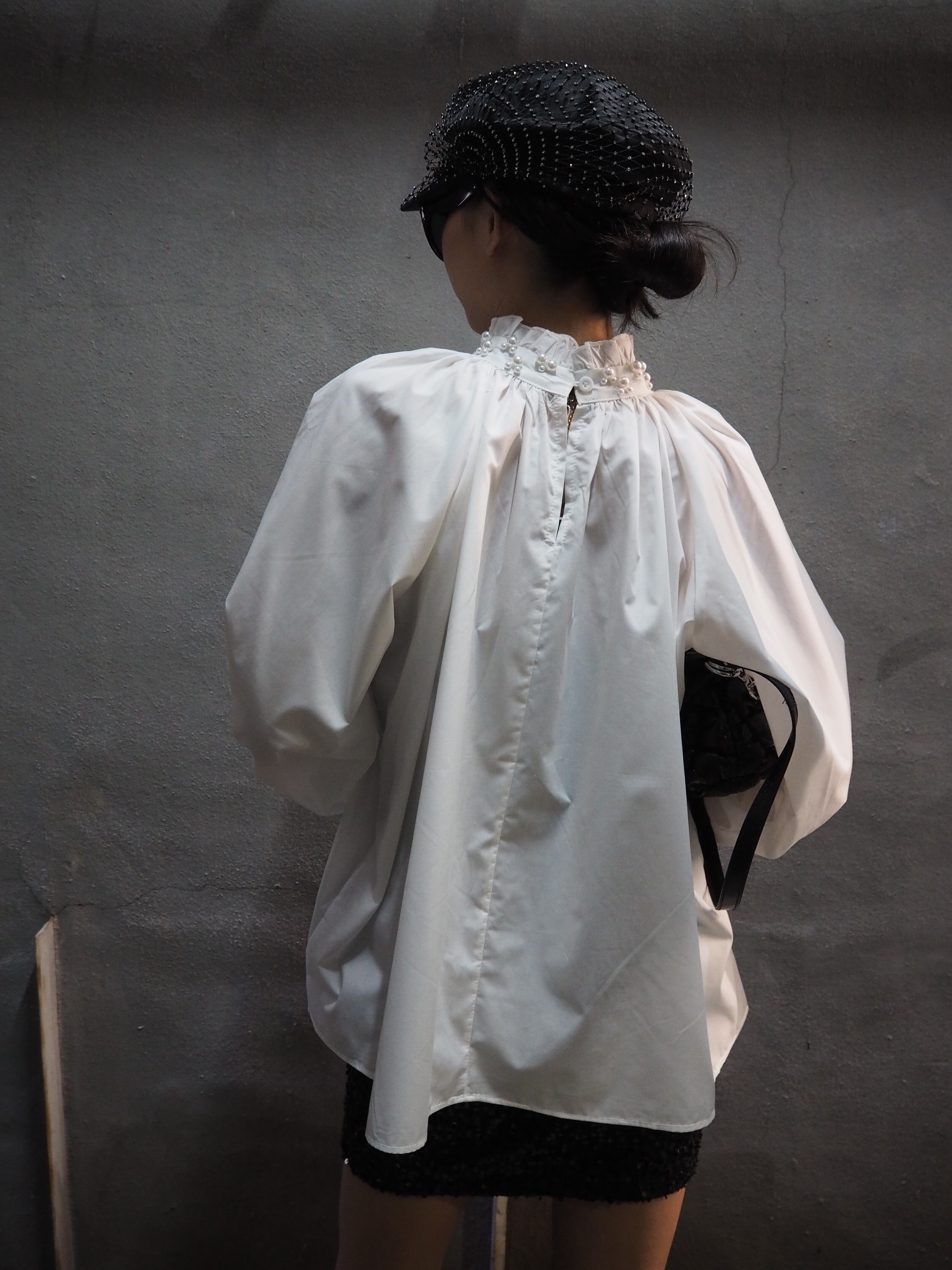 pearl neck design shirt シャツ ブラウス パール ボリューム ホワイト 布帛