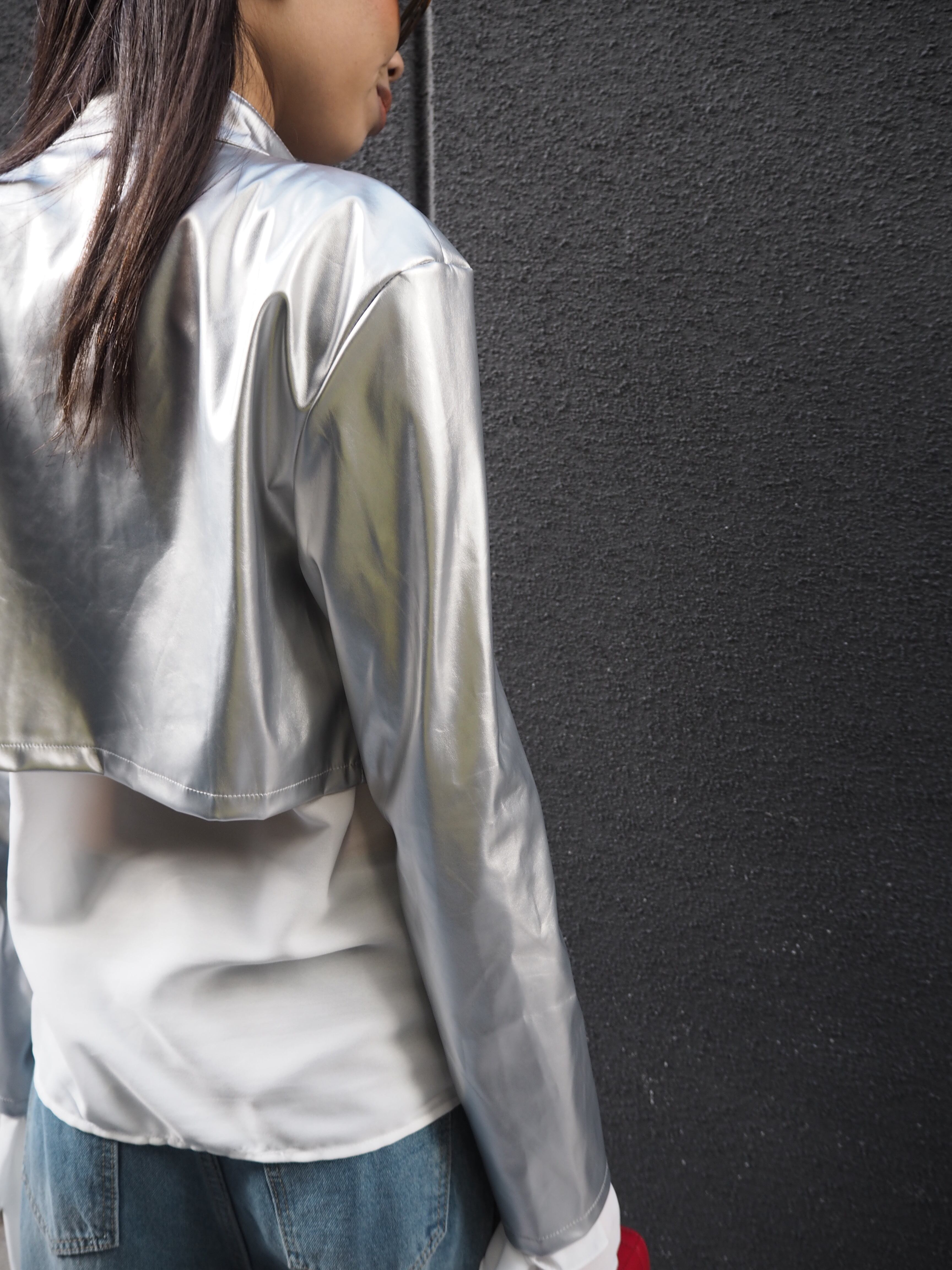 eco leather silver short jacket ジャケット ショート丈 メタリック シルバー 合皮 エコレザー フェイクレザー