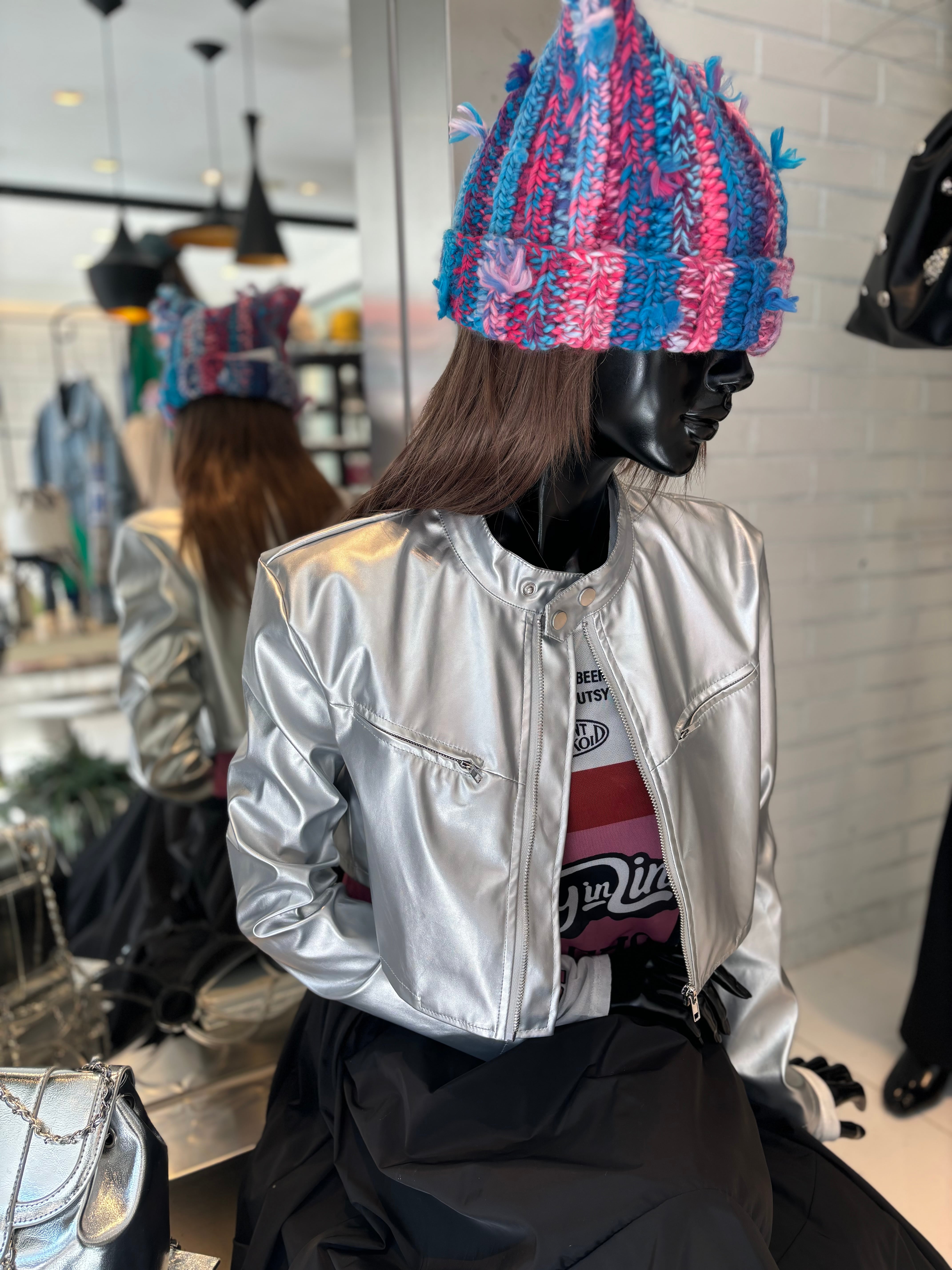 スタイリッシュなショート丈のメタリックシルバーエコレザージャケット!
